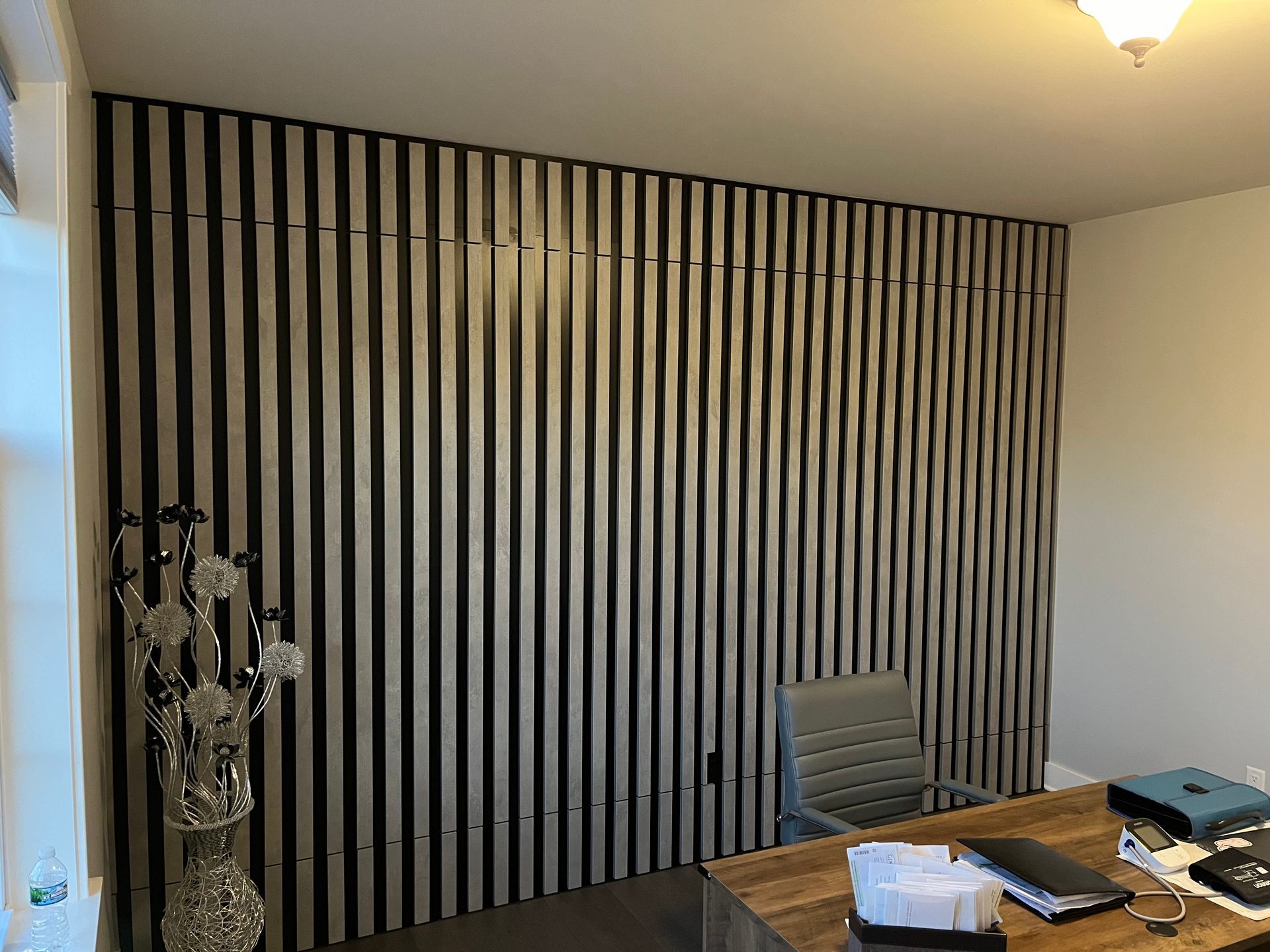 All pre finished melamine to look like concrete. Simple but effective aesthetic for the space. Customer loved how the light reflected off the slats.