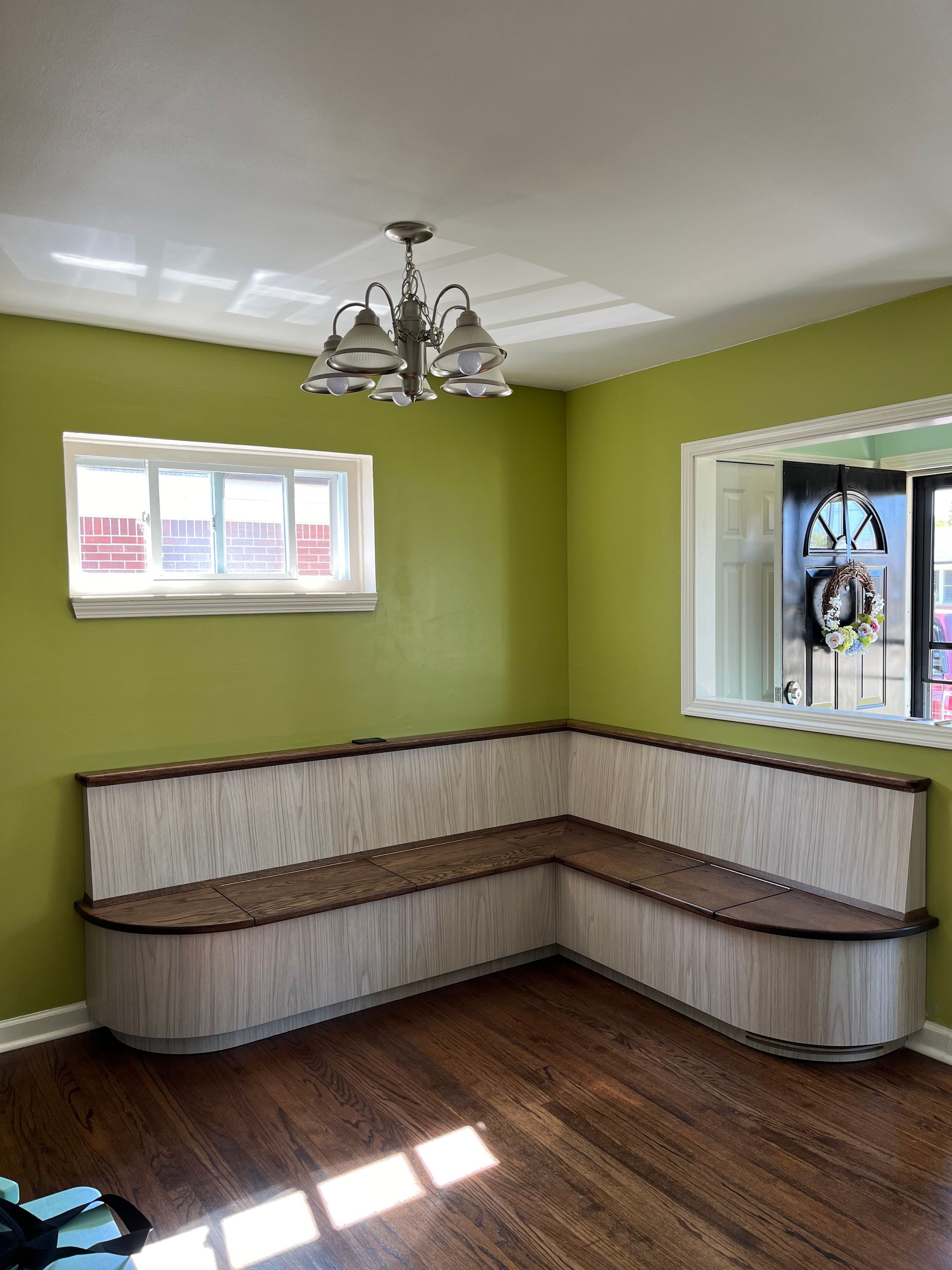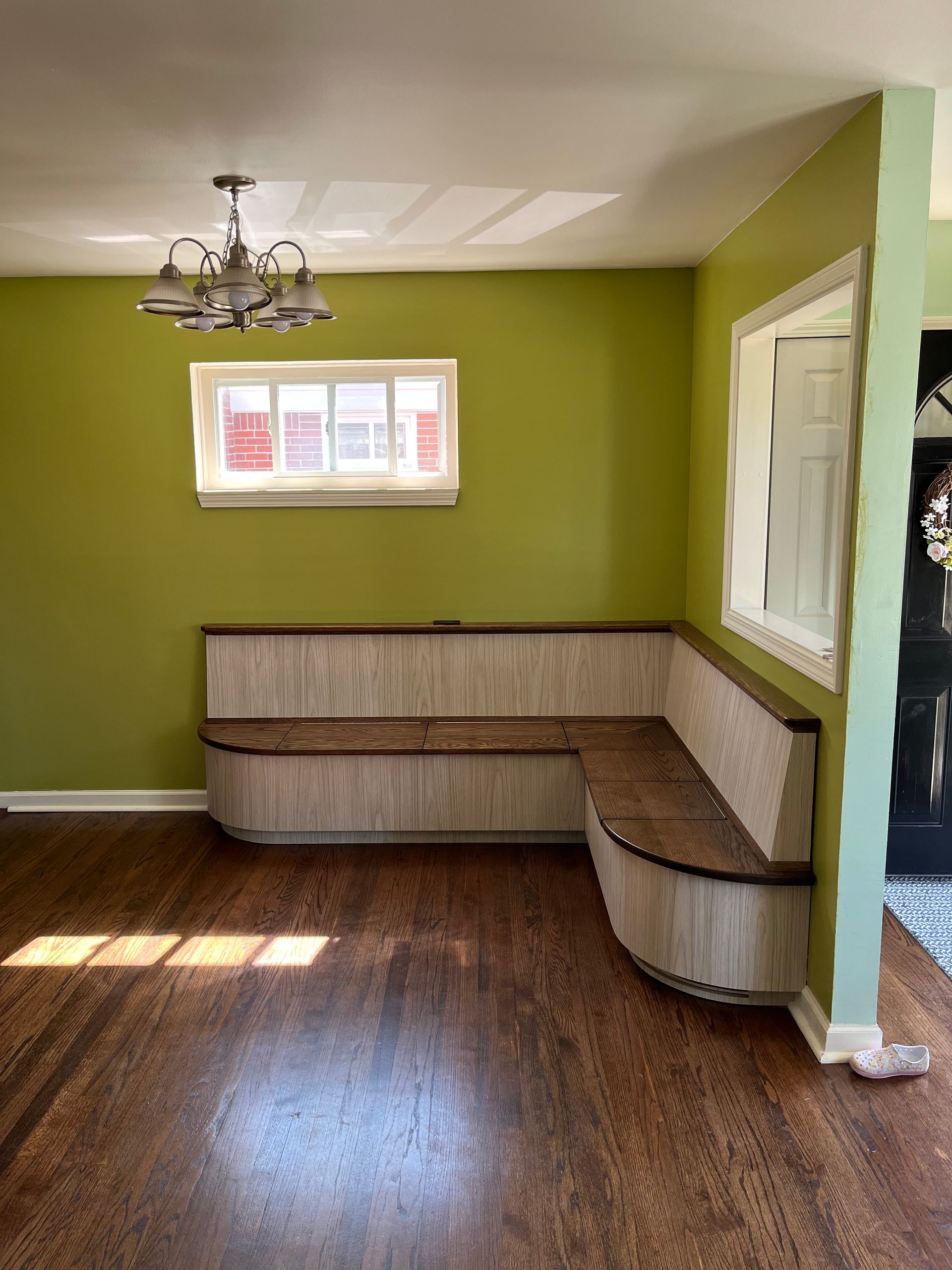 Made from pre finished melamine with red oak bench tops/cap. Integrated electrical outlet on the top for phone charging, etc... Pre stained and clear coated at the shop before install. Slow closing bench tops to avoid any smashed fingers. Don't mind the wall color LOL, not my choice.