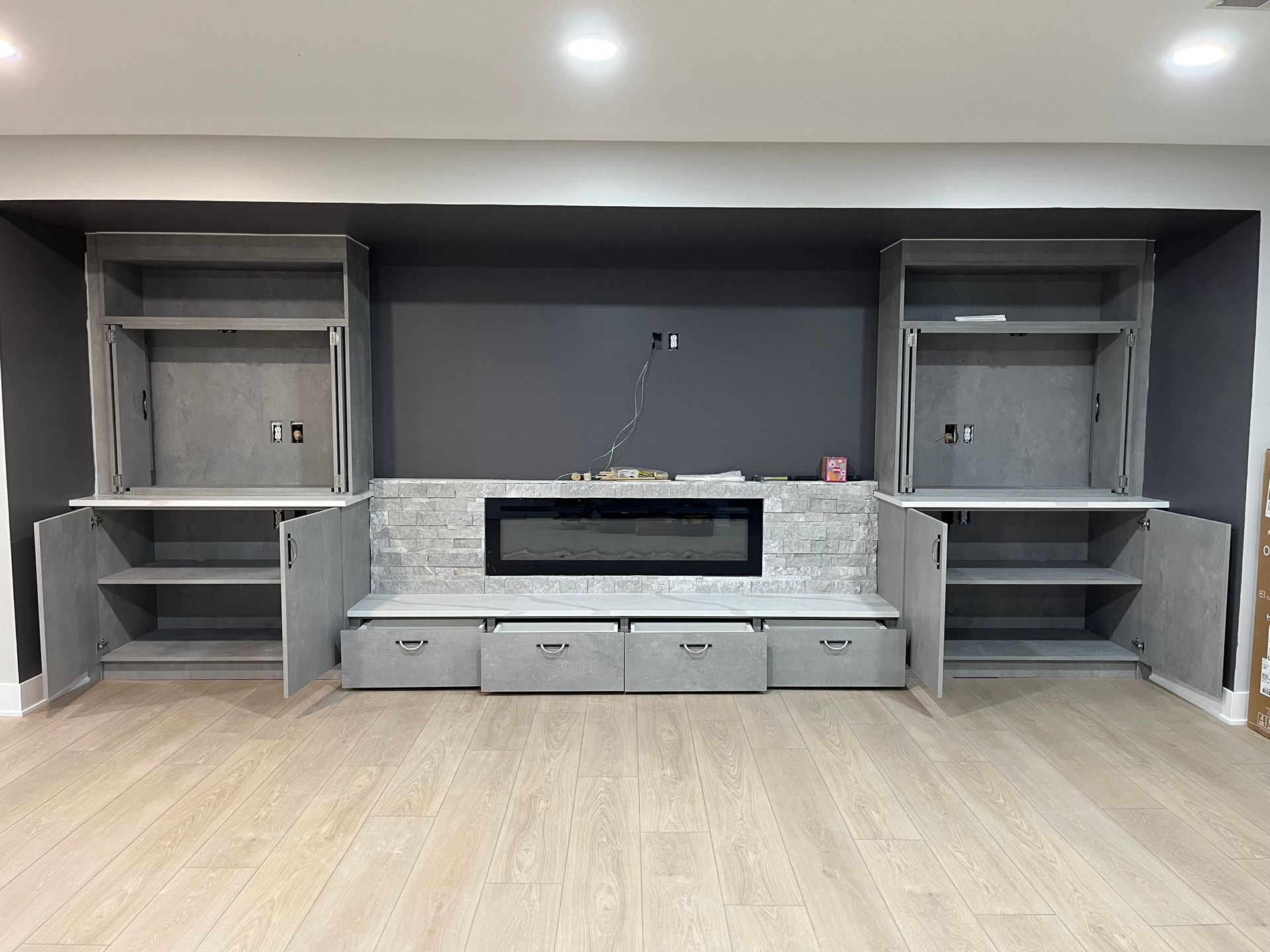 This is the same basement remodel as the Modern Basement Kitchen. The cabinets have a multi action swinging, folding, and sliding doors. They can be slid into the cabinets after opening to accommodate watching a TV that is inside the cabinet. Pretty neat project, again all made from pre finished melamine with custom hardware, etc...