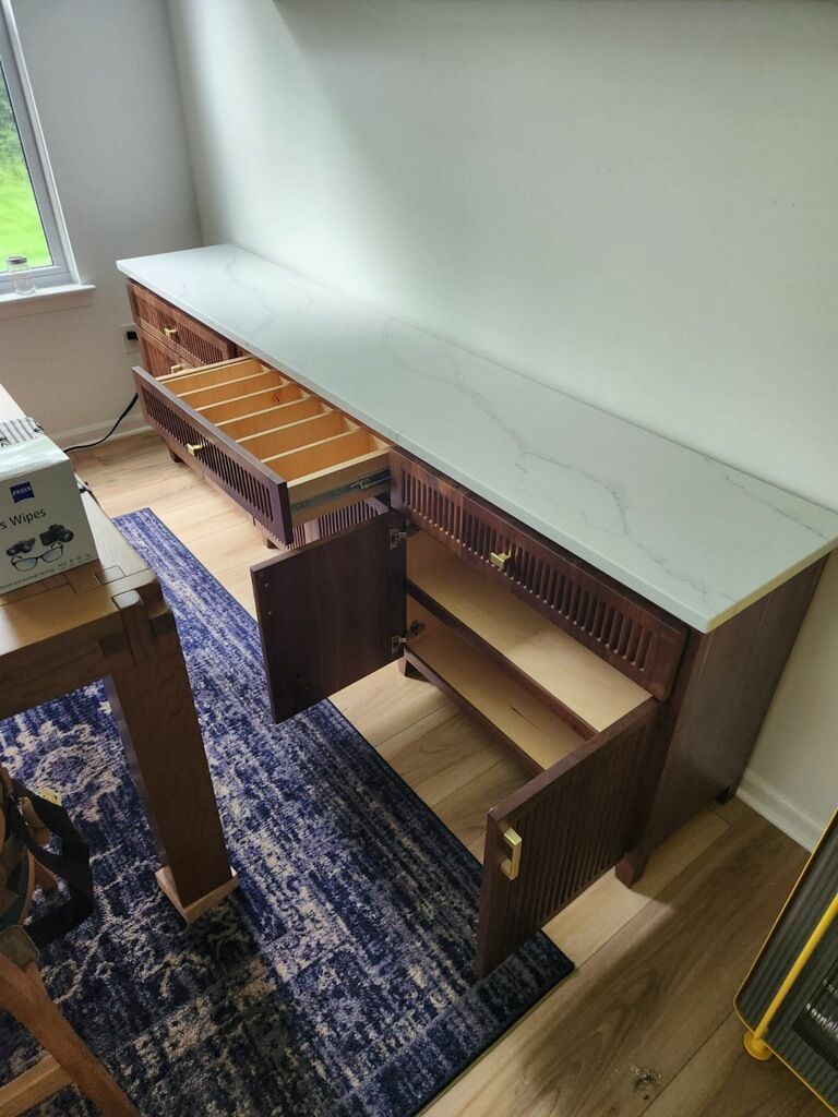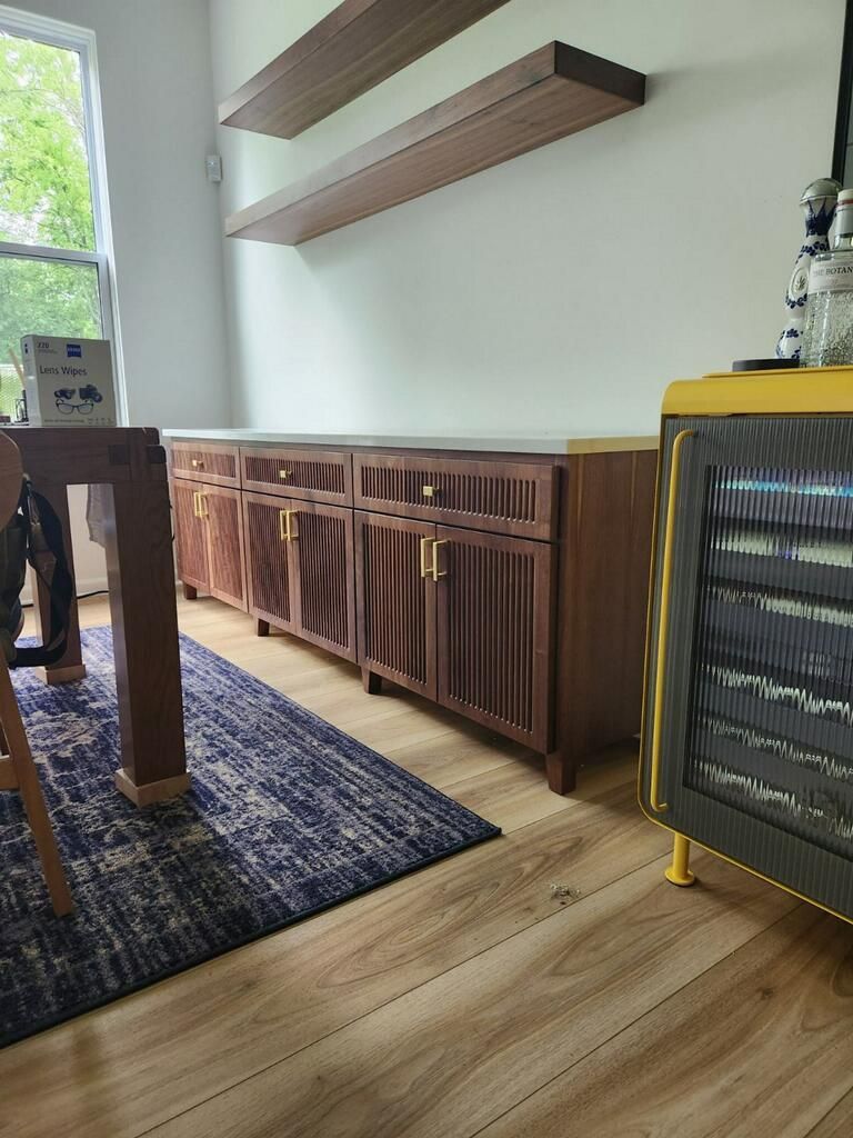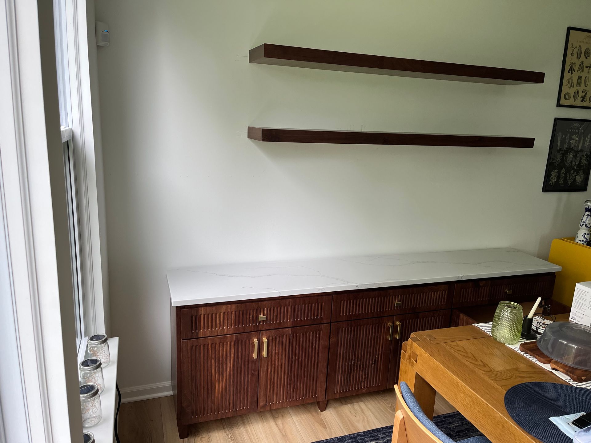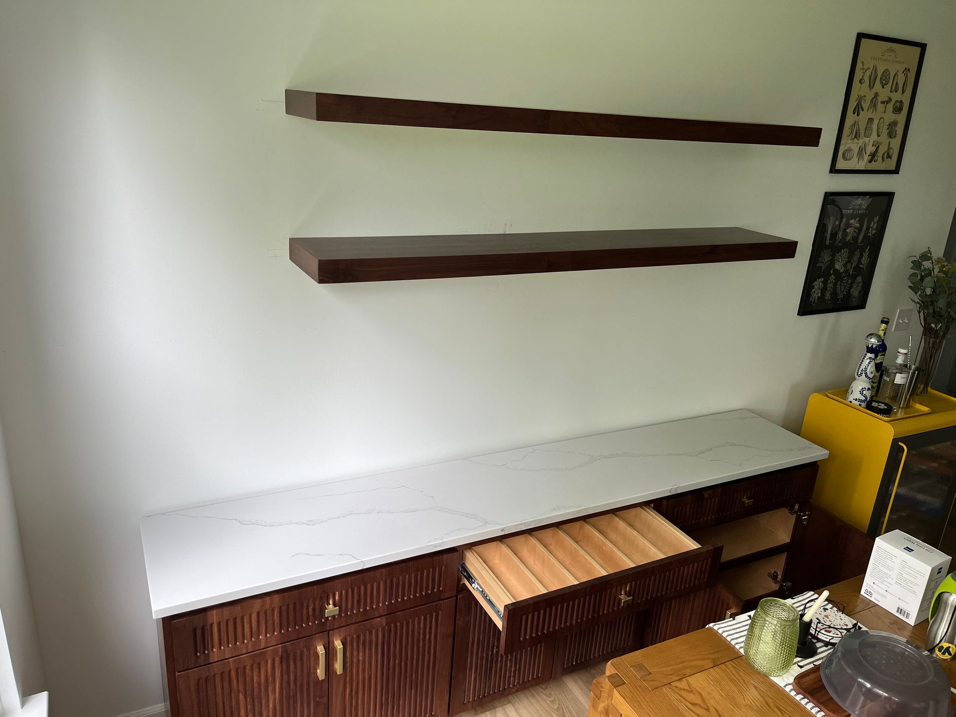 TheWalnut Side Board with Floating Shelves and Quartz Countertop