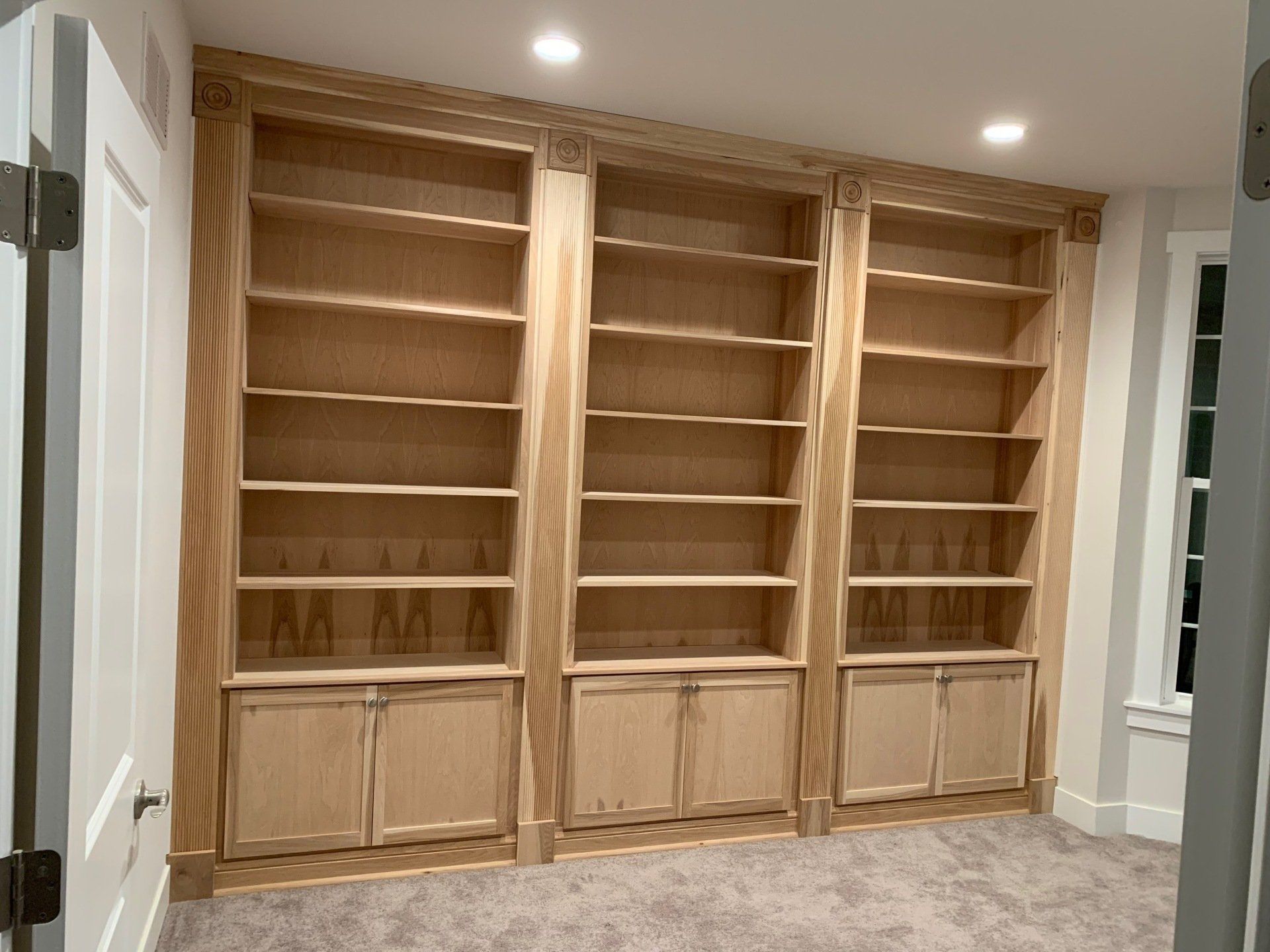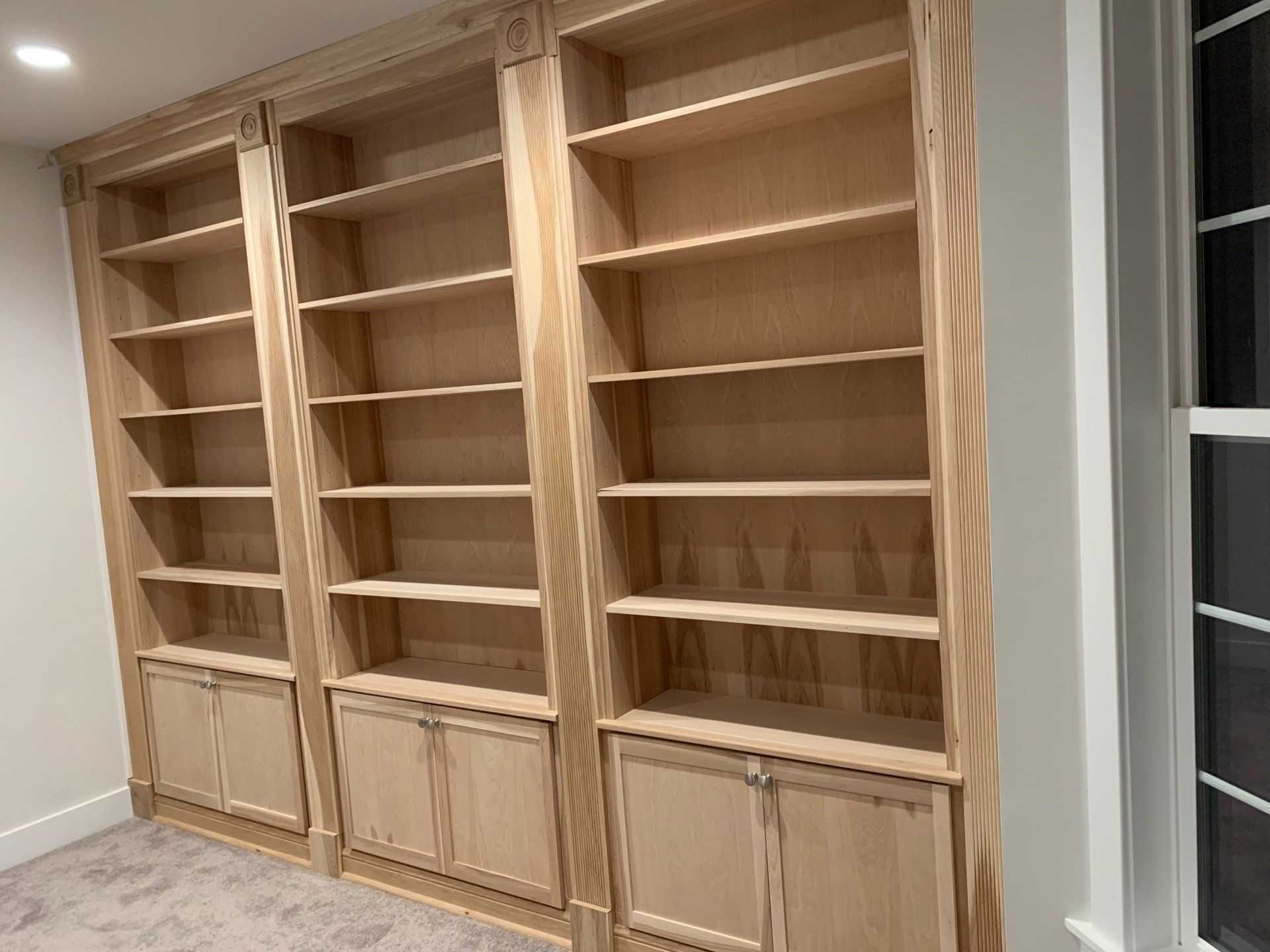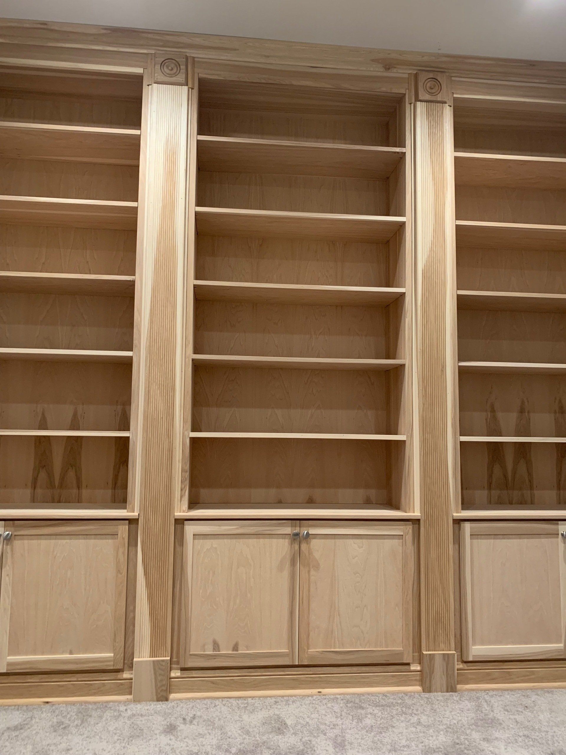 This build started with a picture from the customer. They wanted a very traditional stain grade floor to ceiling library. We ended up using hardwood hickory because they had previously owned hickory pieces and really loved the grain and color. It ended up being stained in "gunstock" and is just beautiful.