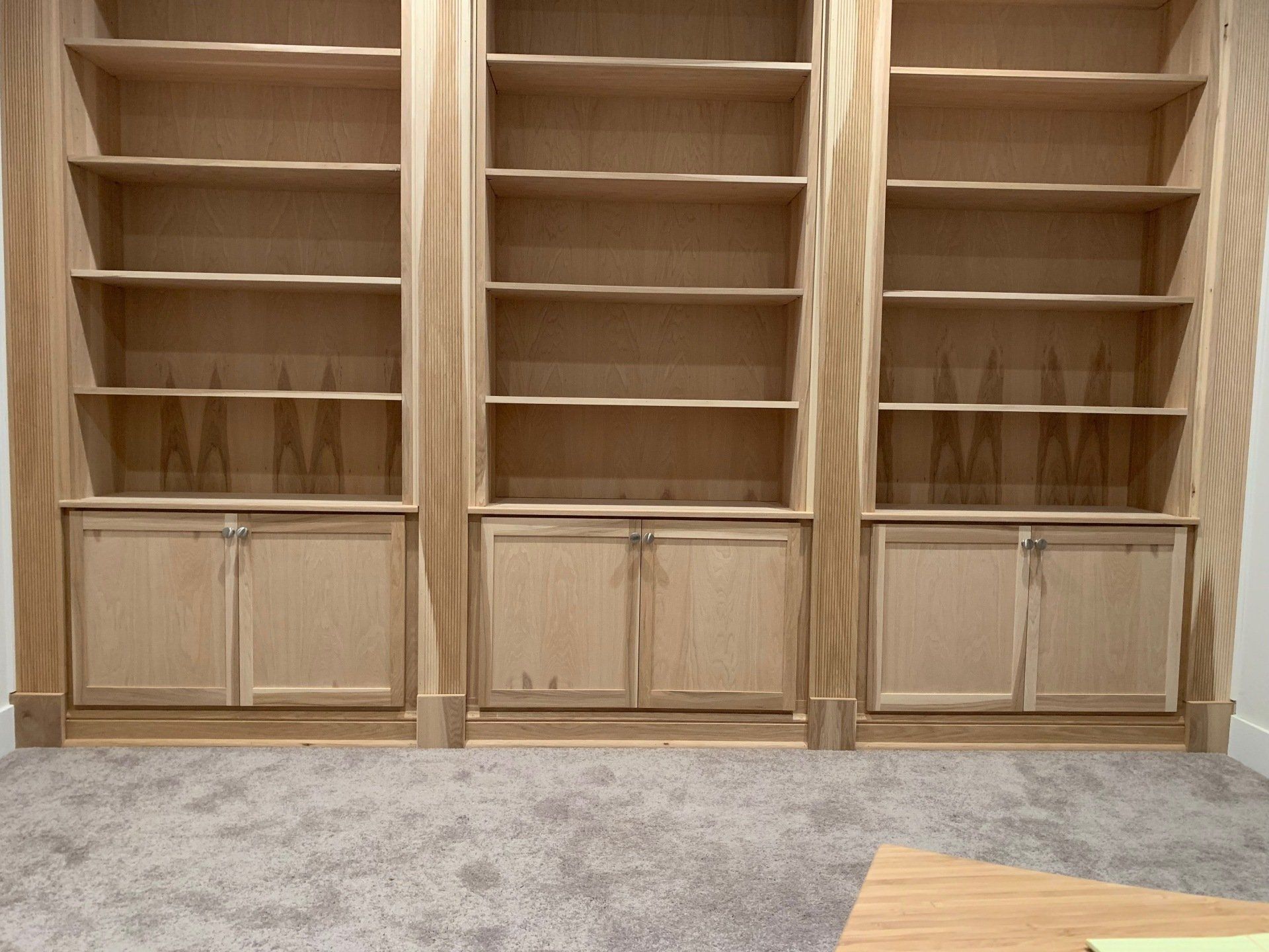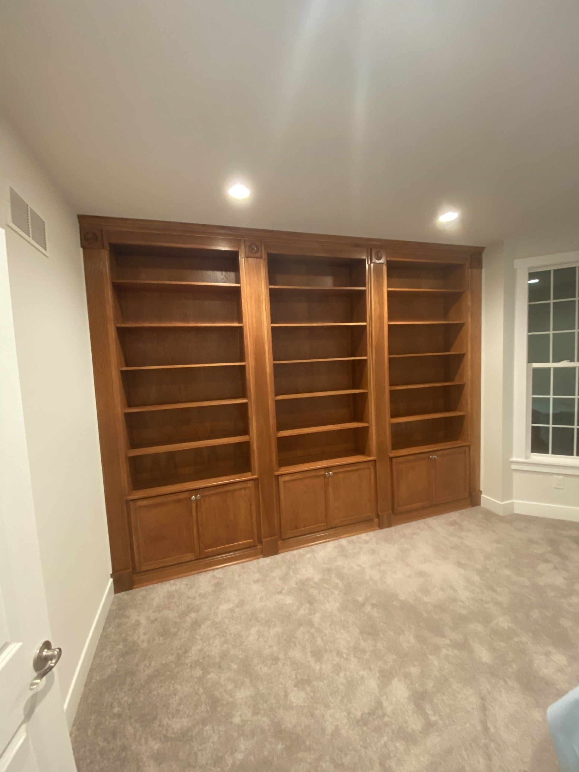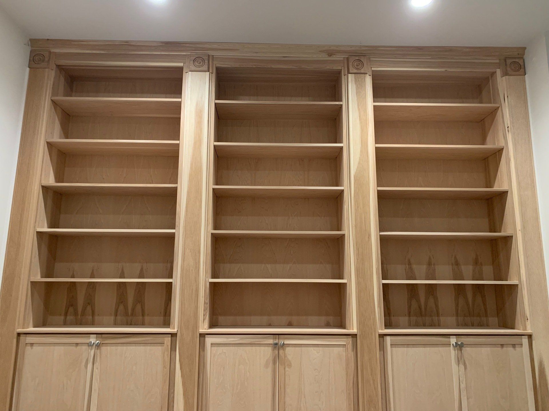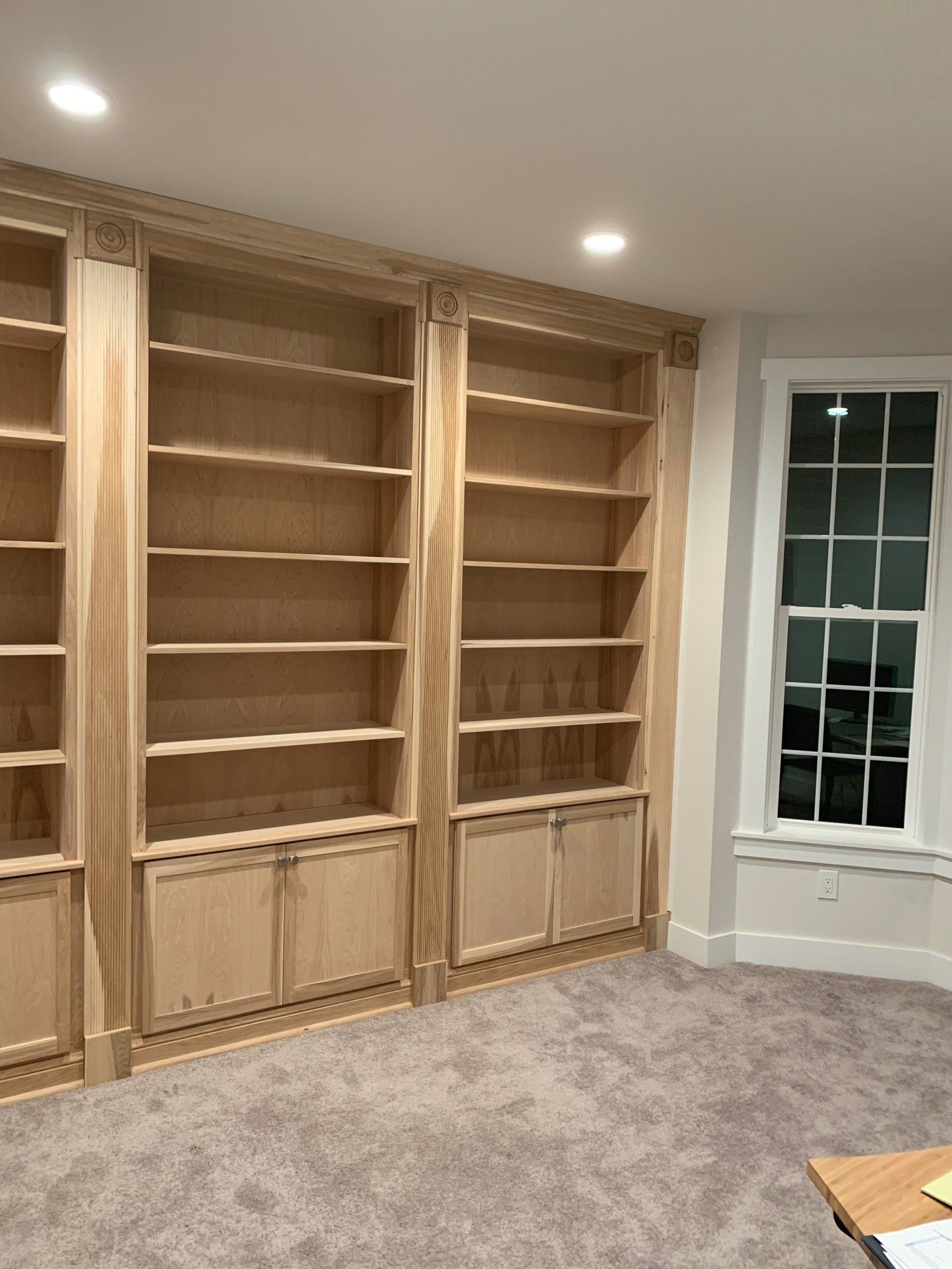 This build started with a picture from the customer. They wanted a very traditional stain grade floor to ceiling library. We ended up using hardwood hickory because they had previously owned hickory pieces and really loved the grain and color. It ended up being stained in "gunstock" and is just beautiful.