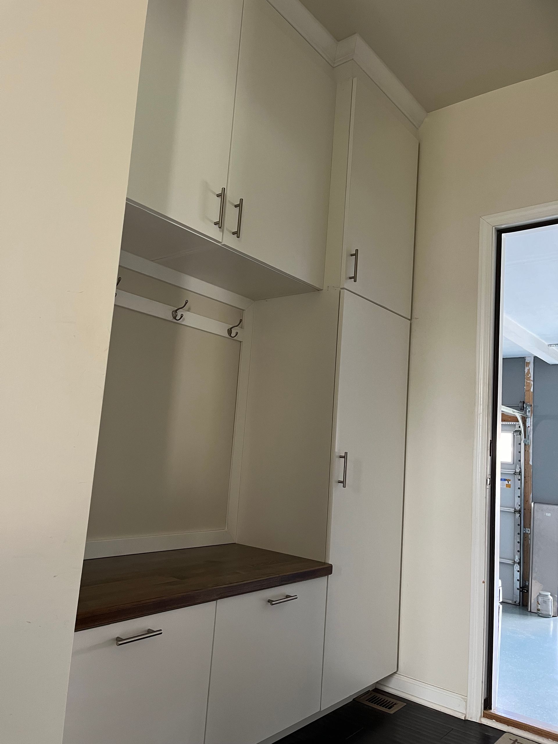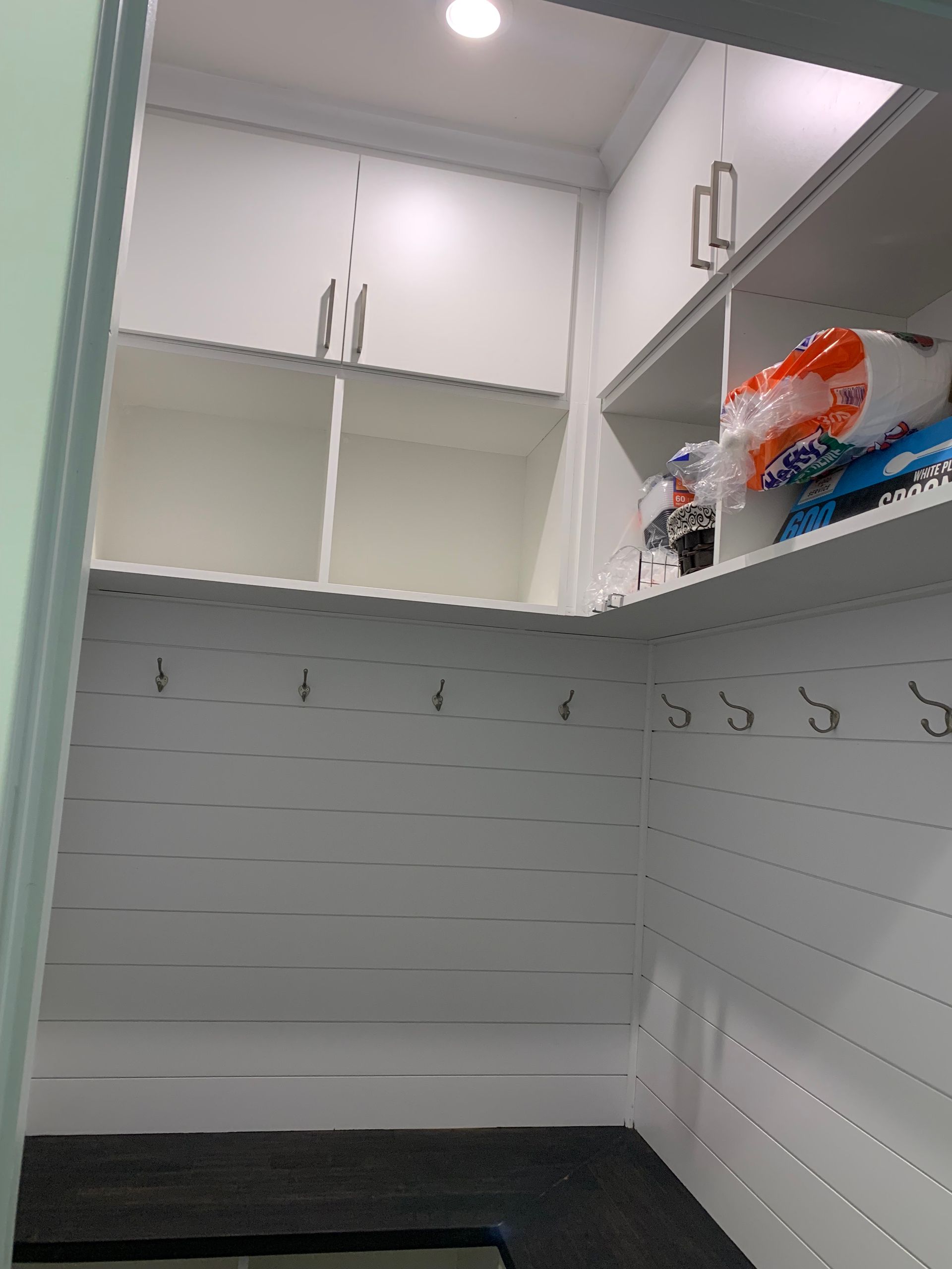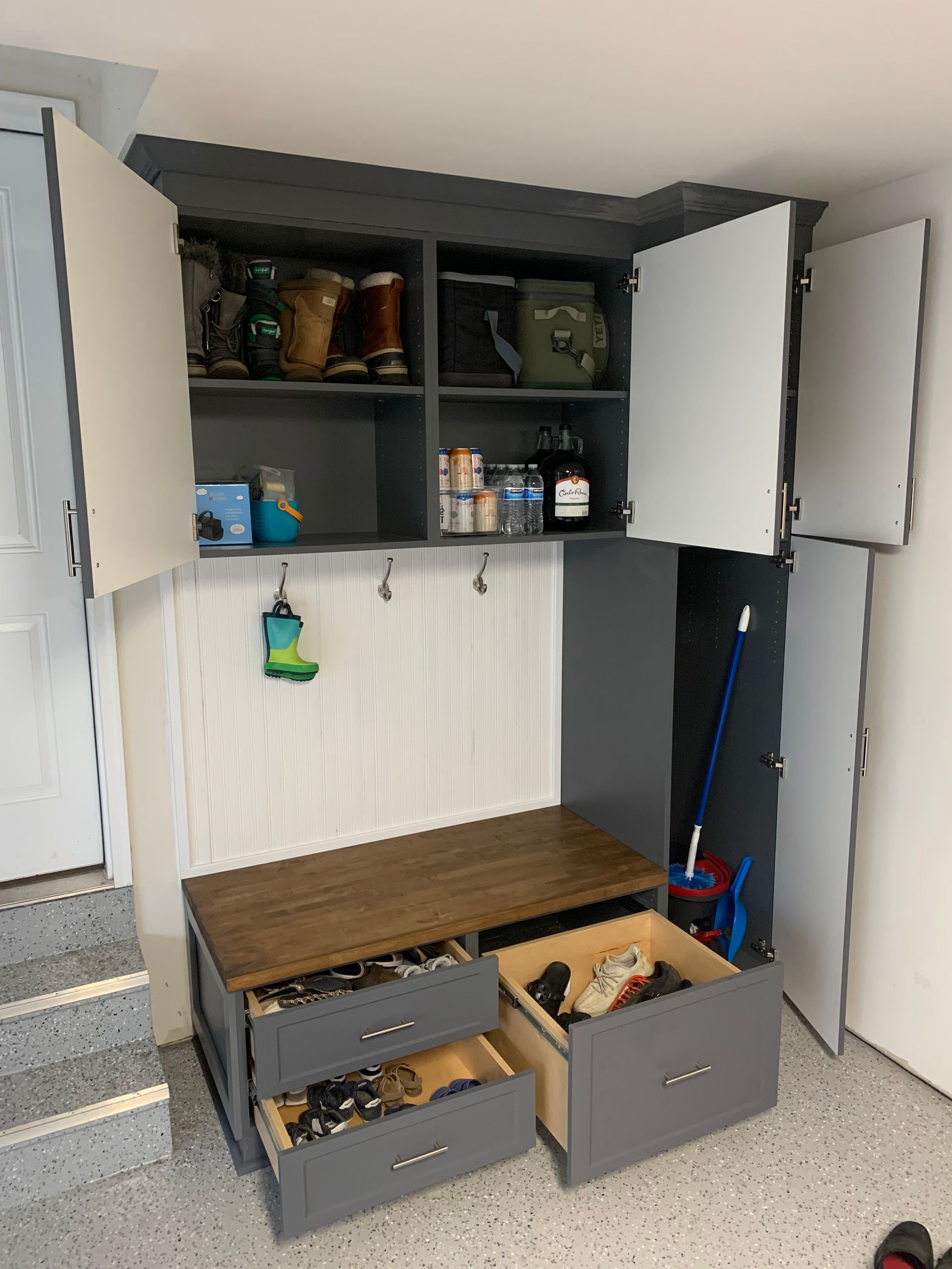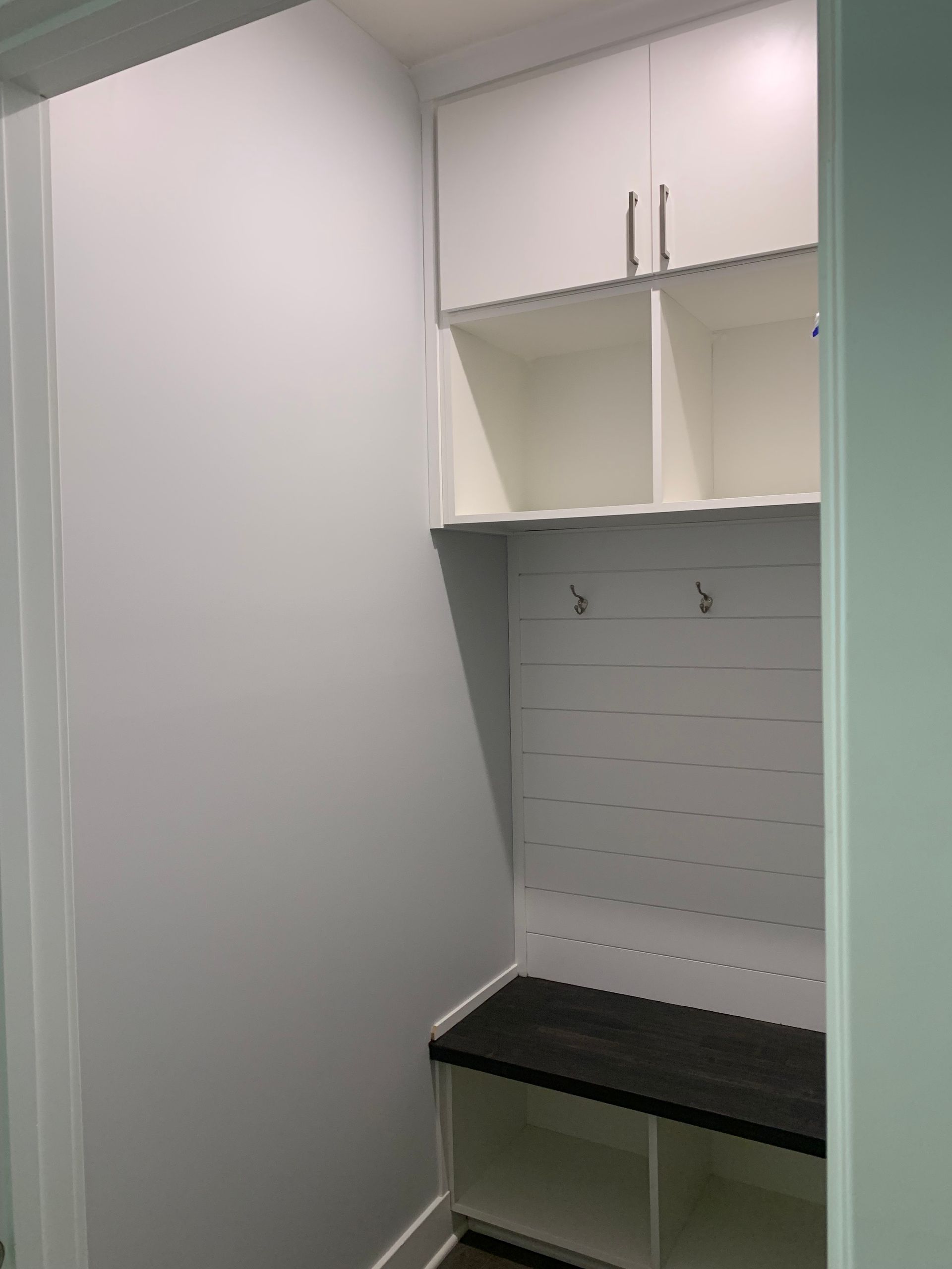 Since moving into a larger shop with access to large format machinery and pre-finished melamine materials, I've been designing and building quite a few mudroom benches with various closets, shelves, cabinets, trim, etc... These are some examples of what I've done. It's an easy and inexpensive way to really change the look and organization of a space!