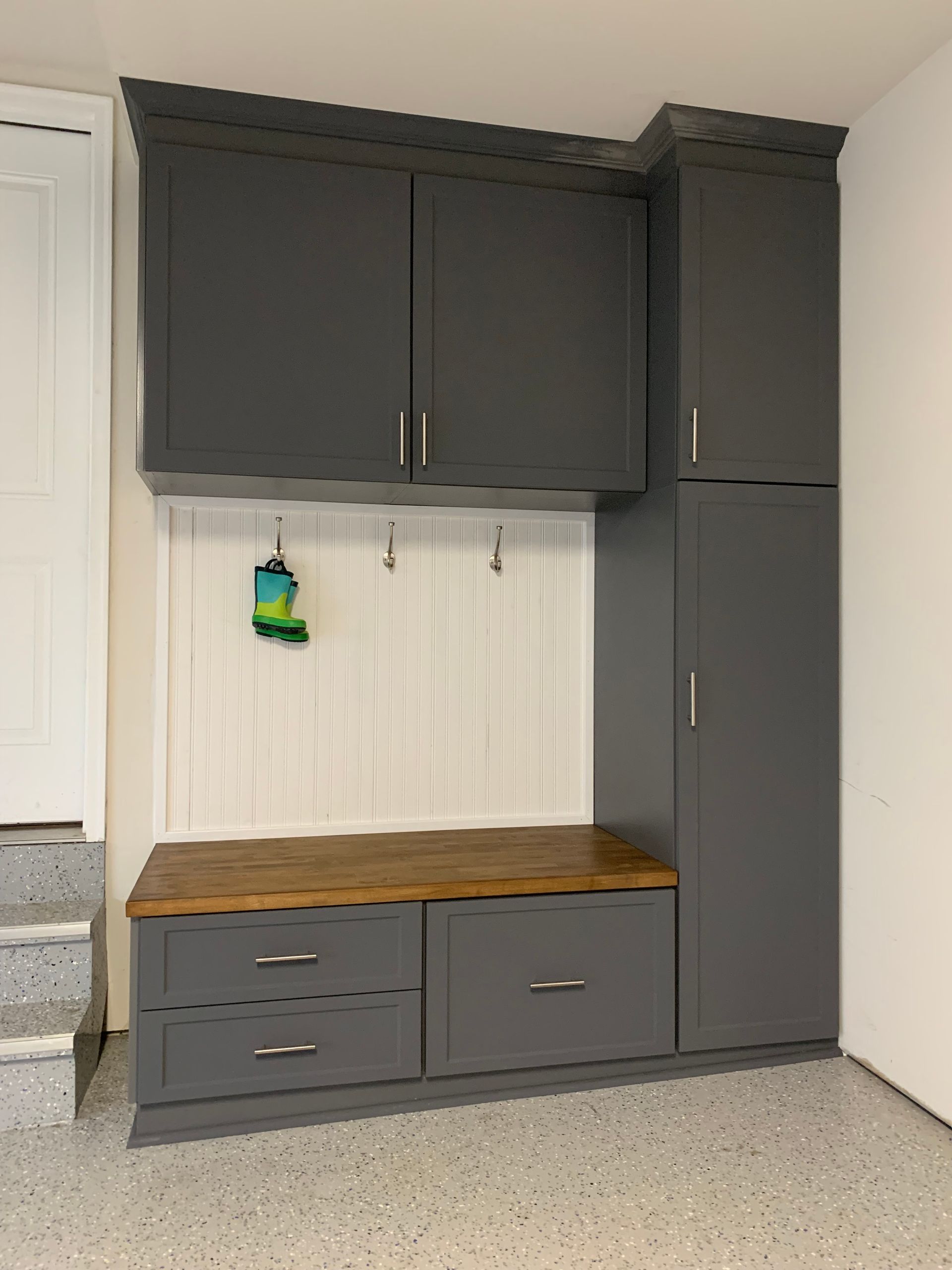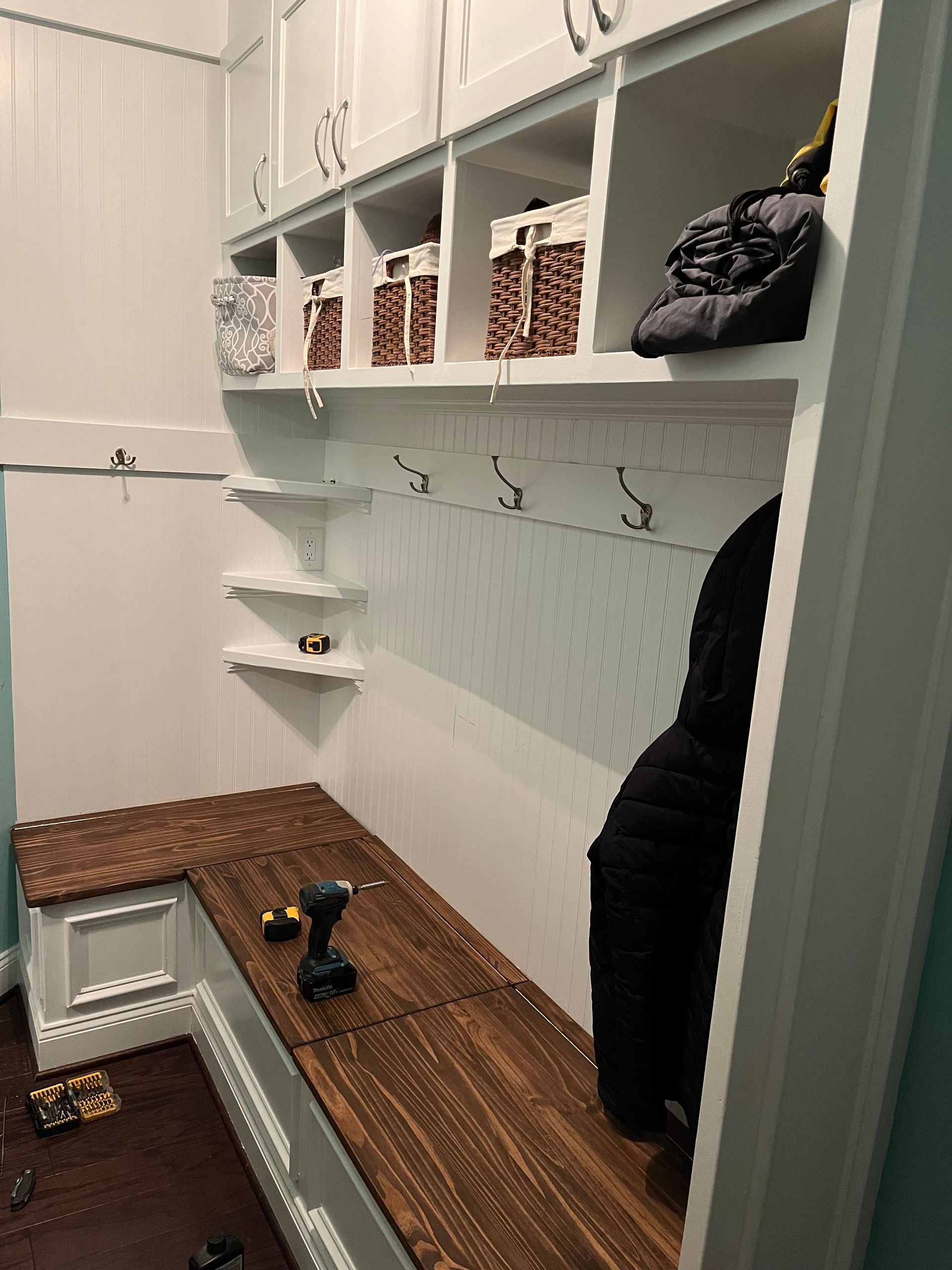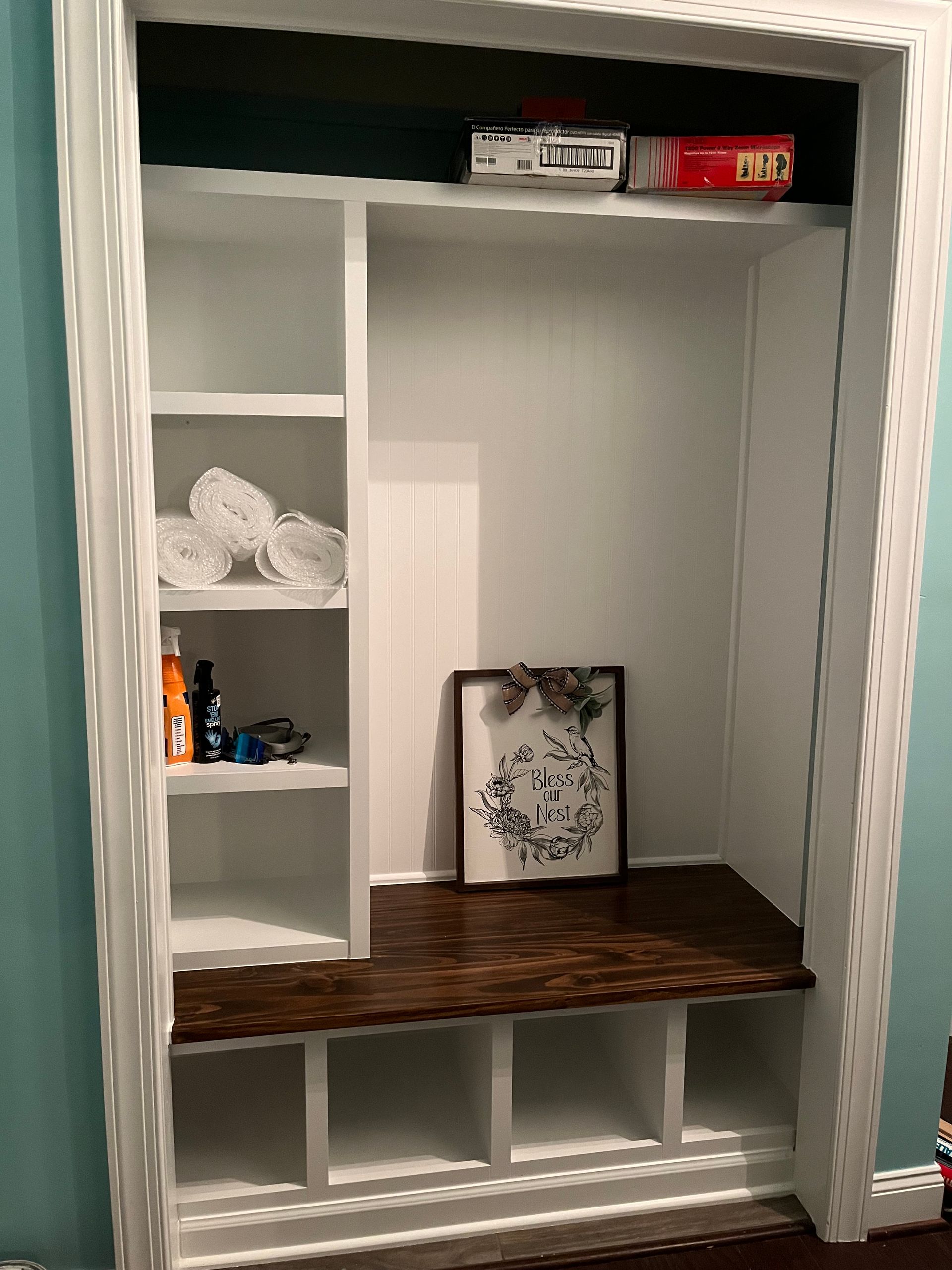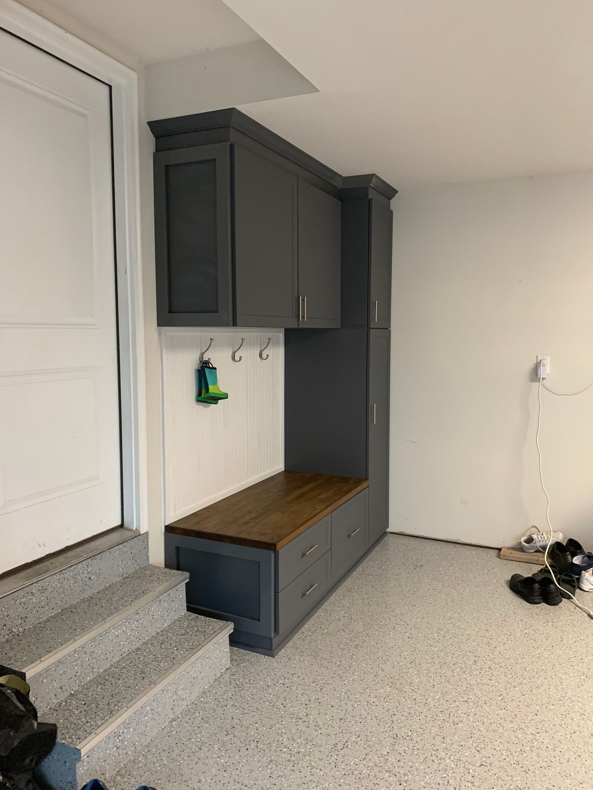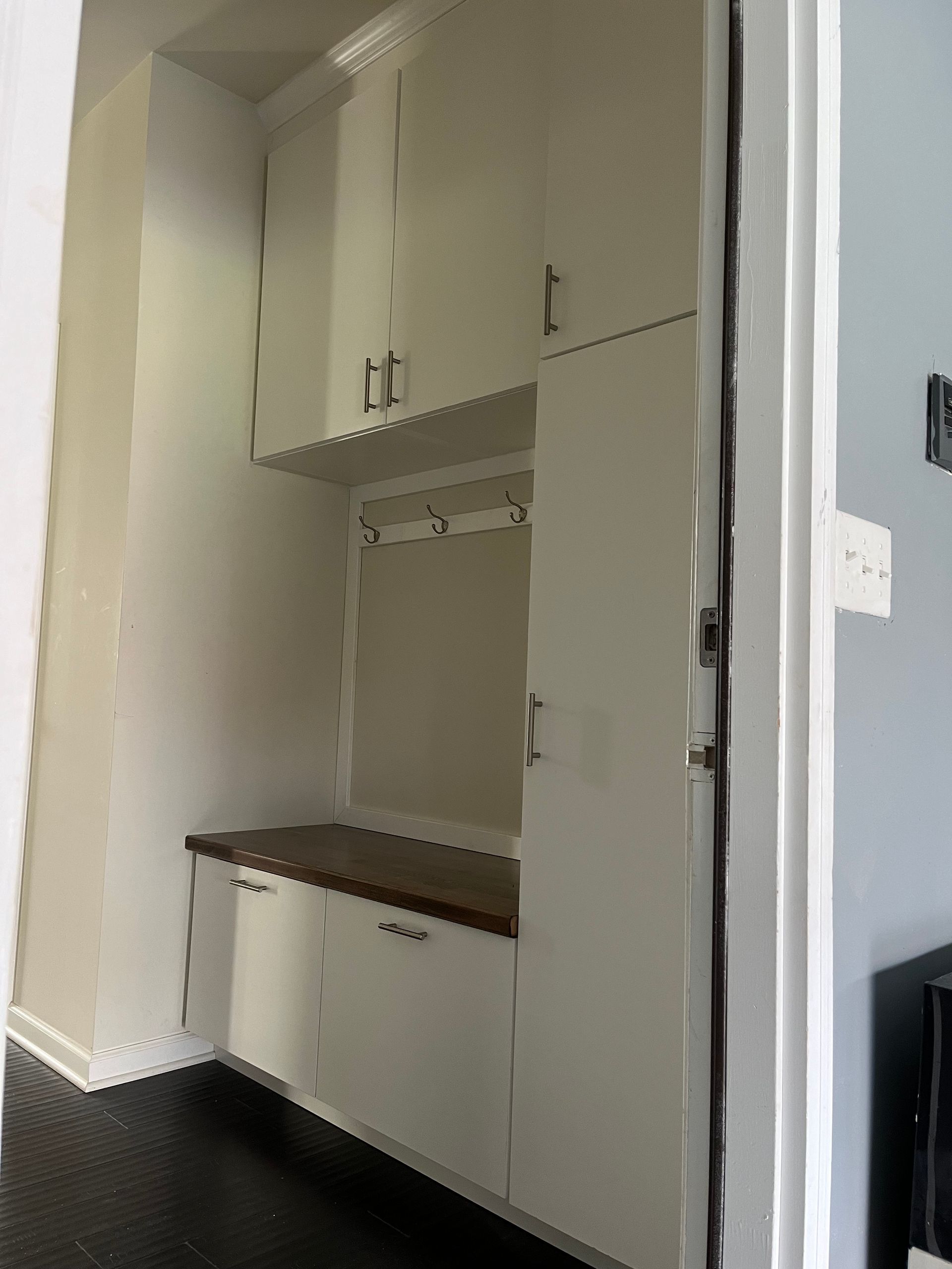Since moving into a larger shop with access to large format machinery and pre-finished melamine materials, I've been designing and building quite a few mudroom benches with various closets, shelves, cabinets, trim, etc... These are some examples of what I've done. It's an easy and inexpensive way to really change the look and organization of a space!
