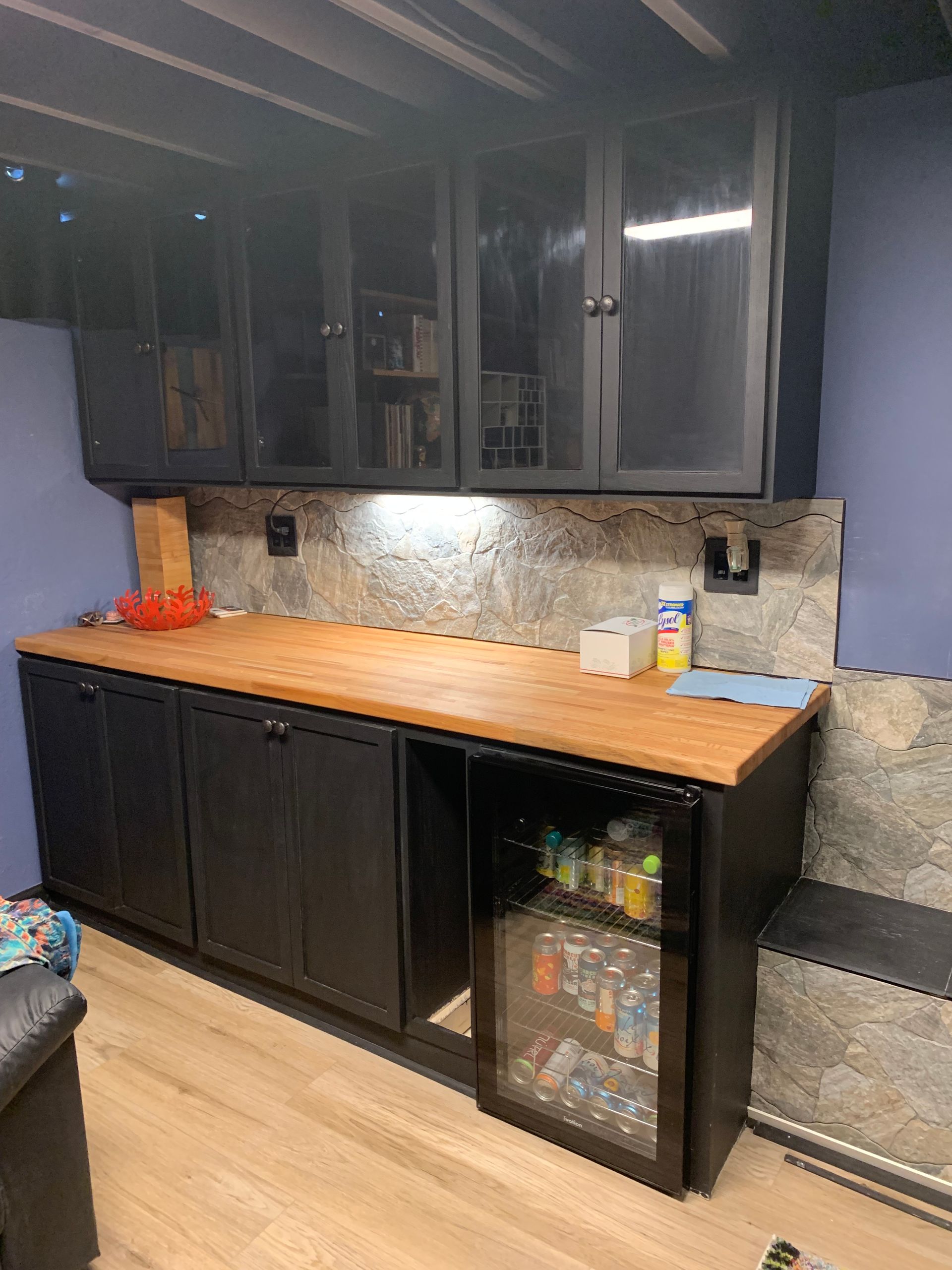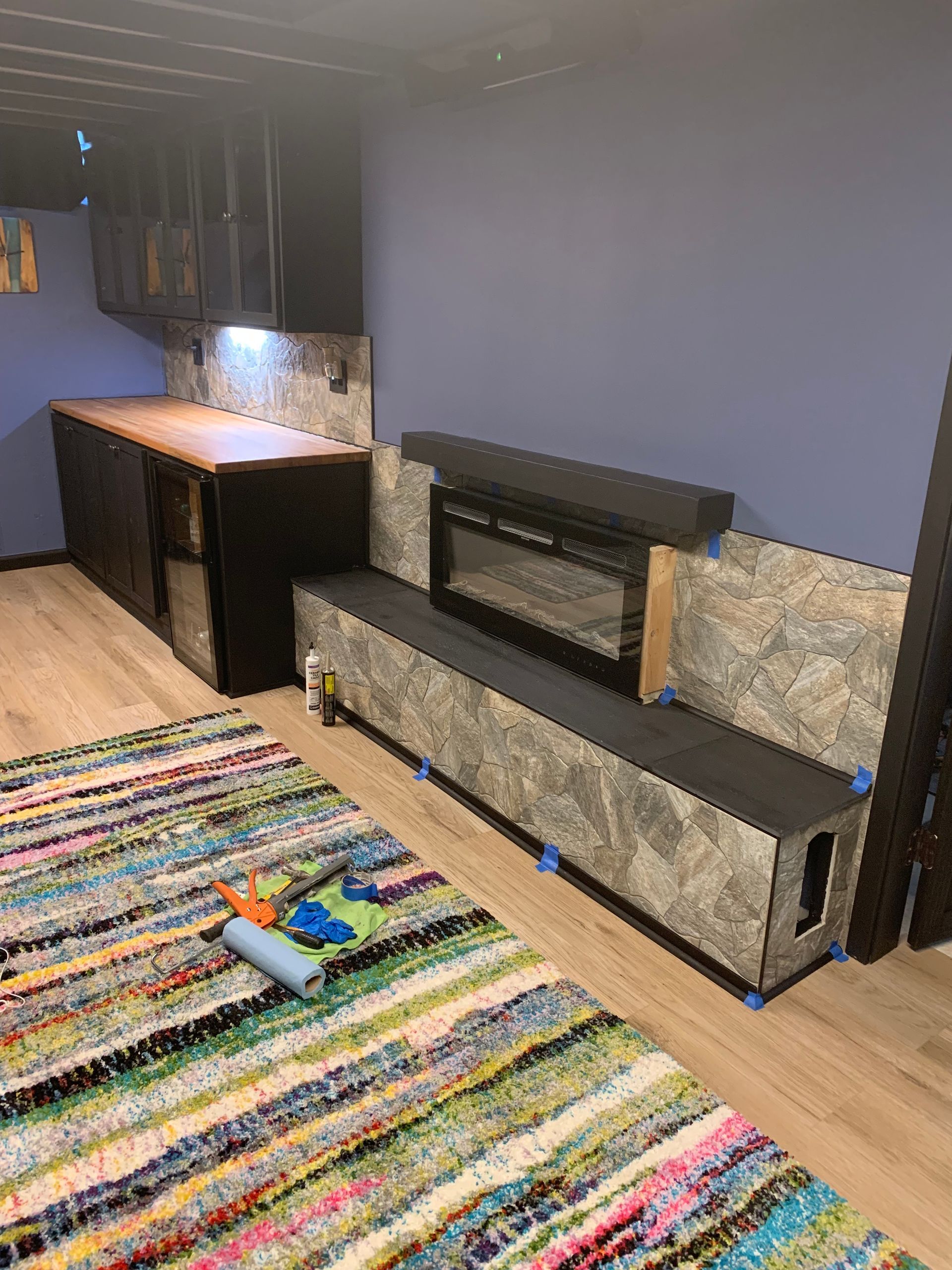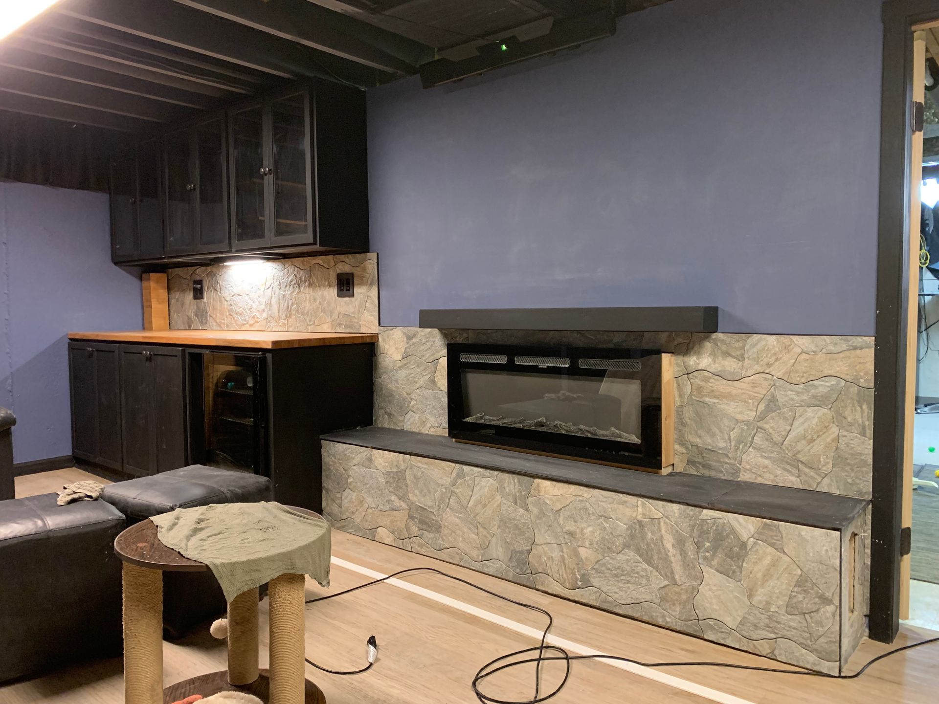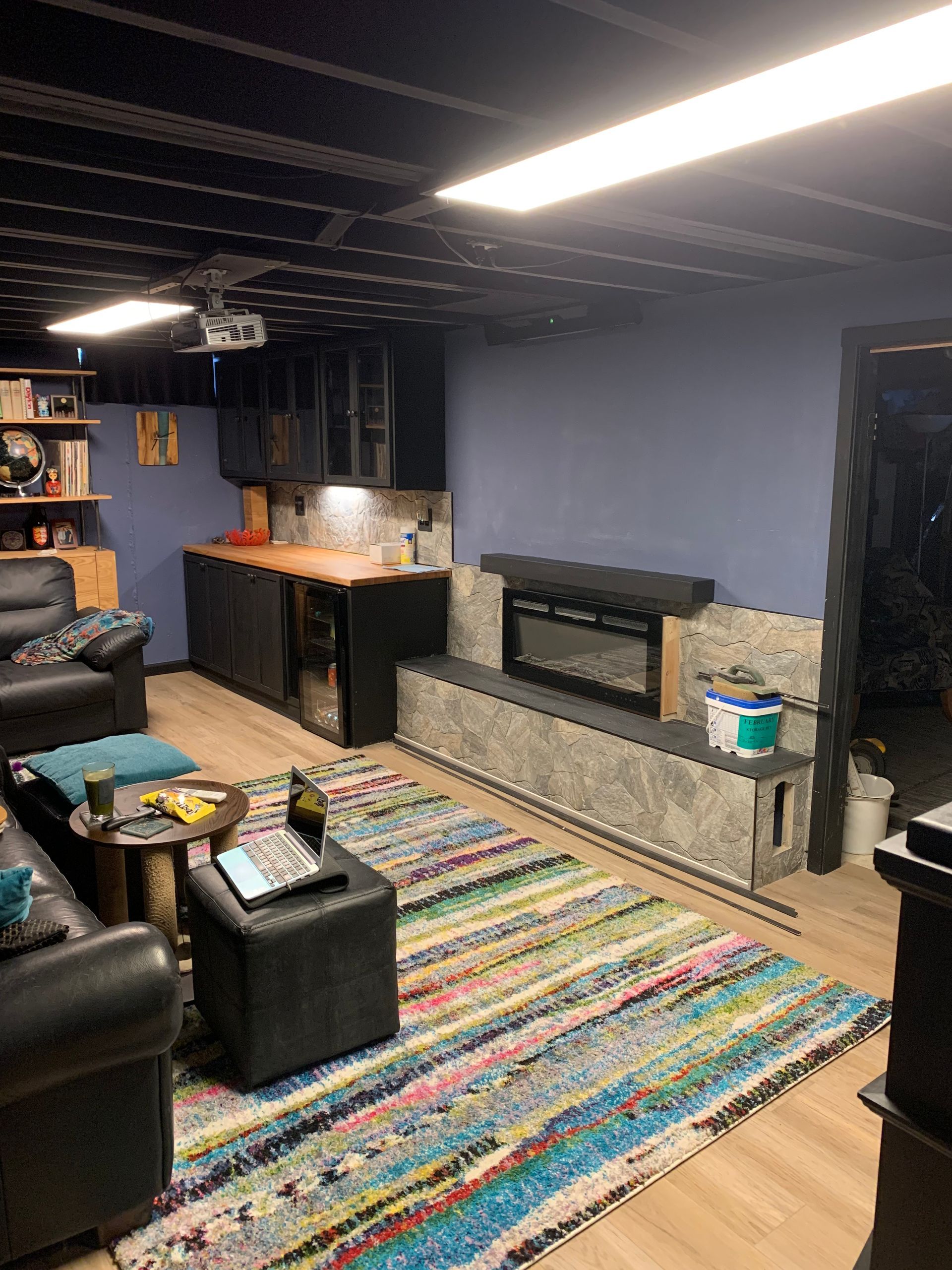 We decided to finish part of our basement as a theater/bar/hangout space and these are the results. I was all designed by my wife and I and completely built and installed by me. I had a little help from Warren with the flooring and Alex from Expertise painting with the mudding and painting. Custom cabinetry, butcher block countertops, stair cubby shelves, stair rail, mantle, fireplace, doors, lighting, furniture, etc... Let me know what you think!