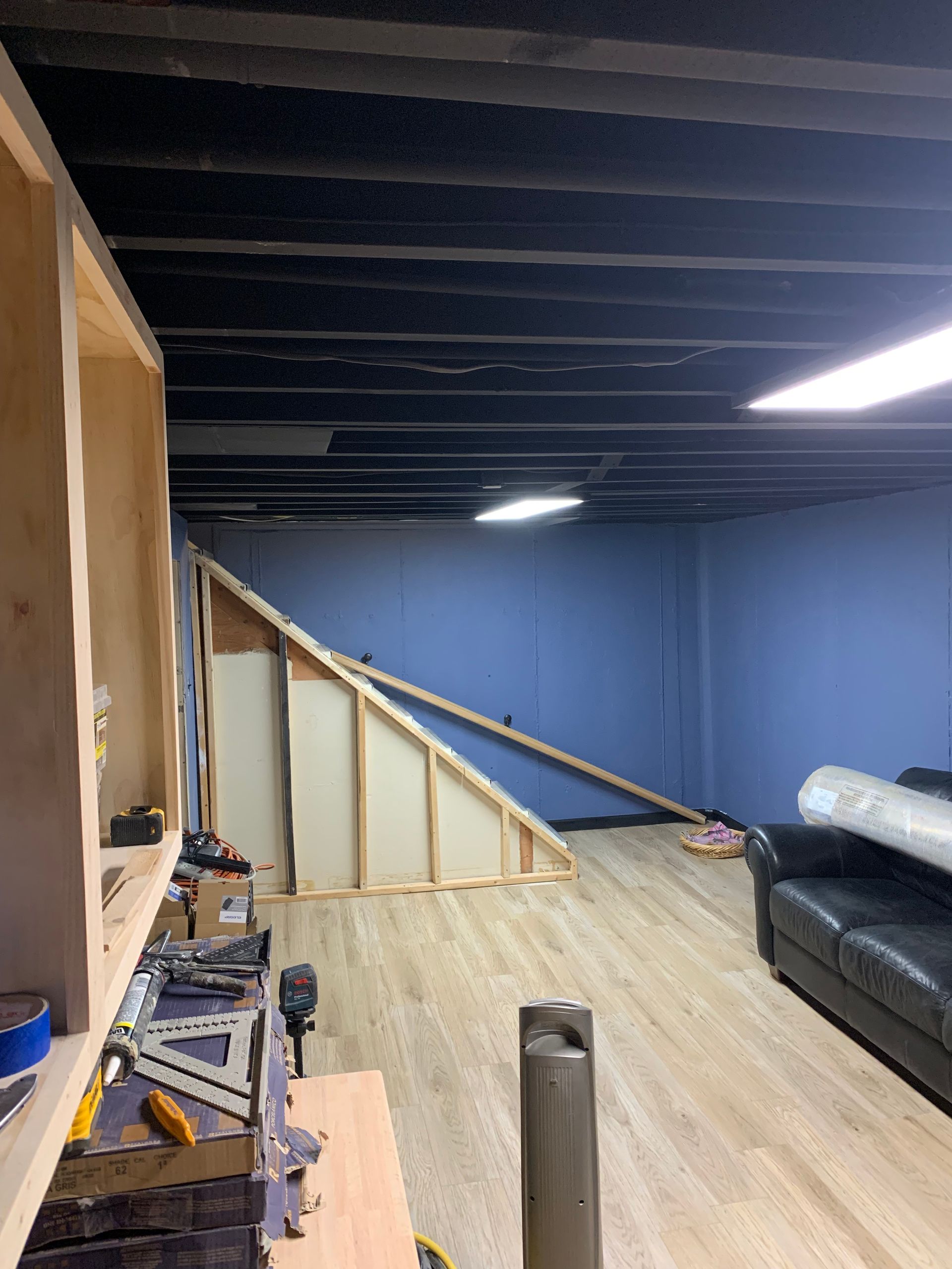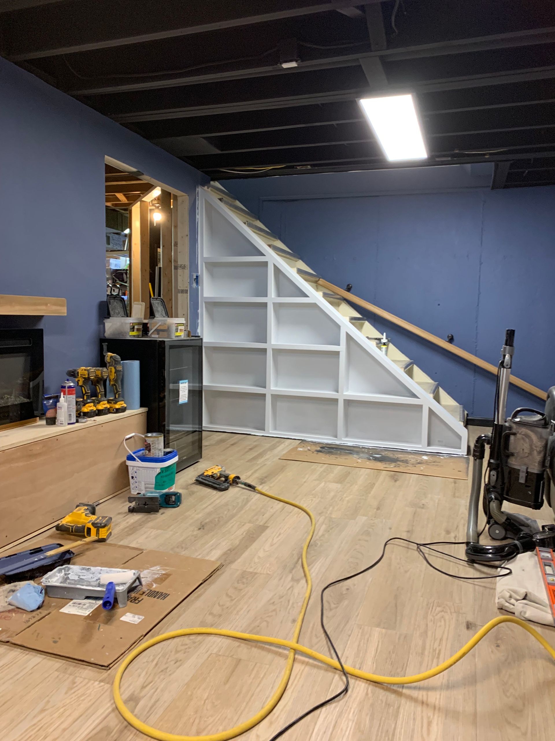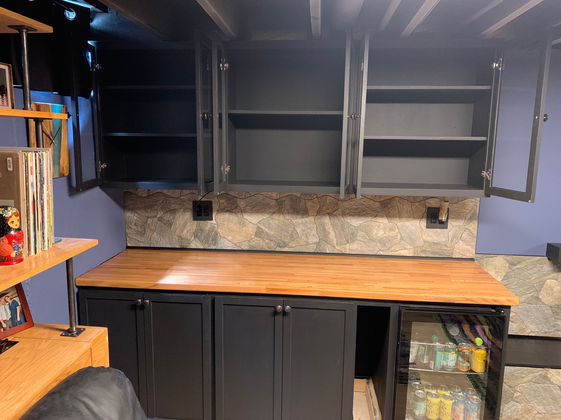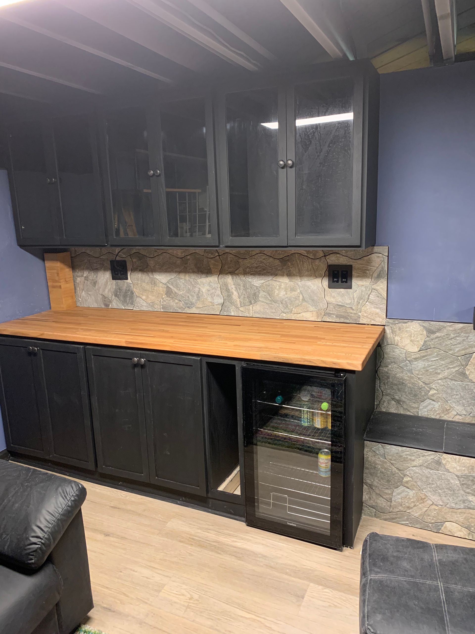 We decided to finish part of our basement as a theater/bar/hangout space and these are the results. I was all designed by my wife and I and completely built and installed by me. I had a little help from Warren with the flooring and Alex from Expertise painting with the mudding and painting. Custom cabinetry, butcher block countertops, stair cubby shelves, stair rail, mantle, fireplace, doors, lighting, furniture, etc... Let me know what you think!