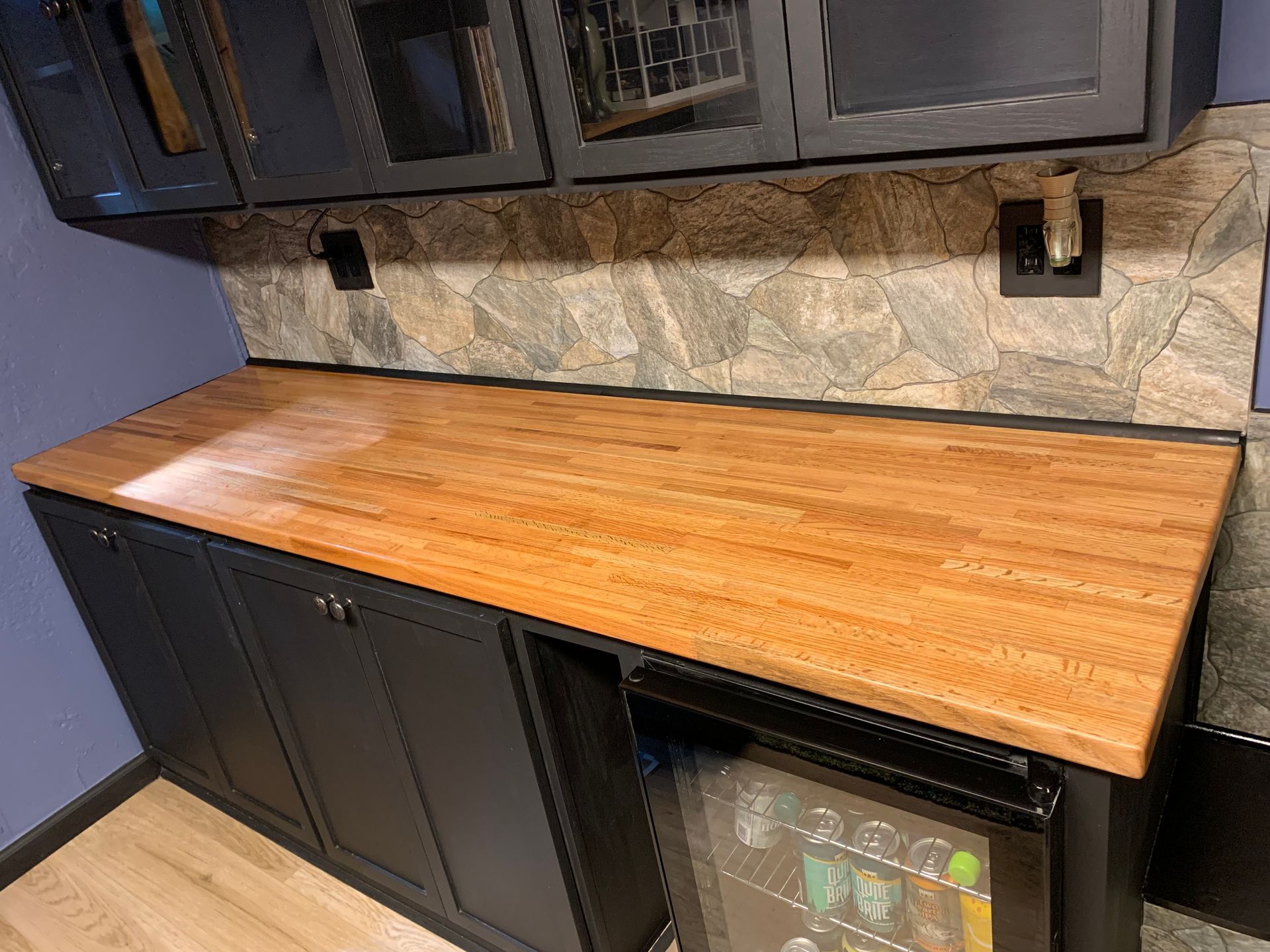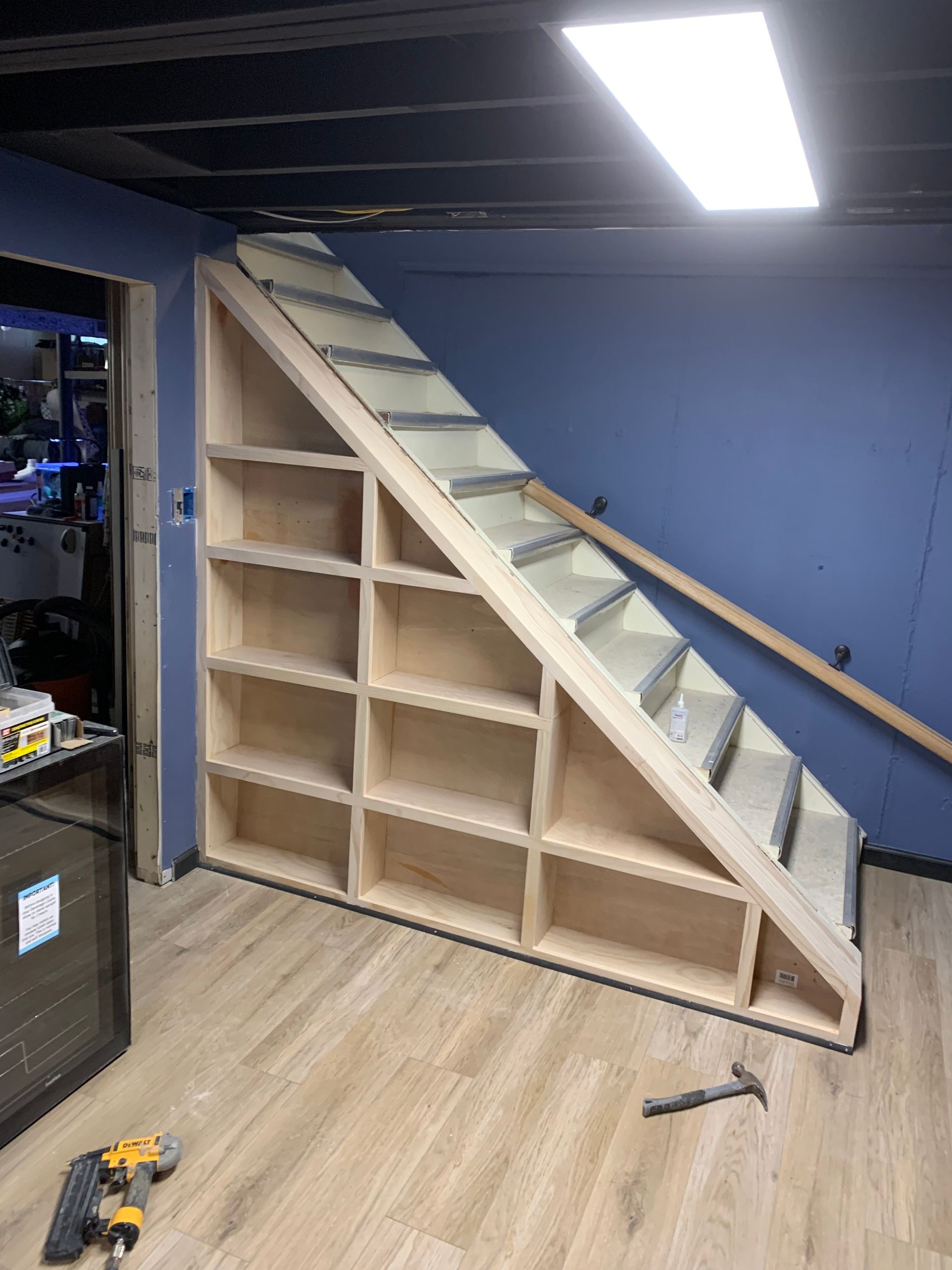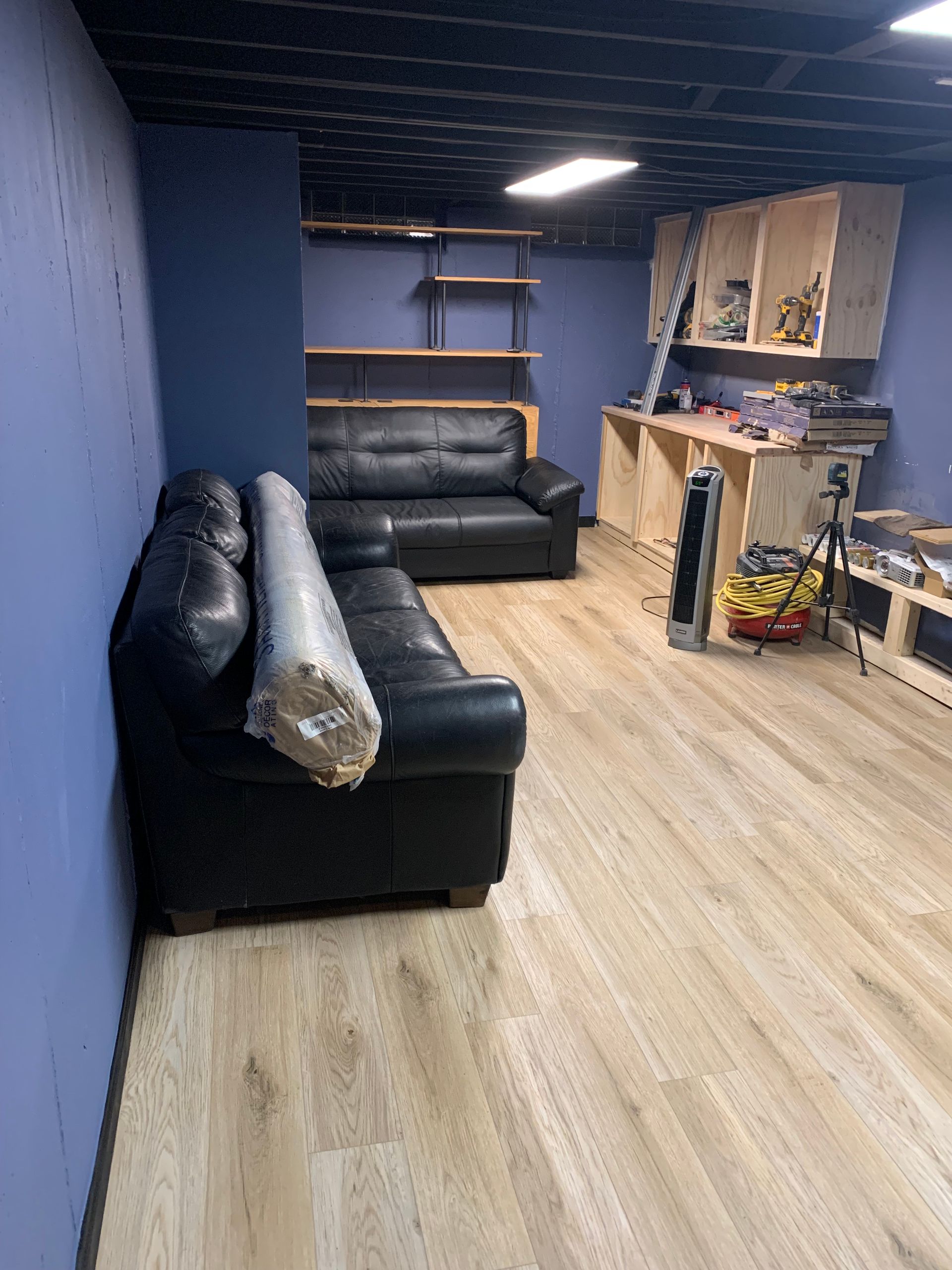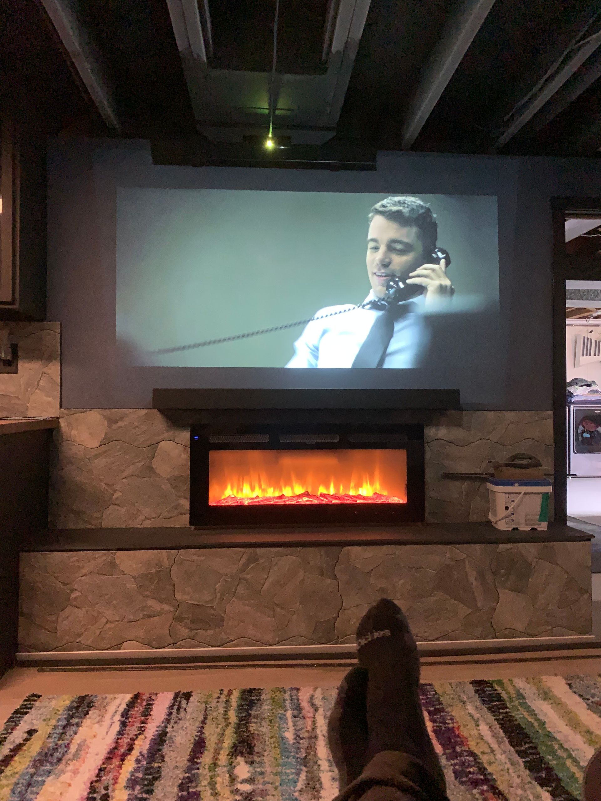 We decided to finish part of our basement as a theater/bar/hangout space and these are the results. I was all designed by my wife and I and completely built and installed by me. I had a little help from Warren with the flooring and Alex from Expertise painting with the mudding and painting. Custom cabinetry, butcher block countertops, stair cubby shelves, stair rail, mantle, fireplace, doors, lighting, furniture, etc... Let me know what you think!