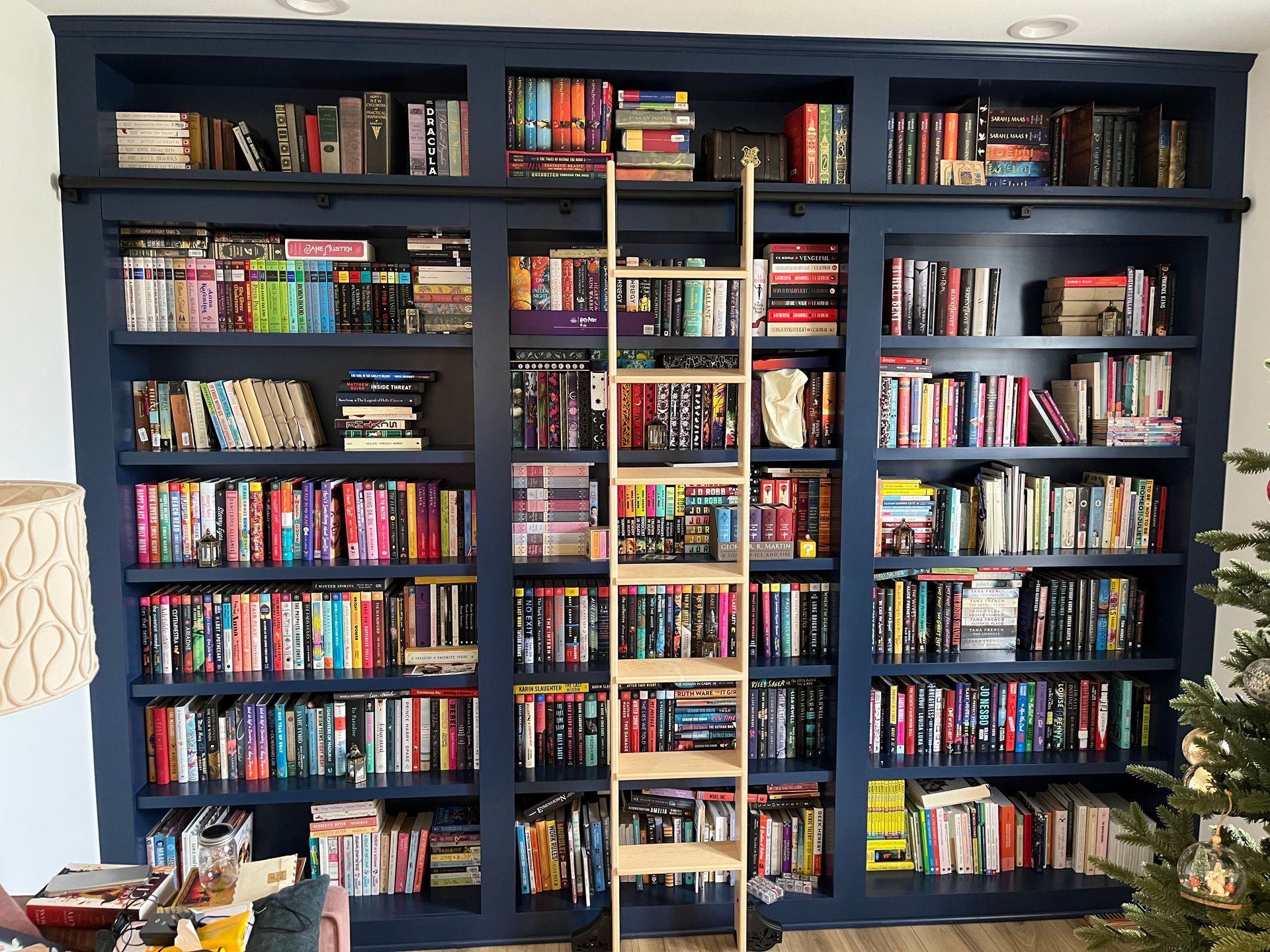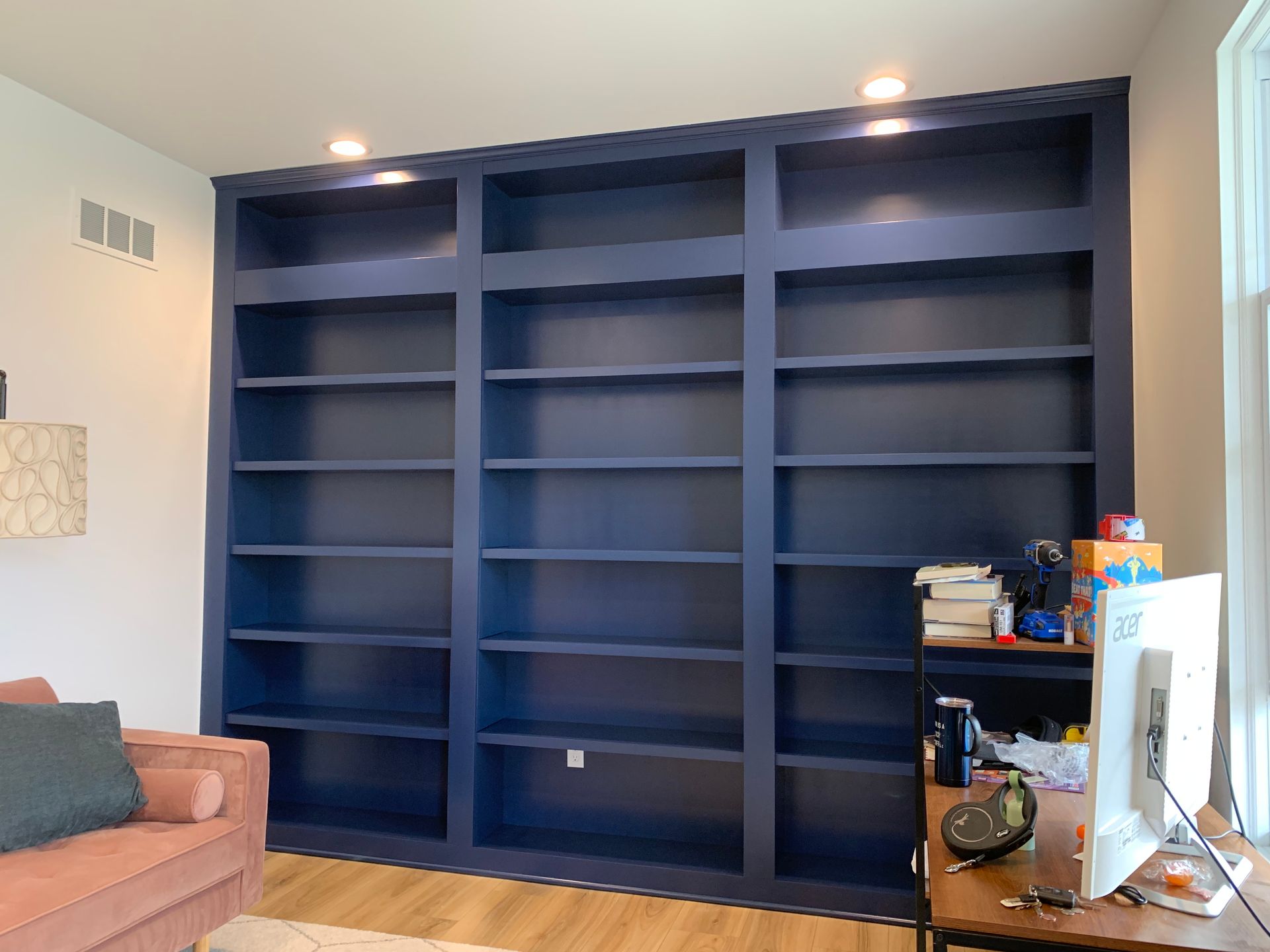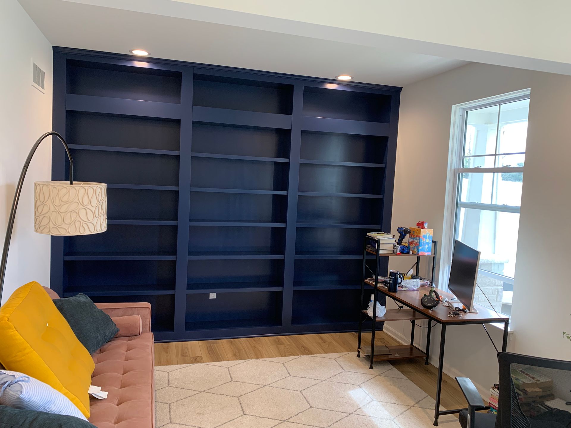 Very modern, minimalist library. All painted with a custom navy blue conversion varnish paint for durability. Also did these customers living room built-ins and they may want another library upstairs... this one didn't hold all their books!