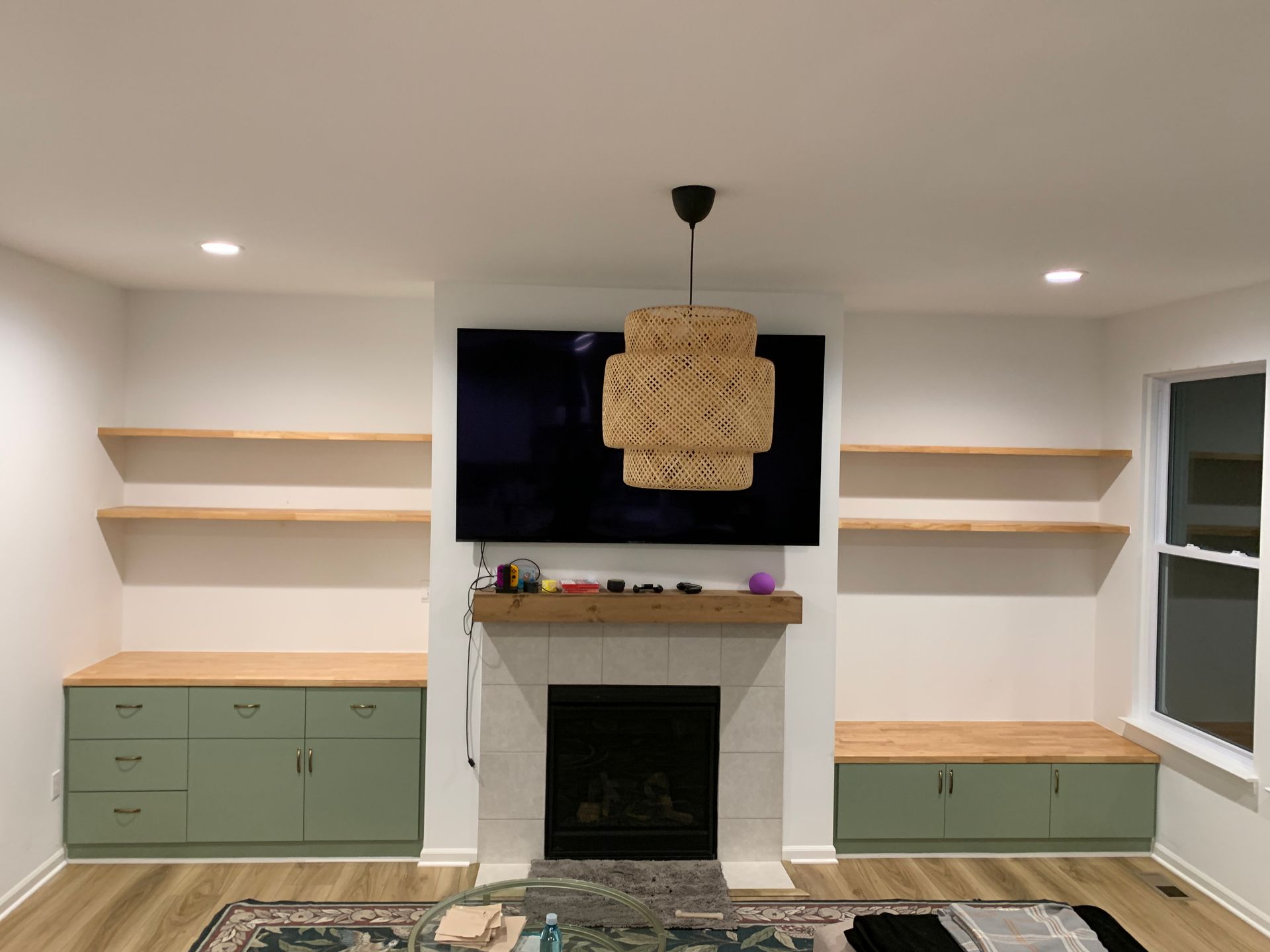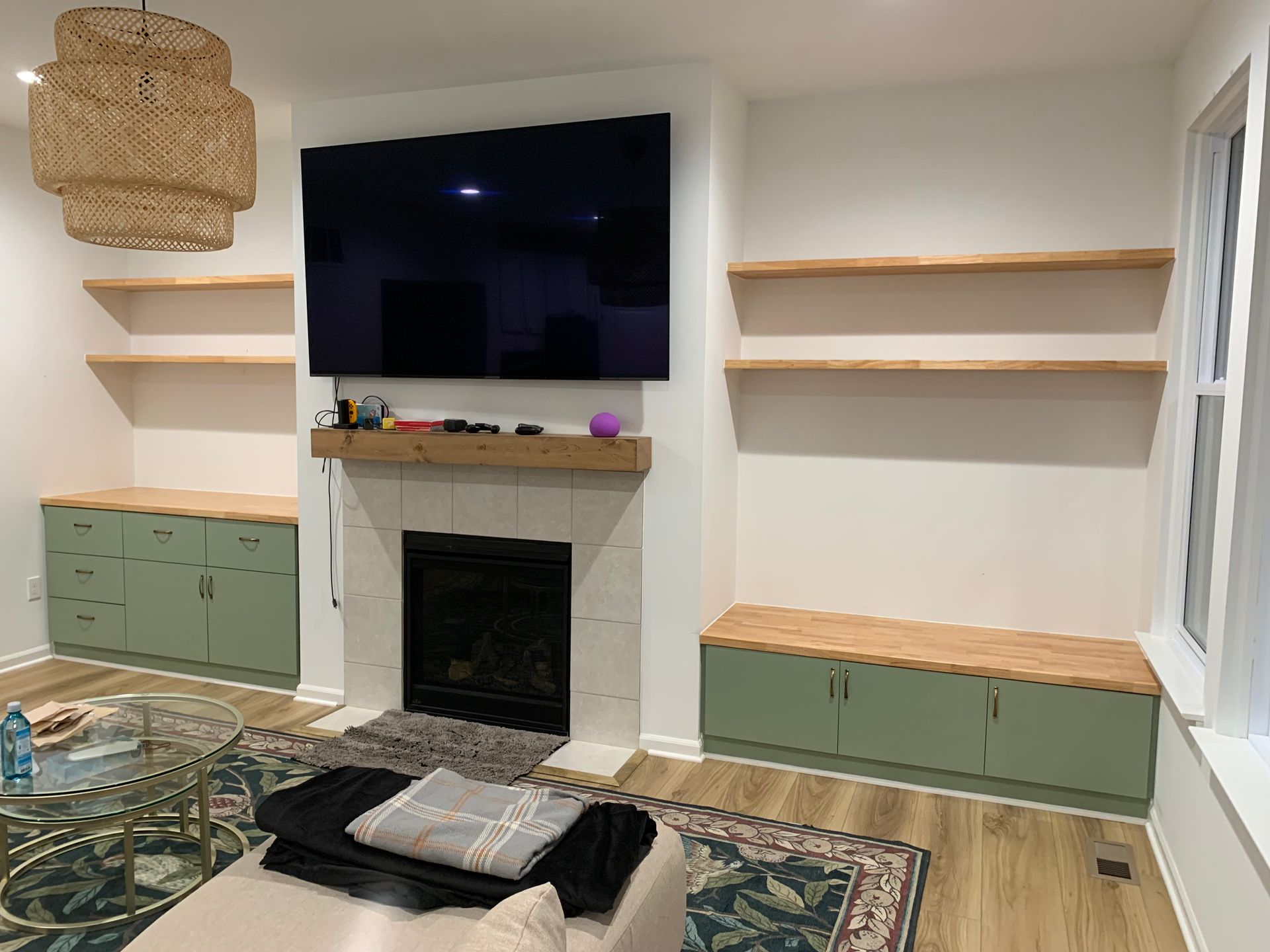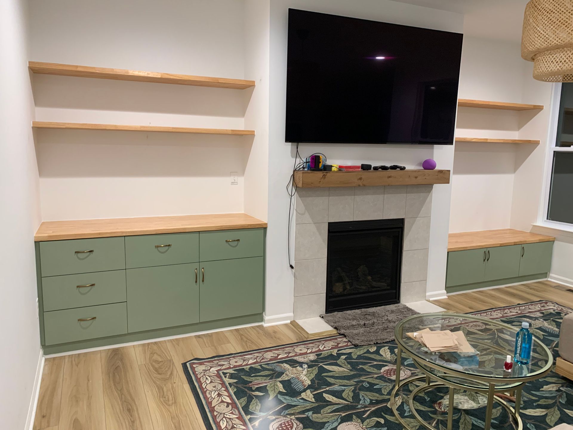 Very modern, minimalist living room built-ins for the same customer as the library. All painted with a custom green conversion varnish paint for durability. countertops and floating shelves are solid rubberwood butcher block finished with Osmo PolyX. Gave them just the solution they needed for a bar, storage, and a nice aesthetic.