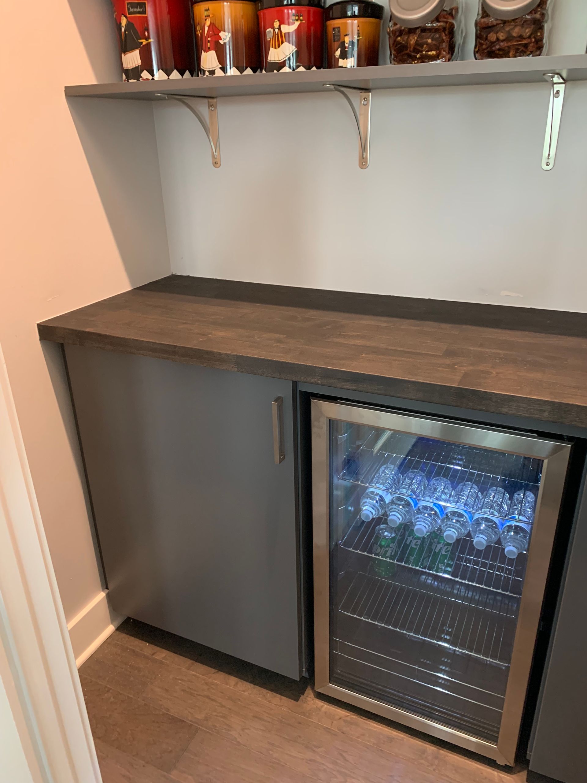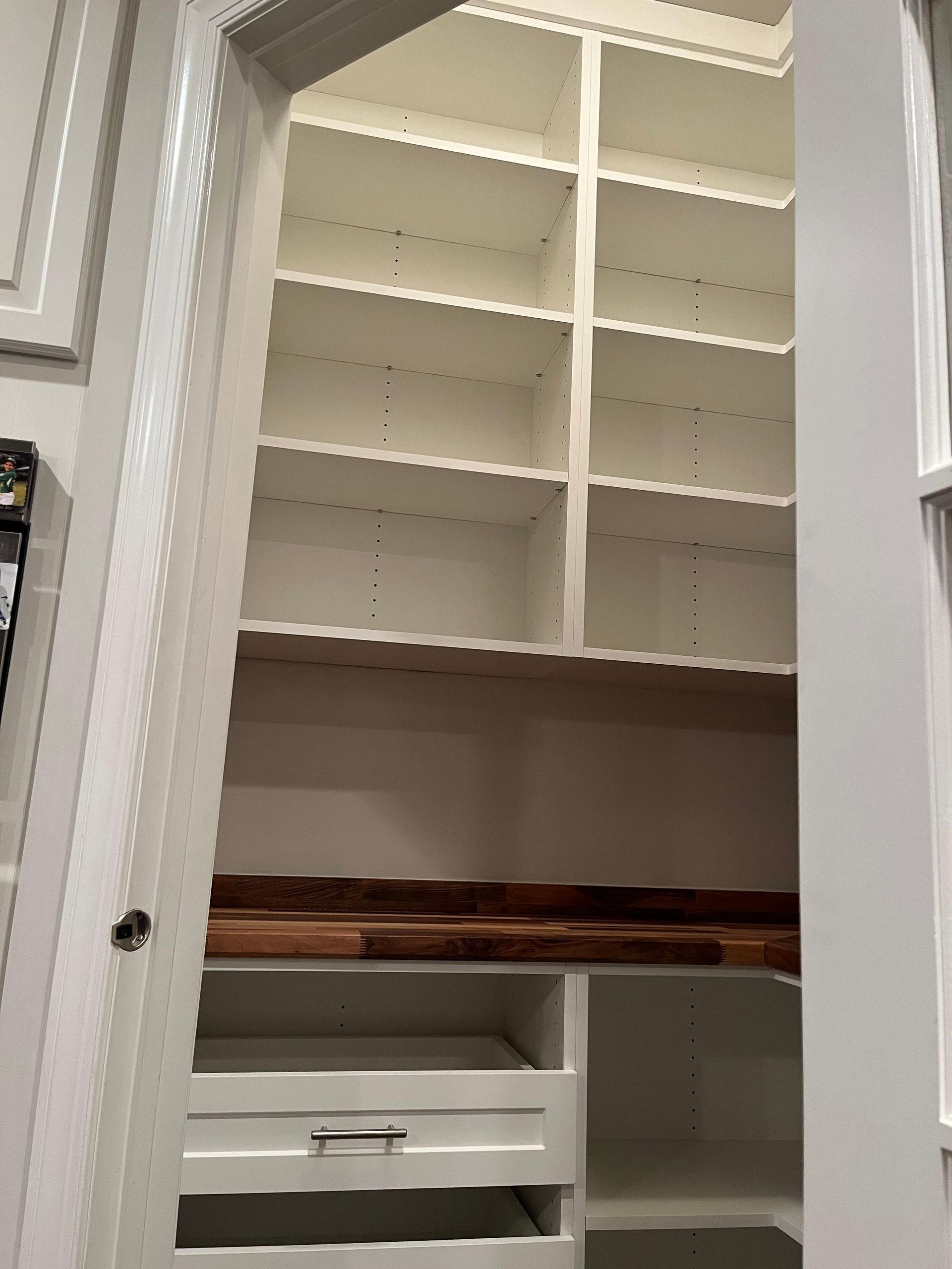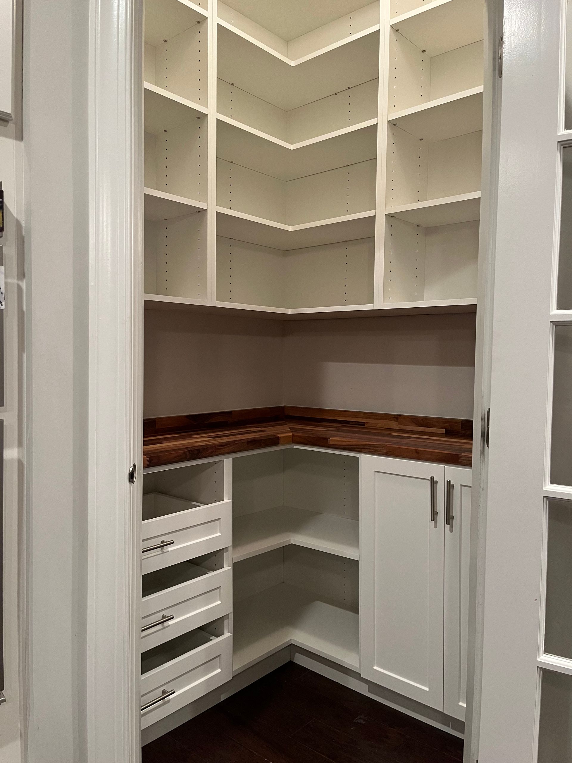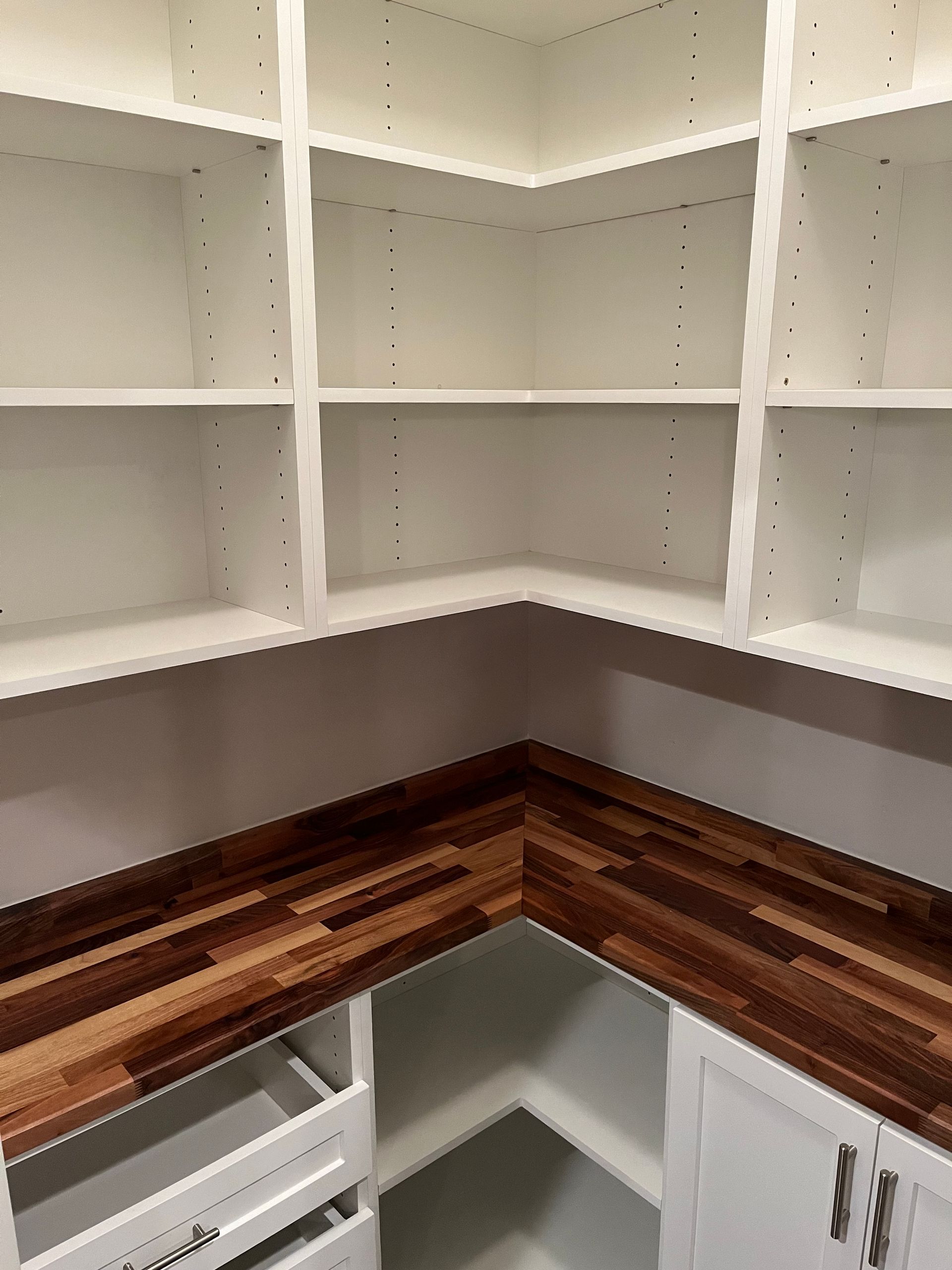 Simple but effective kitchen pantry room. Made of pre-finished Tafisa melamine and rubber wood butcher block. Custom designed built and installed by me, (Steve) SLB Woodwork LLC