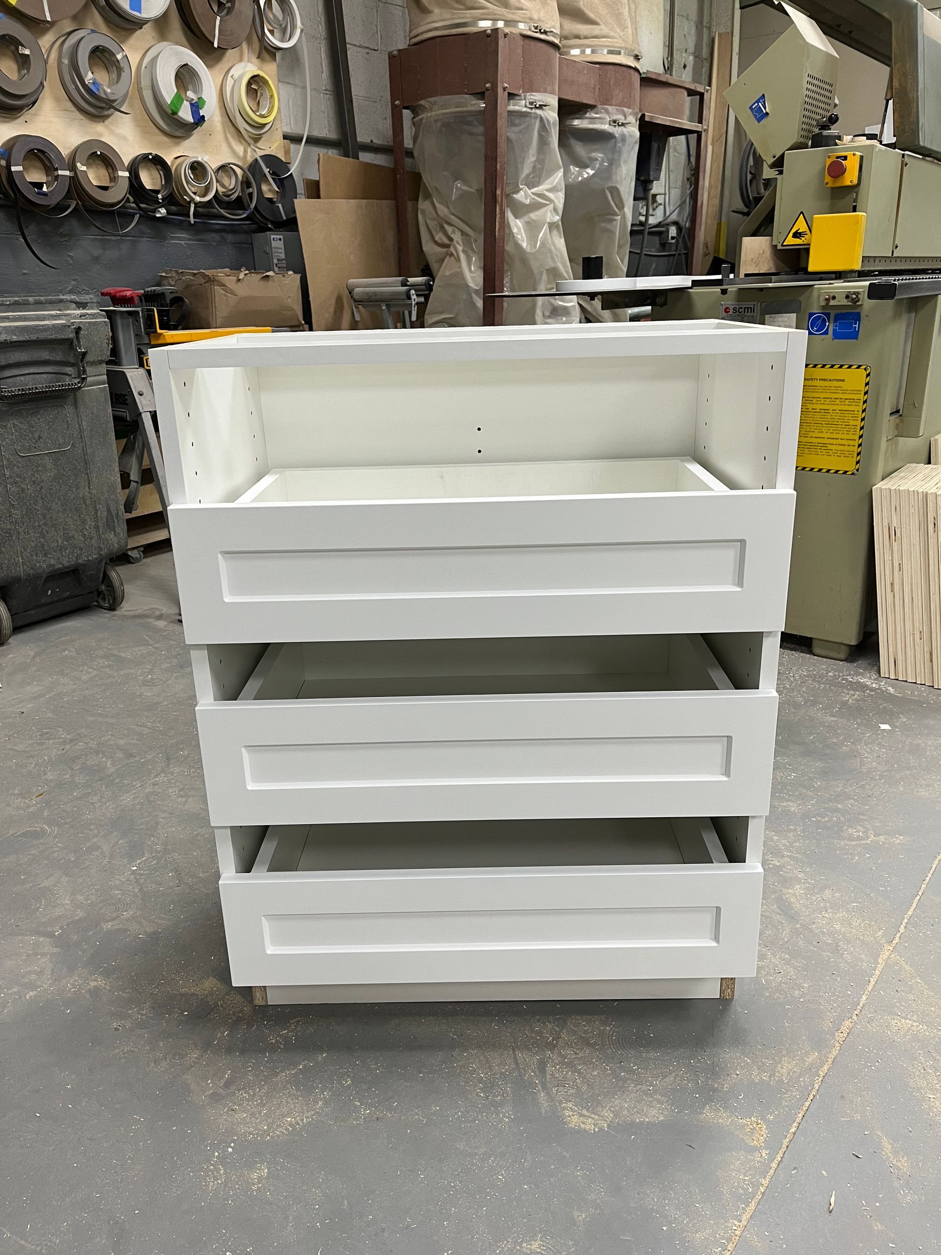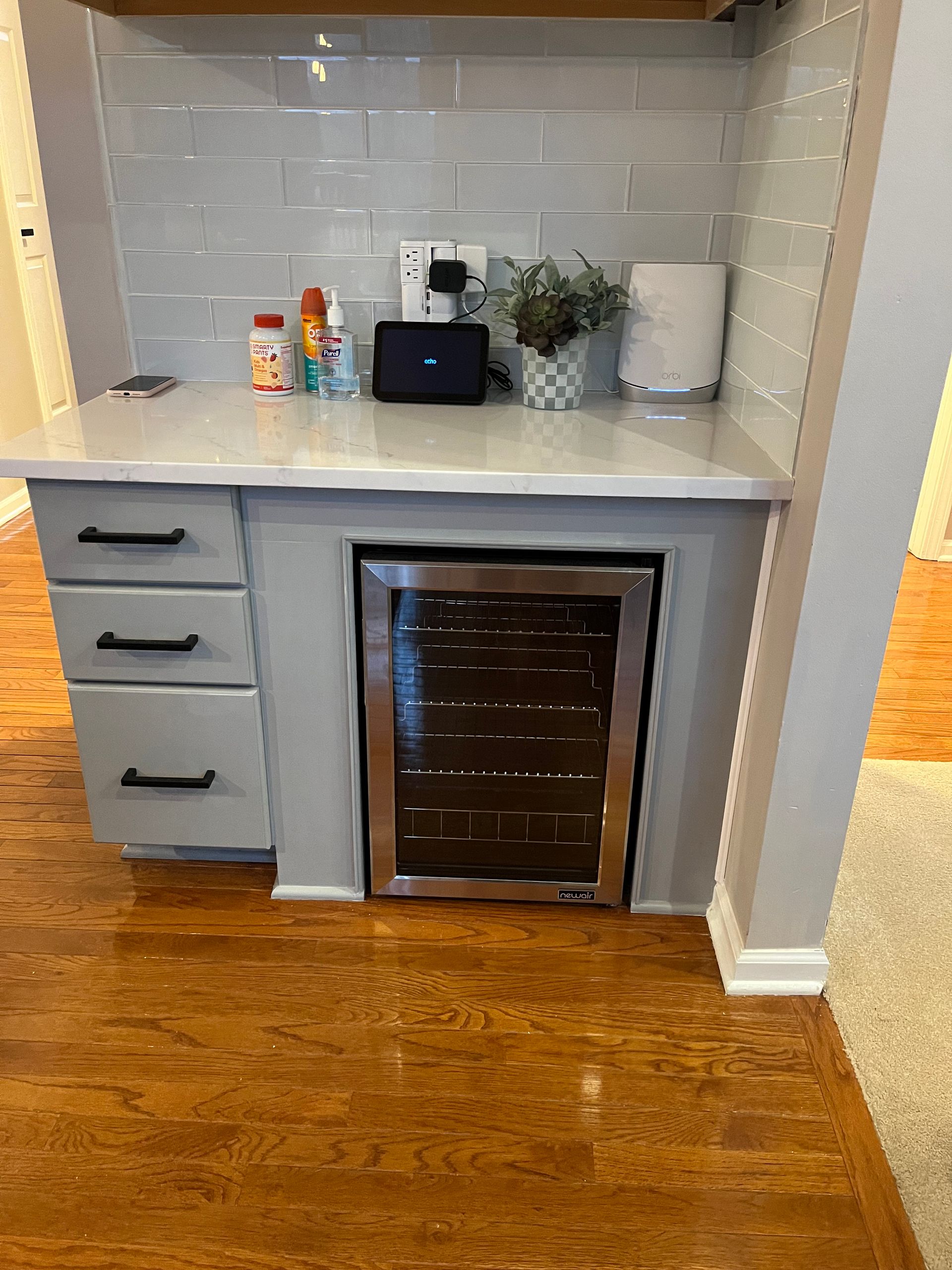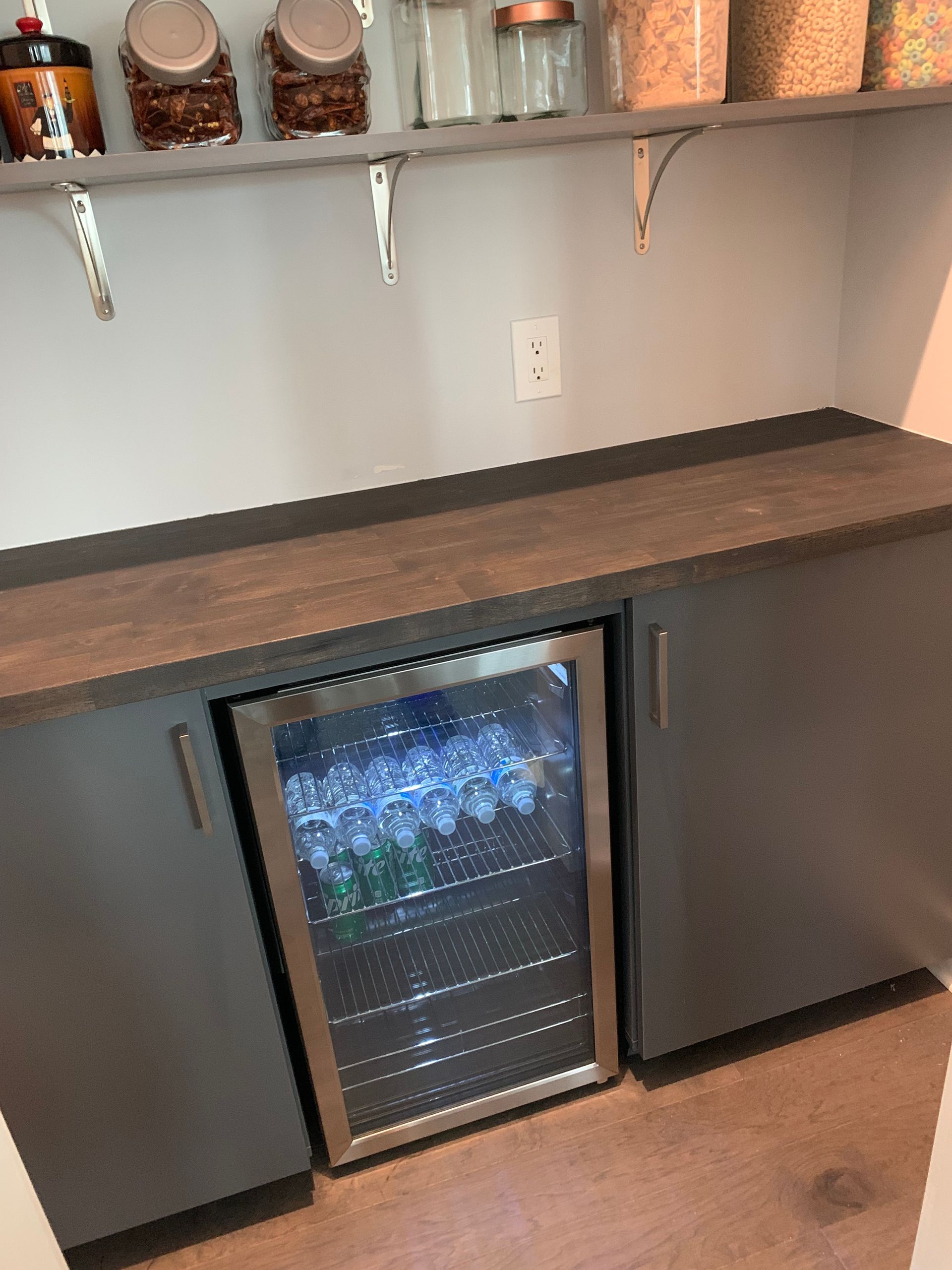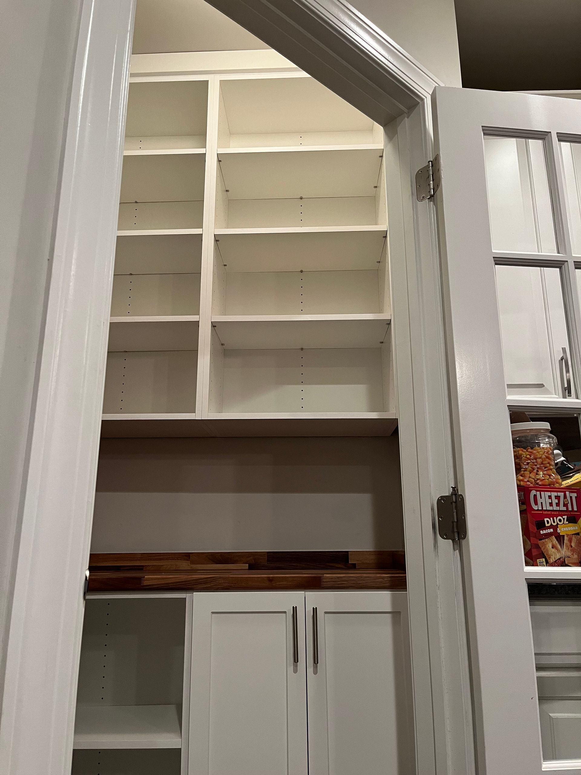 Simple but effective kitchen pantry room. Made of pre-finished Tafisa melamine and rubber wood butcher block. Custom designed built and installed by me, (Steve) SLB Woodwork LLC