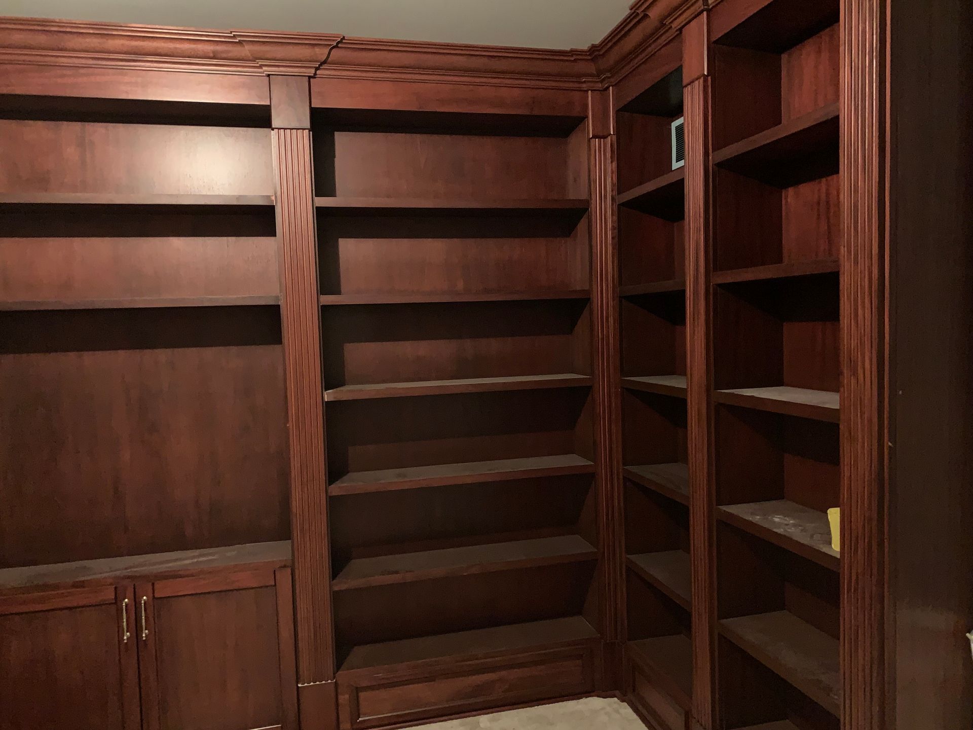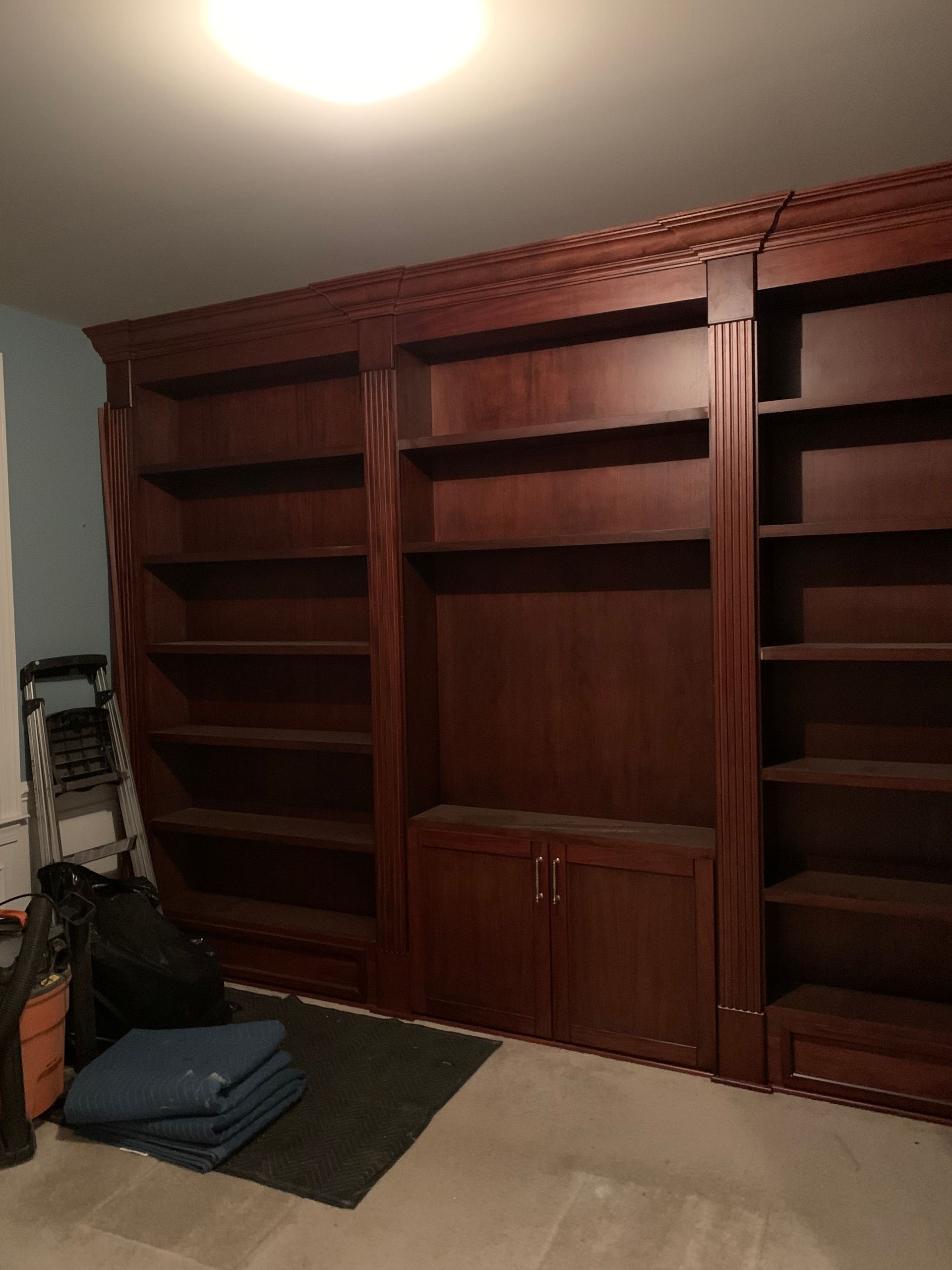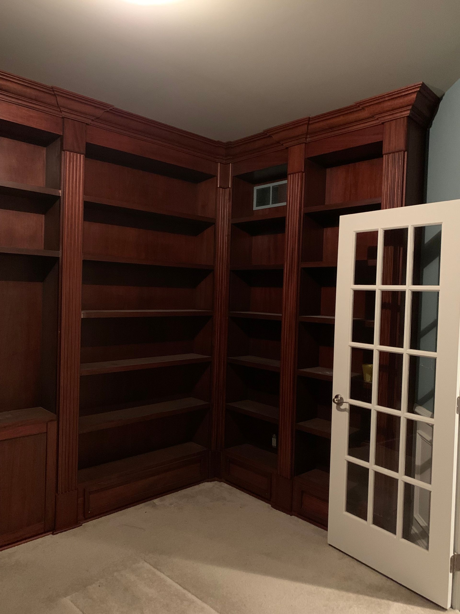 A huge 2 wall traditional style library made from African mahogany. All designed, built, stained, installed, and clear coated by me. It was a difficult project but the customers were over the moon with the results.