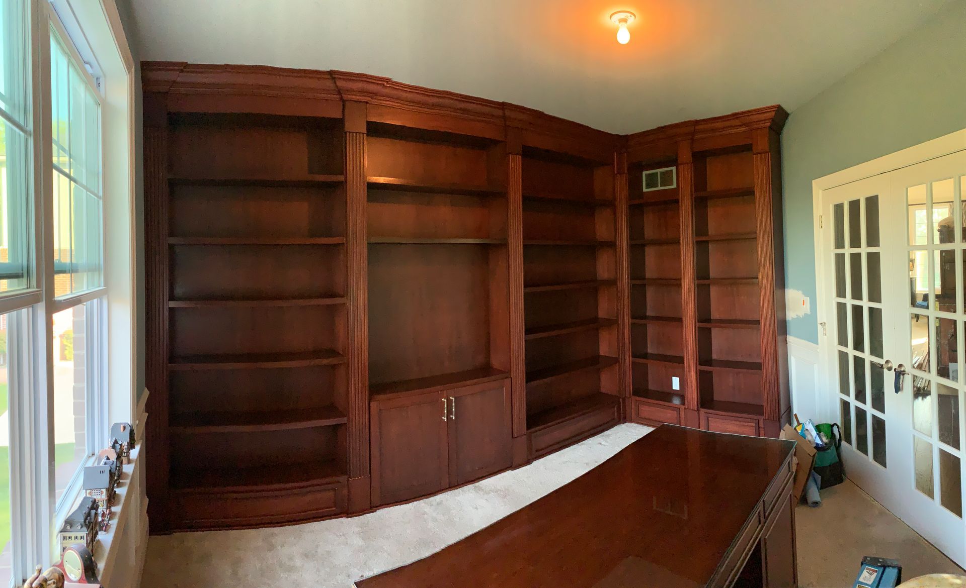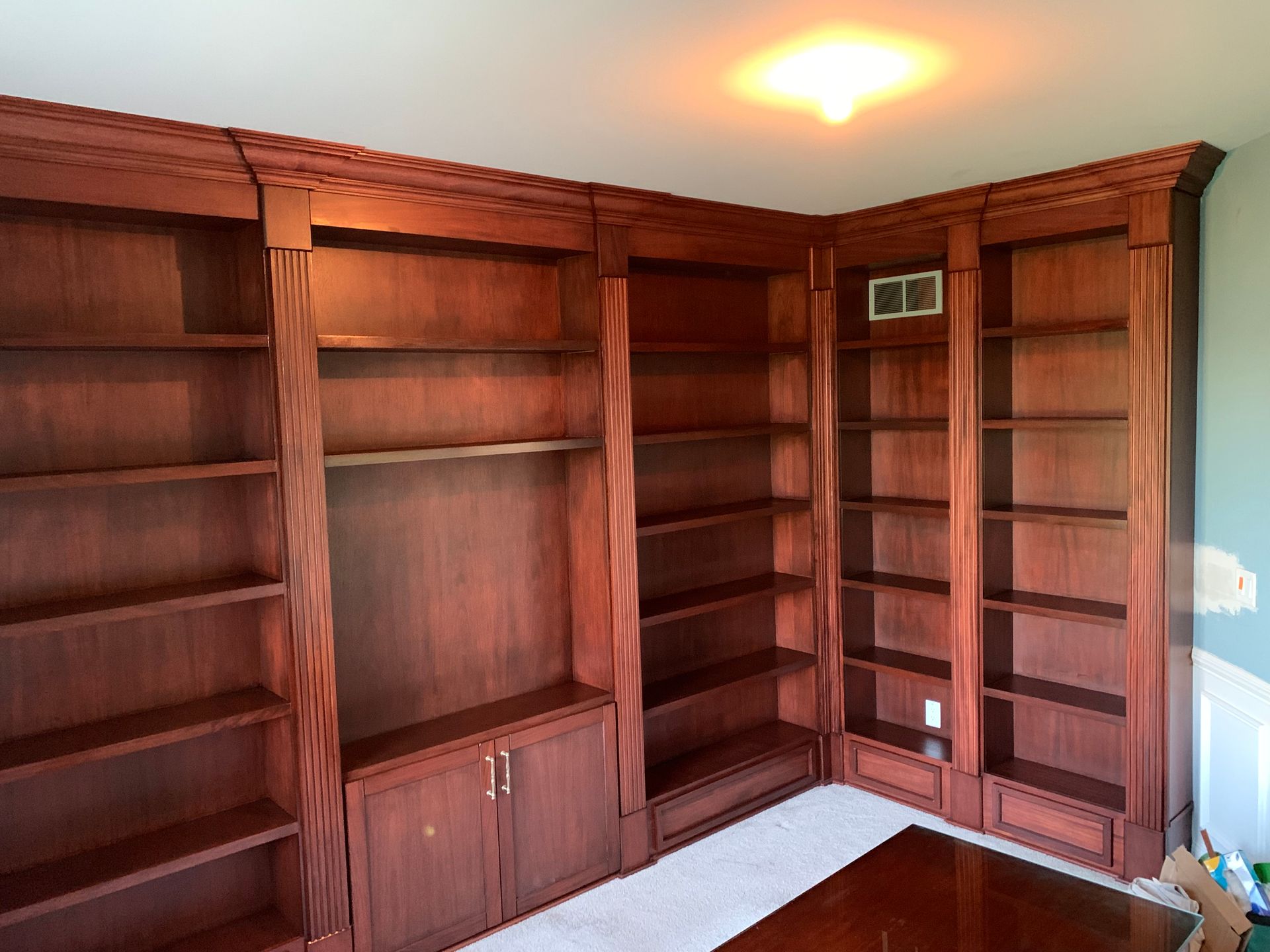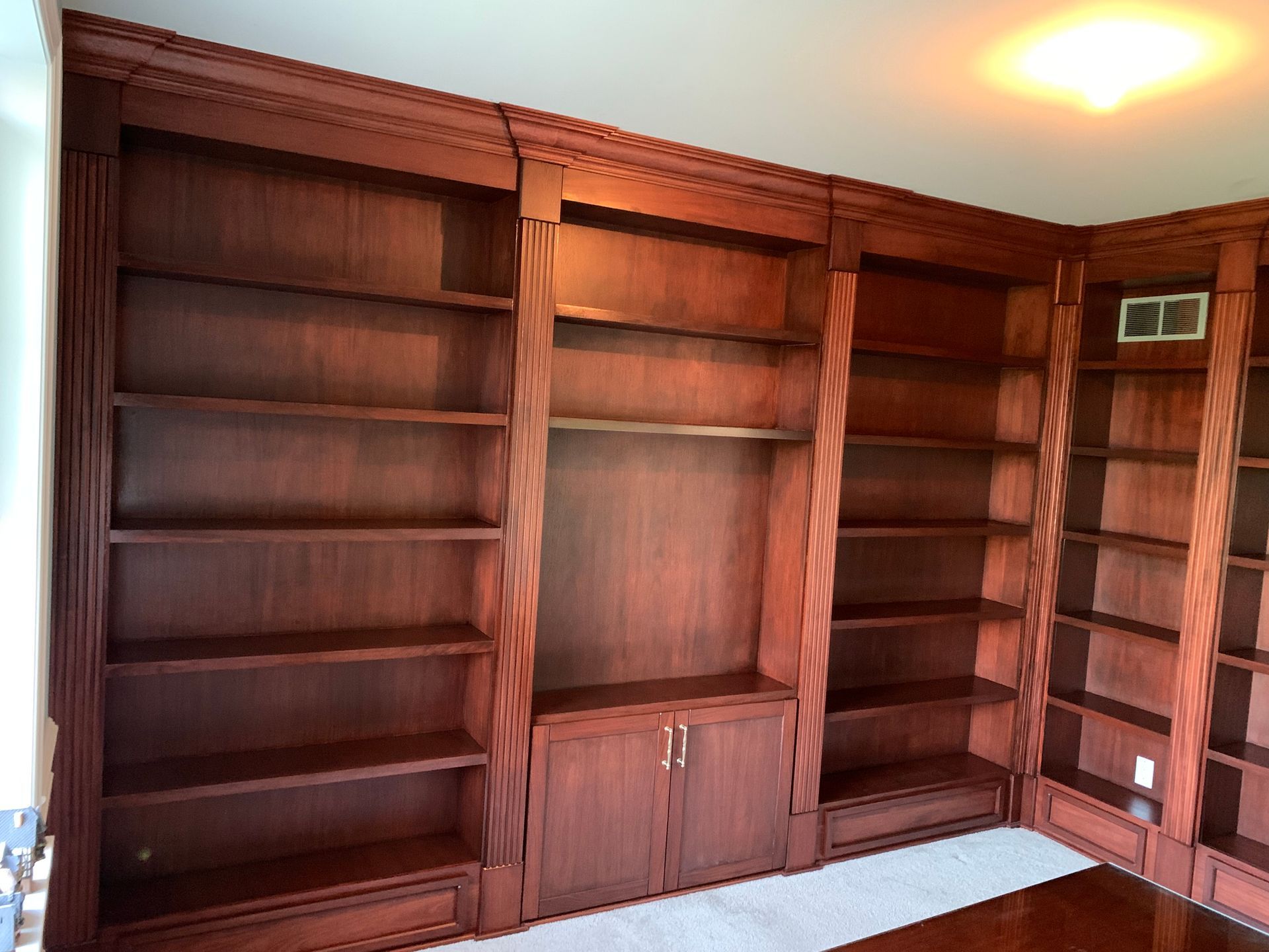 A huge 2 wall traditional style library made from African mahogany. All designed, built, stained, installed, and clear coated by me. It was a difficult project but the customers were over the moon with the results.