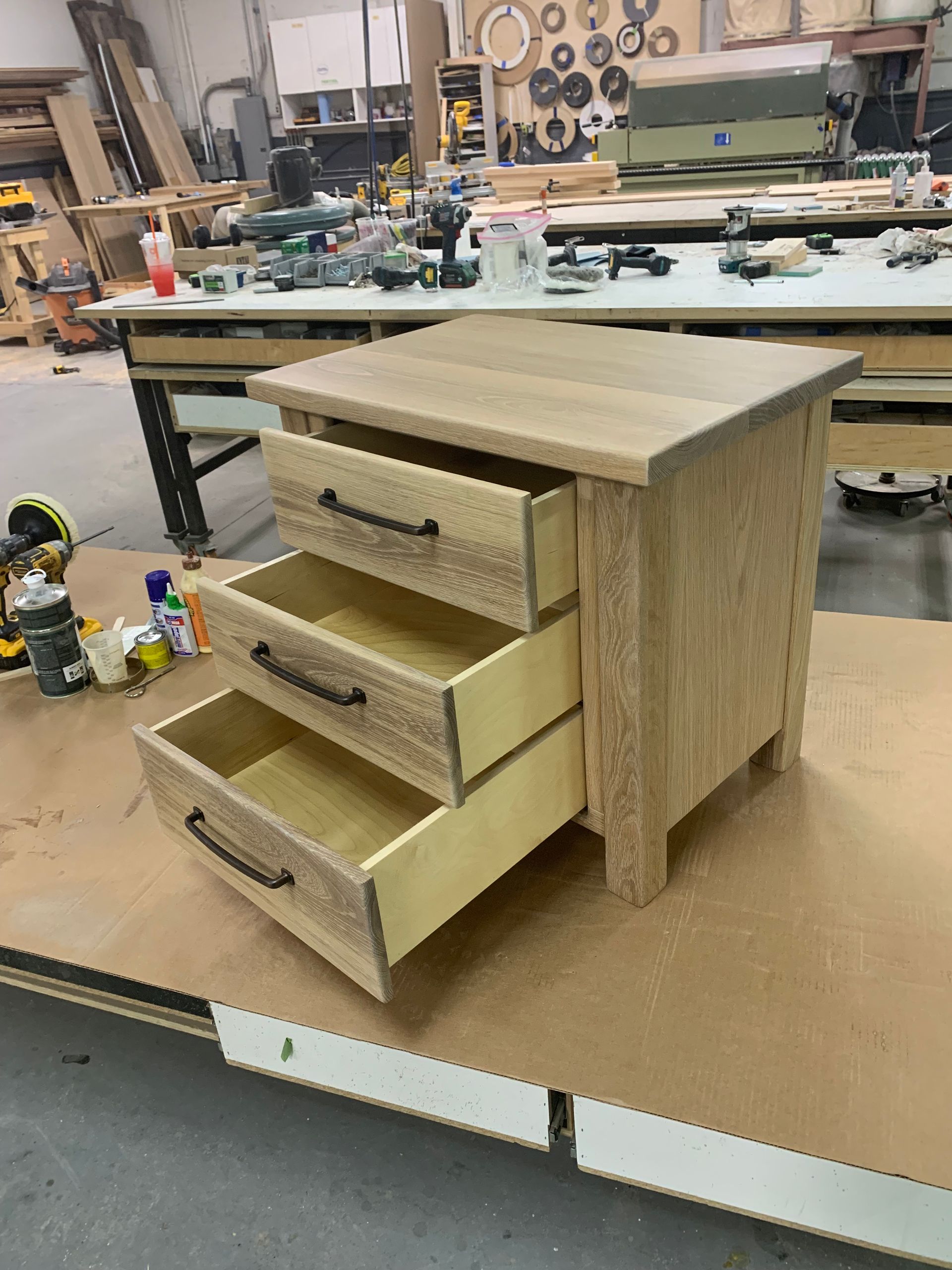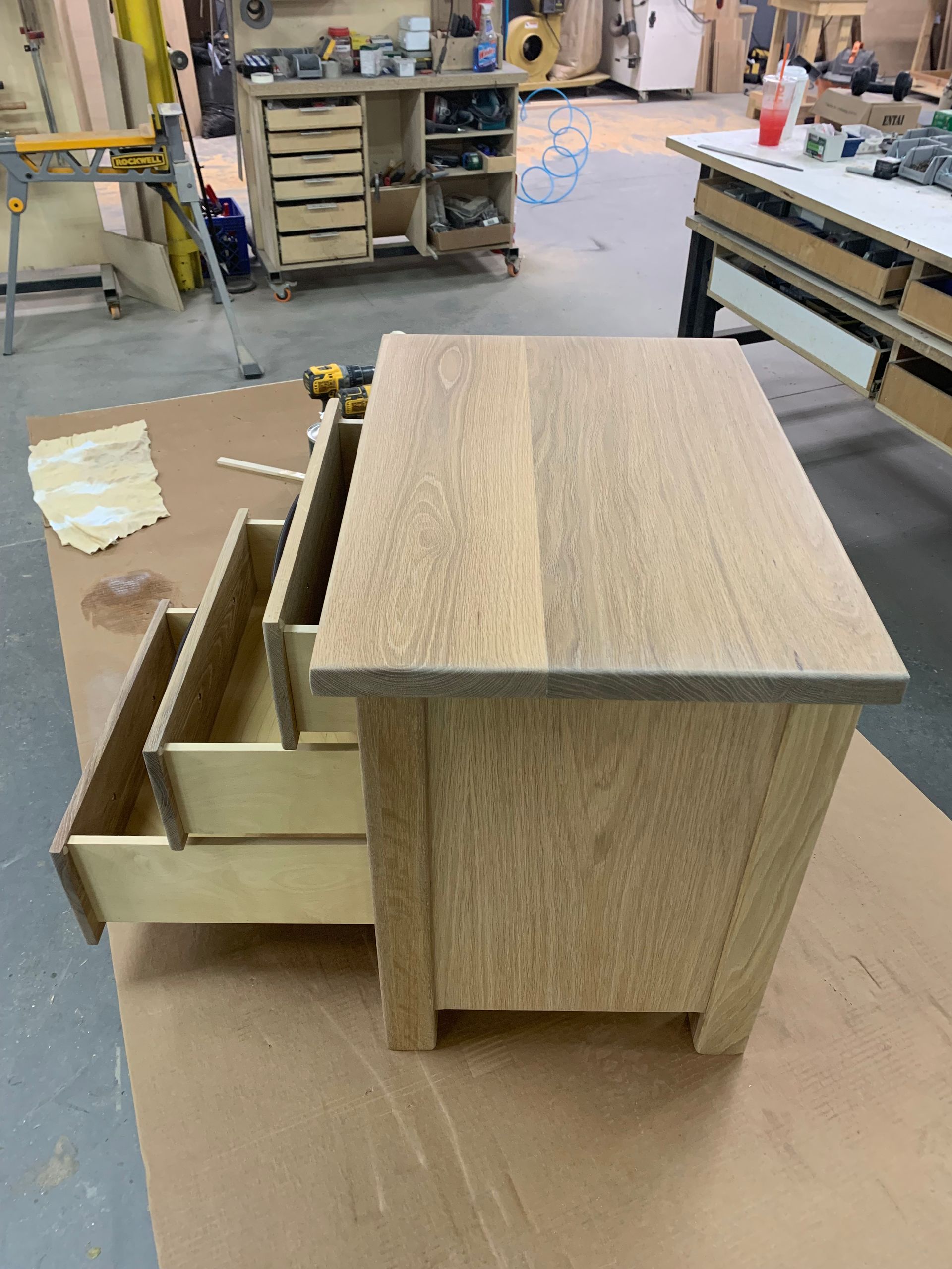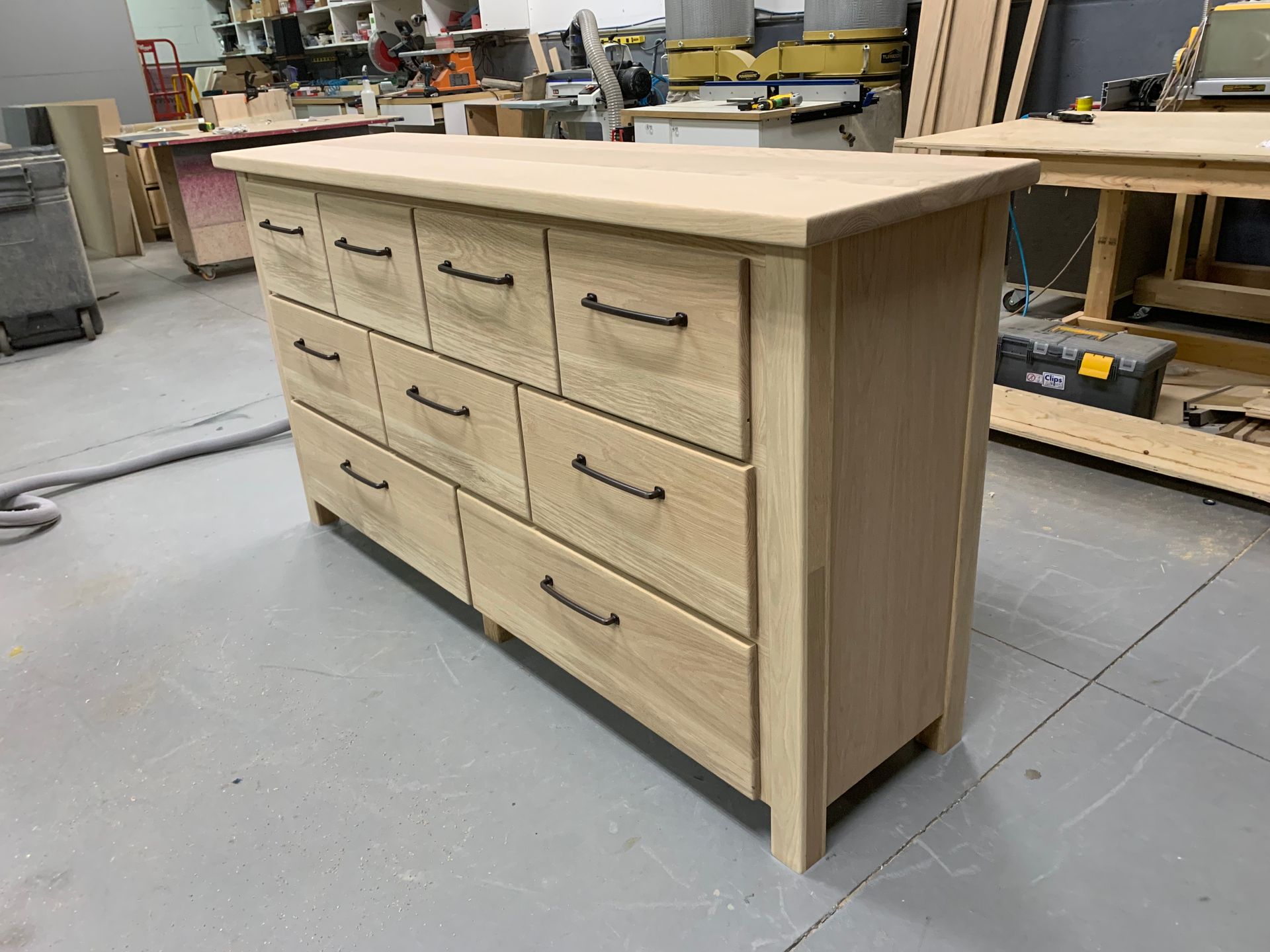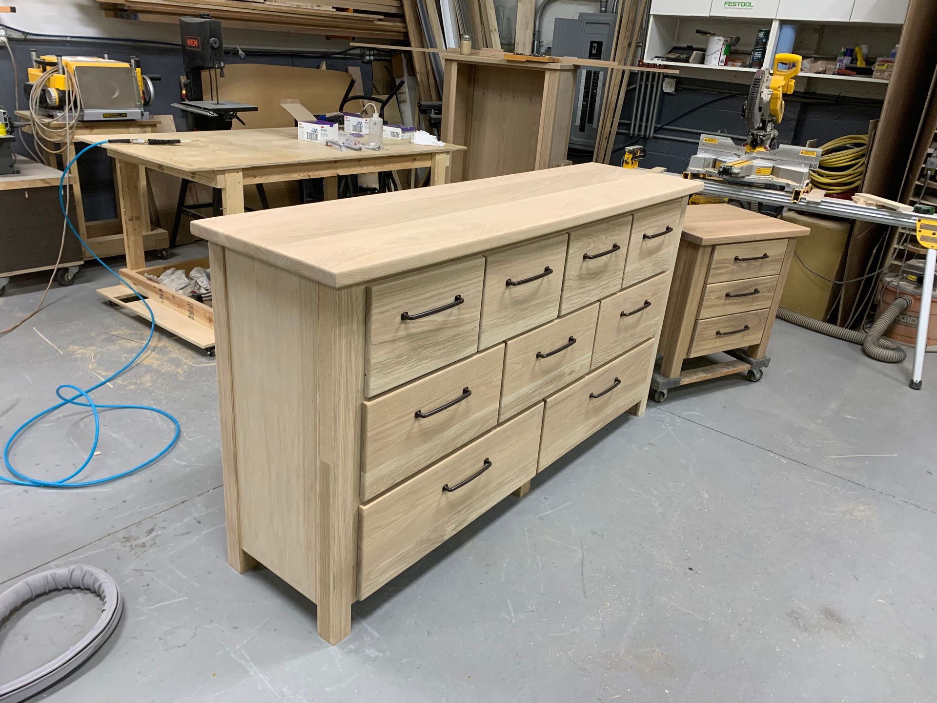 These pieces were an original "traditional" design for a young couple who had just purchased a white oak bed frame and wanted all new furniture to match. The build took longer than anticipated but turned out great! Finished with natural Rubio Monocoat, extra heavy duty undermount drawer slides, and antique brass pulls.