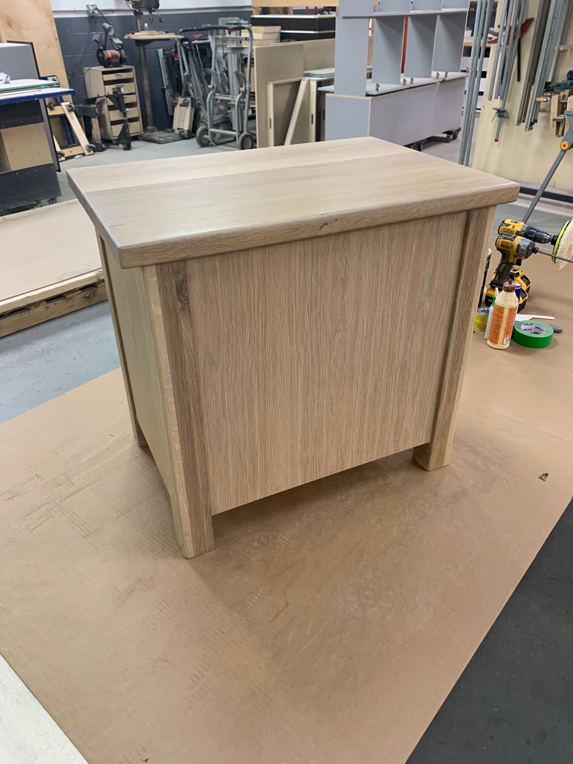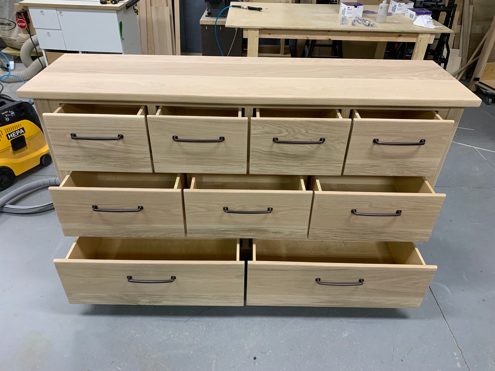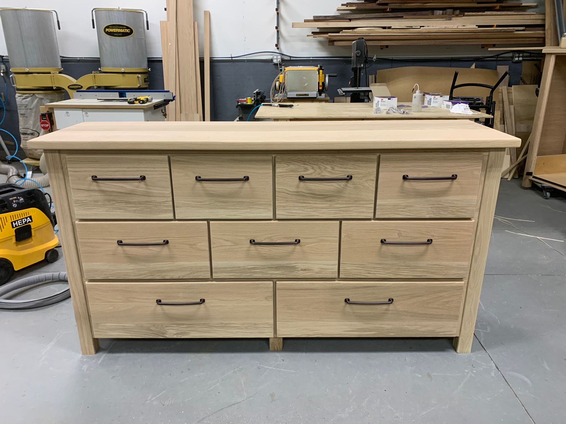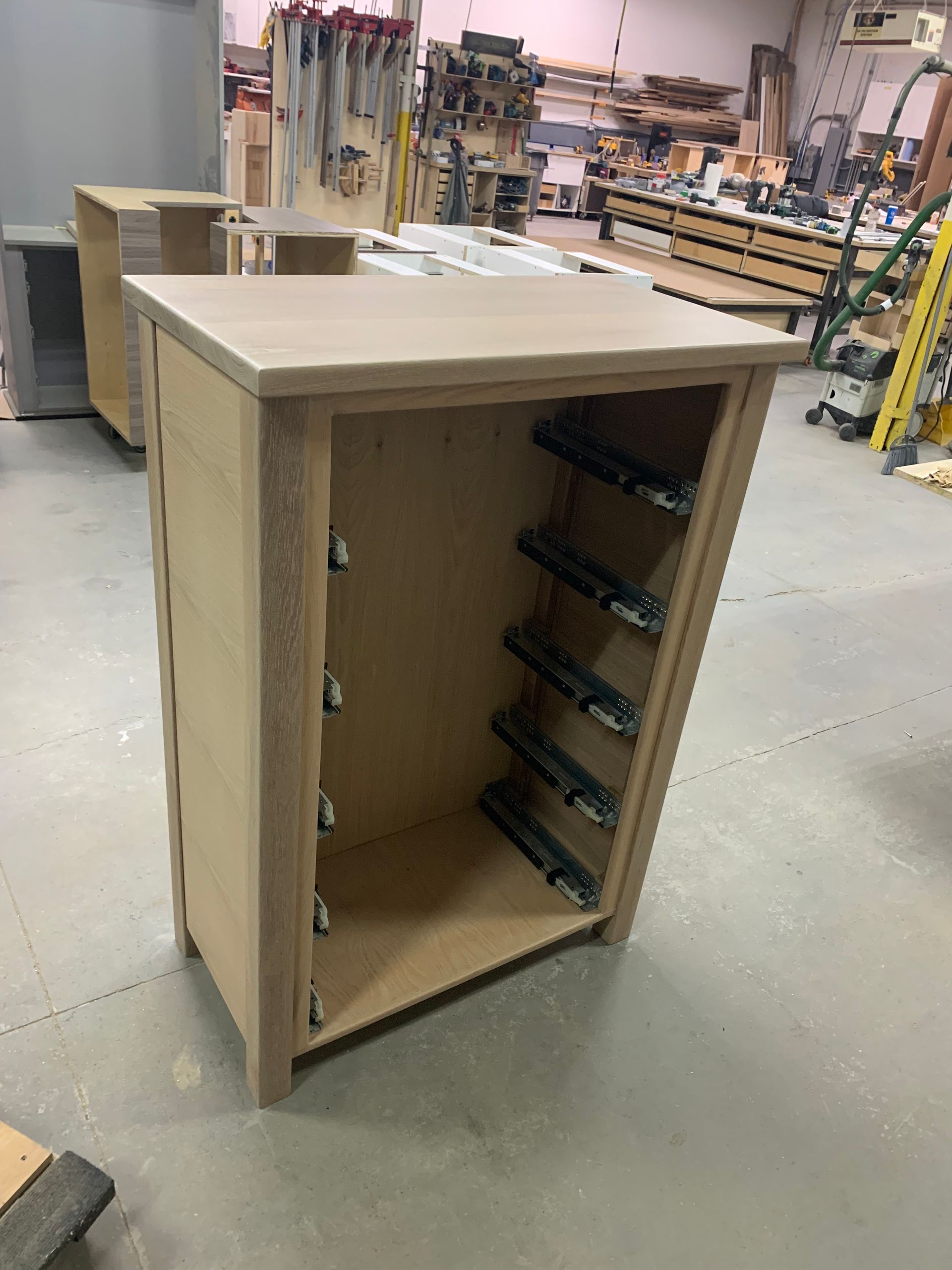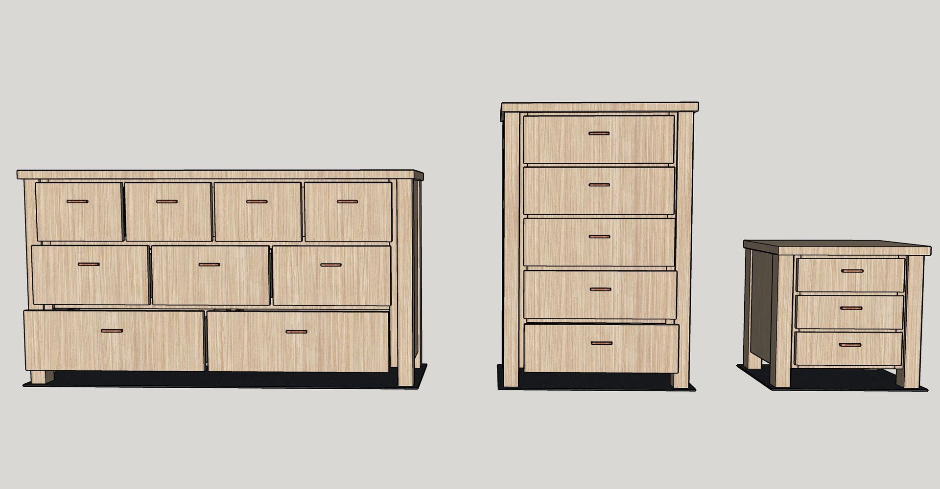 These pieces were an original "traditional" design for a young couple who had just purchased a white oak bed frame and wanted all new furniture to match. The build took longer than anticipated but turned out great! Finished with natural Rubio Monocoat, extra heavy duty undermount drawer slides, and antique brass pulls.