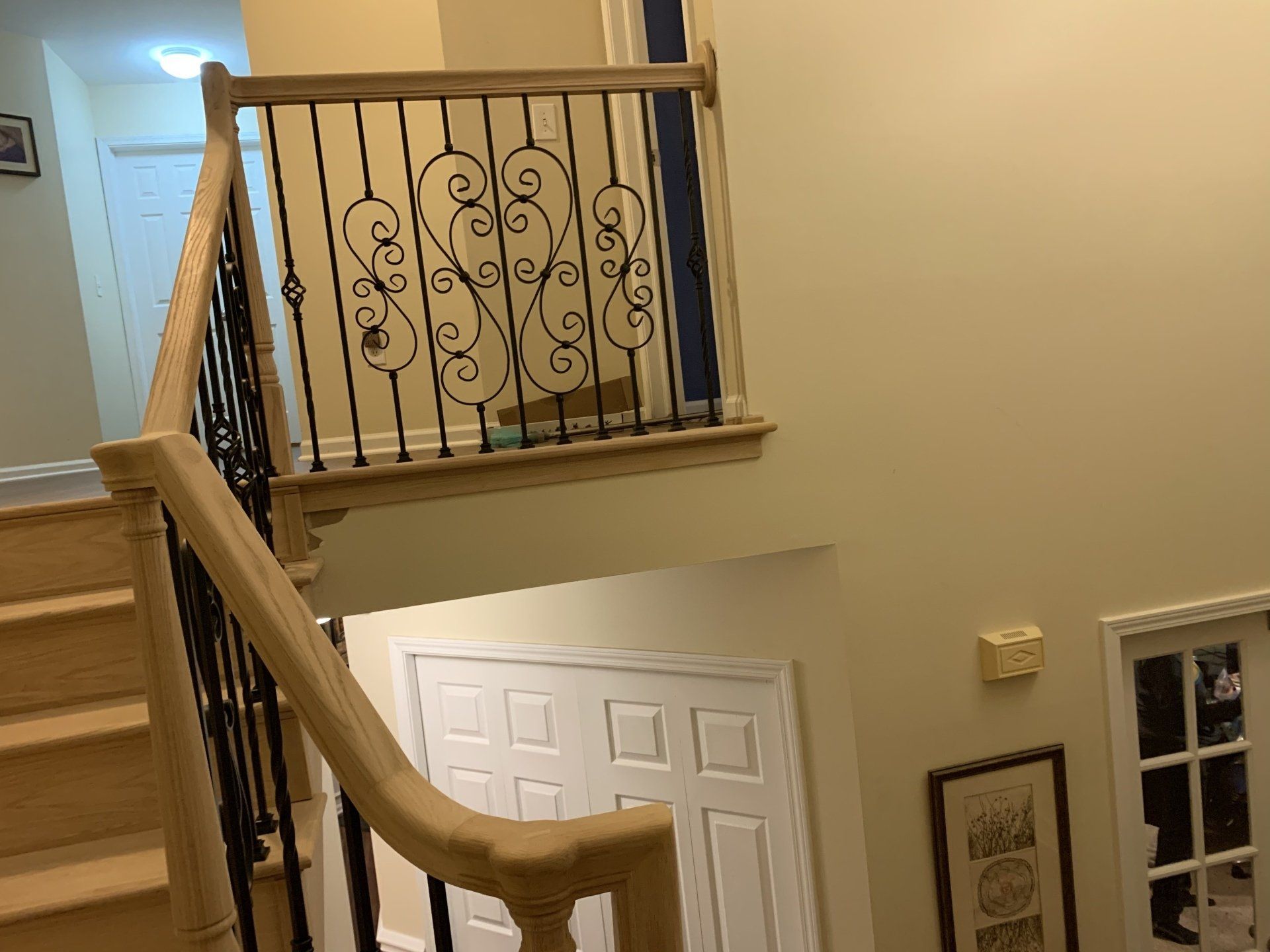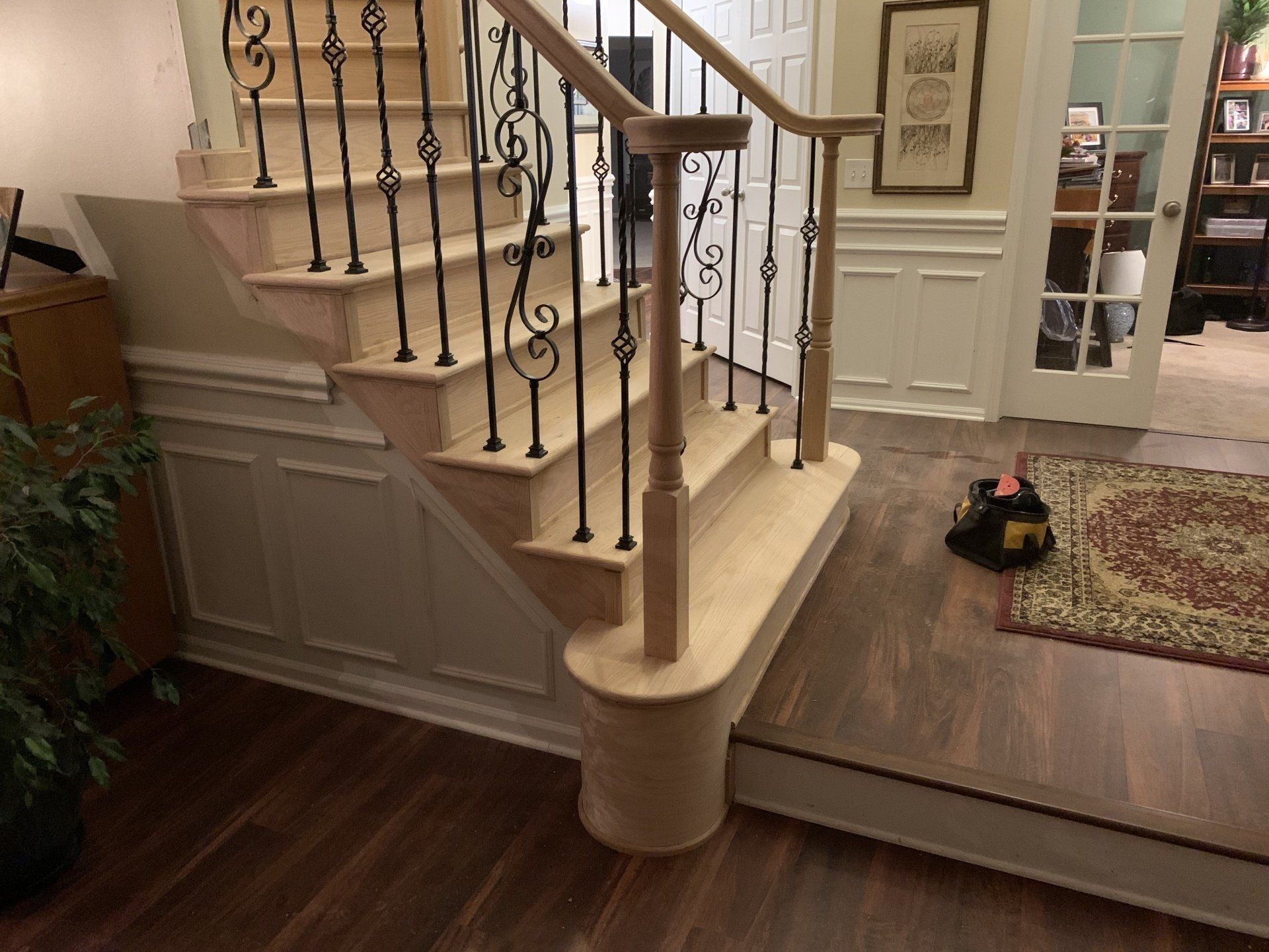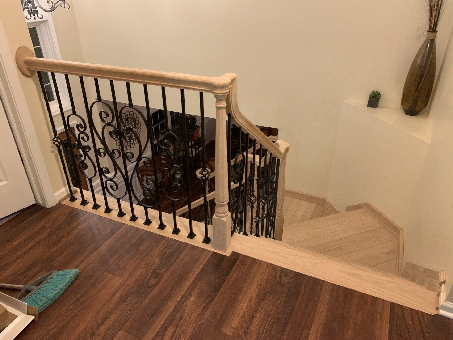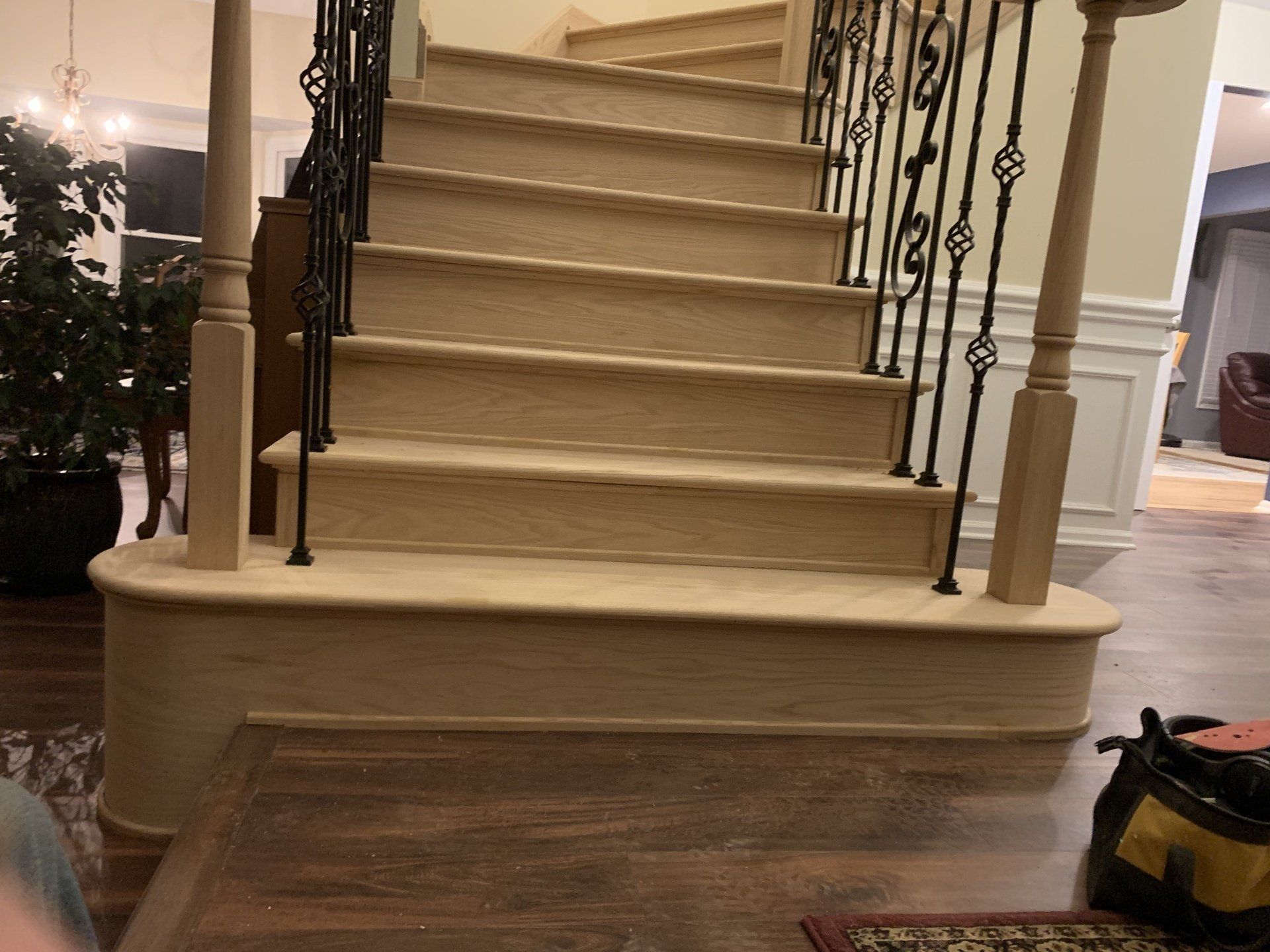 This was a custom stair remodel for a lovely customer in Novi. This made with all red oak treads, posts, rail, trim, and transition parts. It has an amazing pattern in its black powder coated iron spindles as well. I even finished off all the chair rail and box trim on the walls for free because she was so pleasant to work with. Hopefully I can get some pictures when it's all stained and finished...