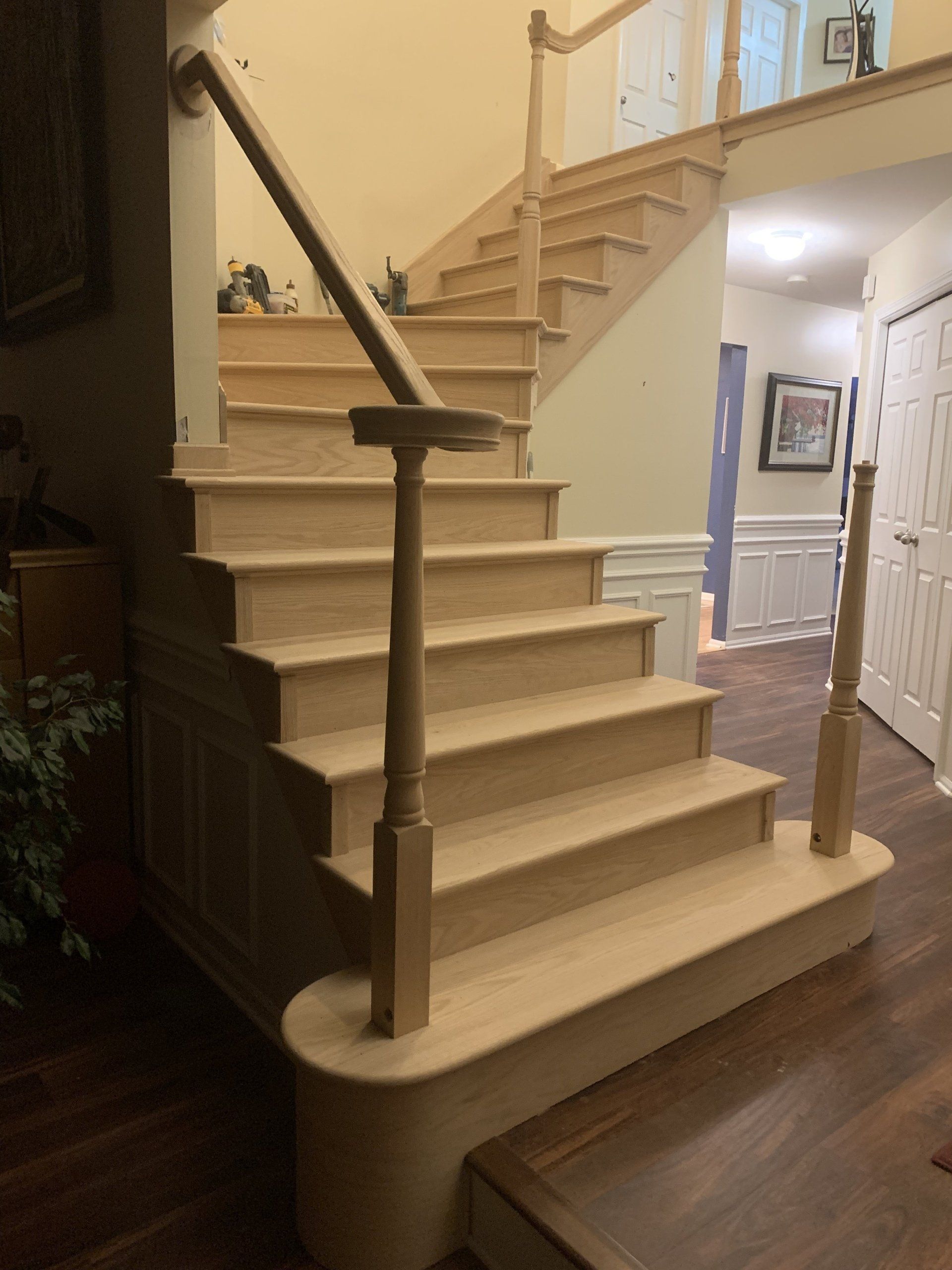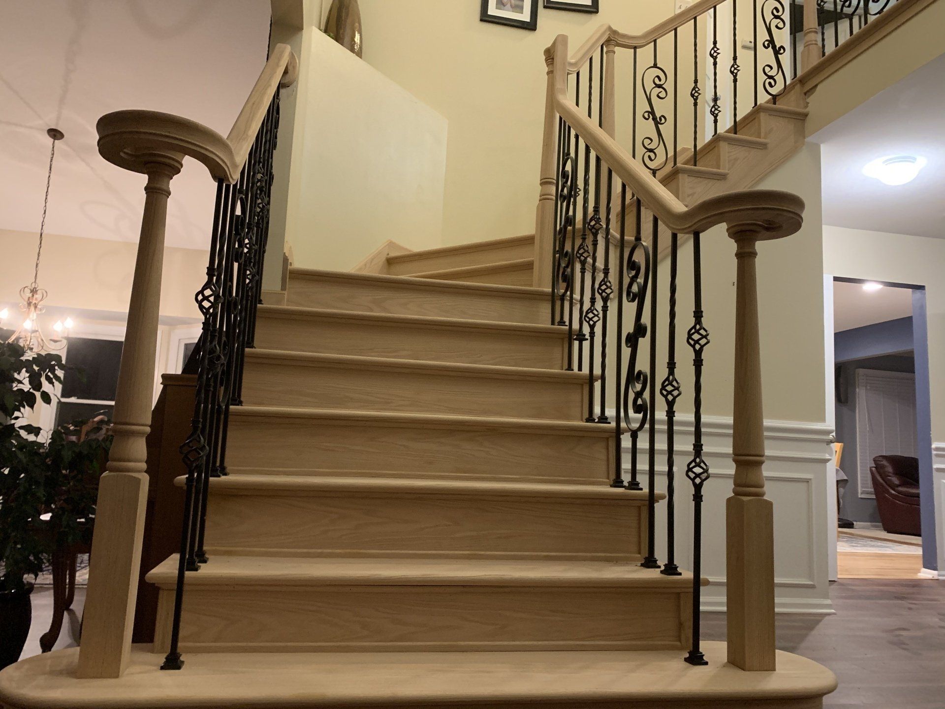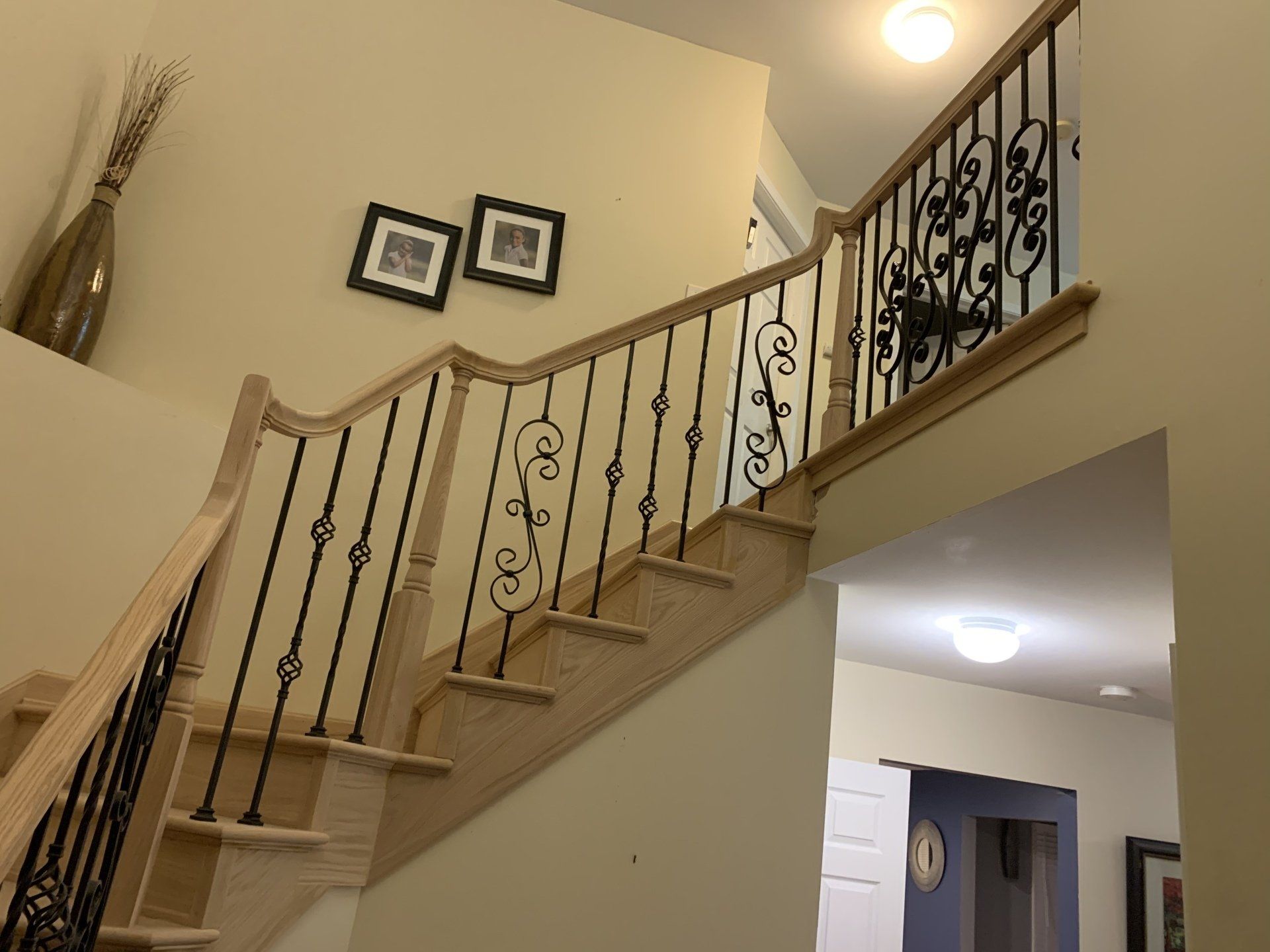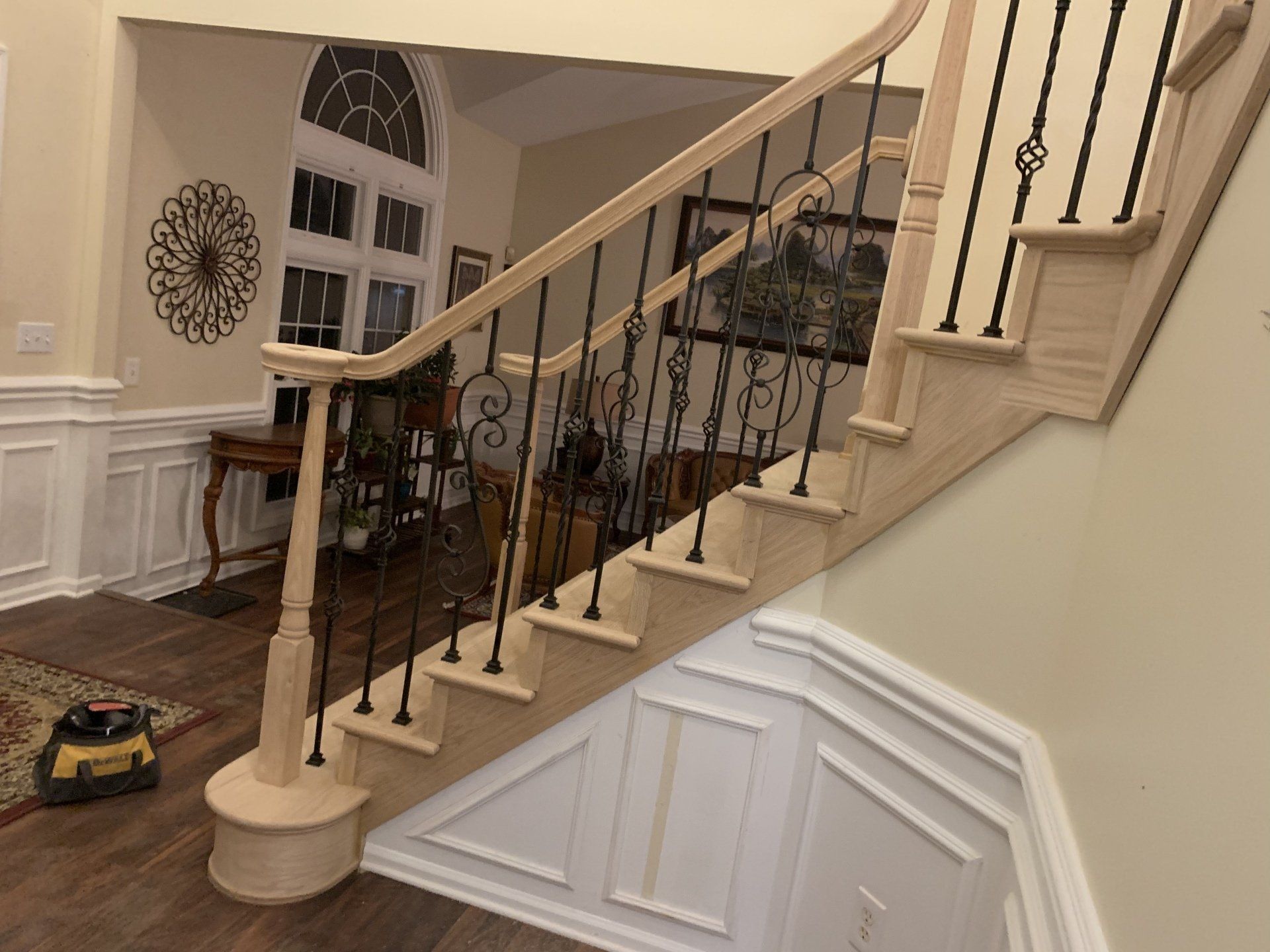 This was a custom stair remodel for a lovely customer in Novi. This made with all red oak treads, posts, rail, trim, and transition parts. It has an amazing pattern in its black powder coated iron spindles as well. I even finished off all the chair rail and box trim on the walls for free because she was so pleasant to work with. Hopefully I can get some pictures when it's all stained and finished...