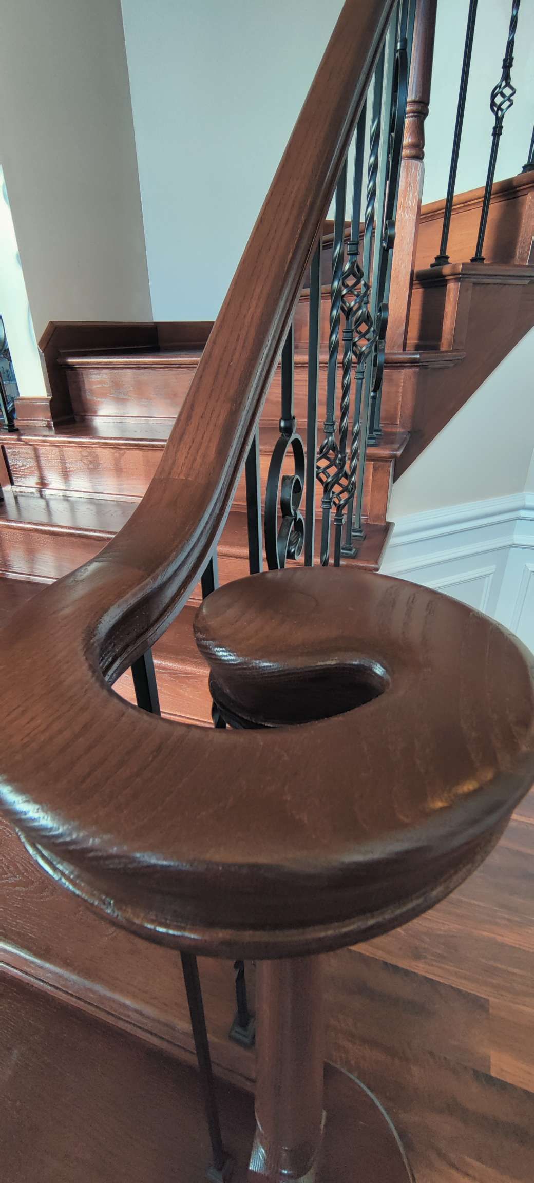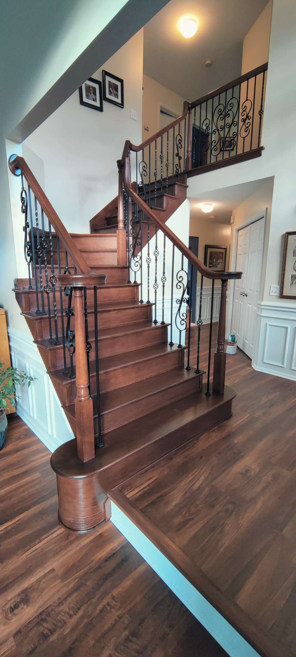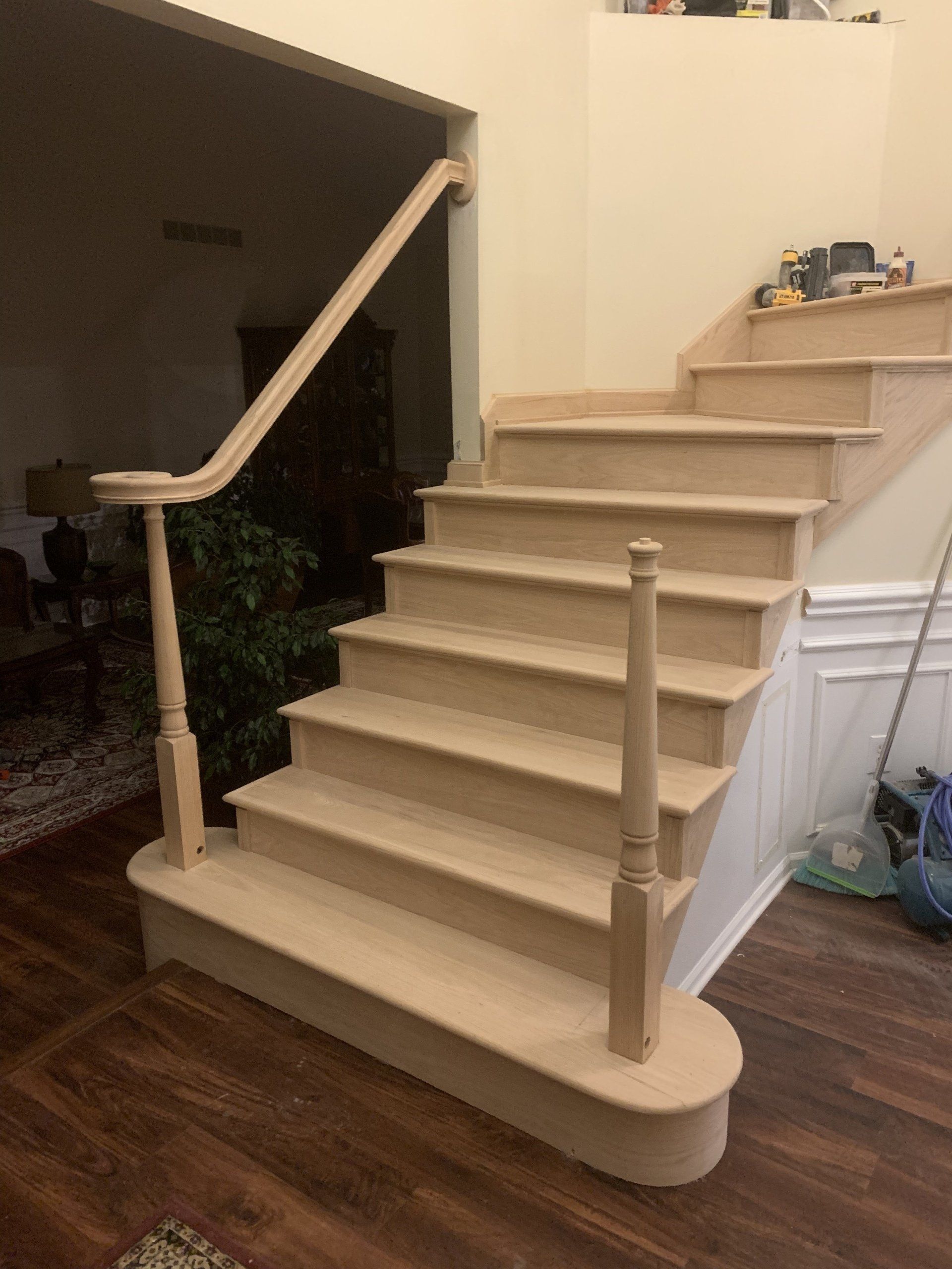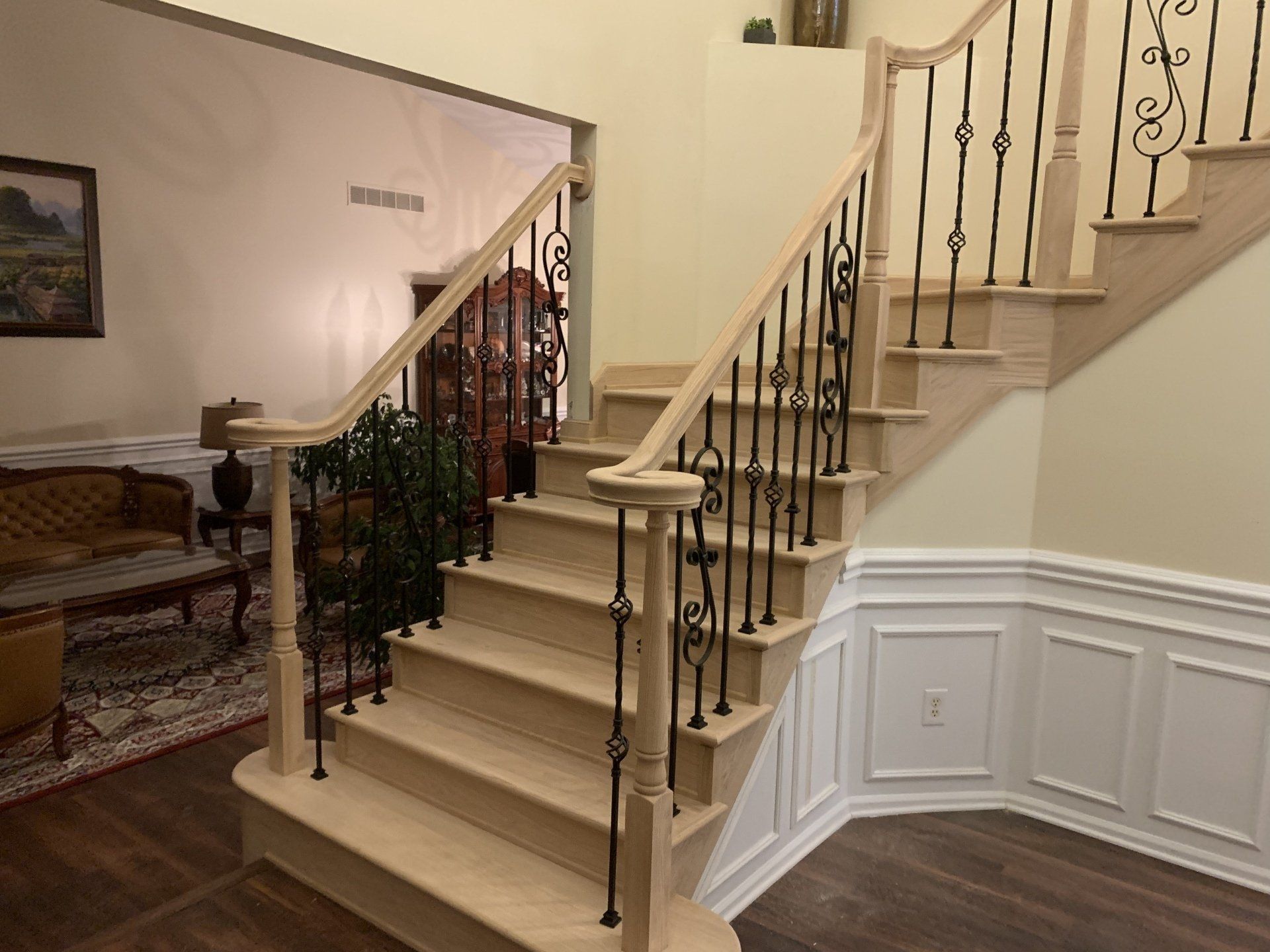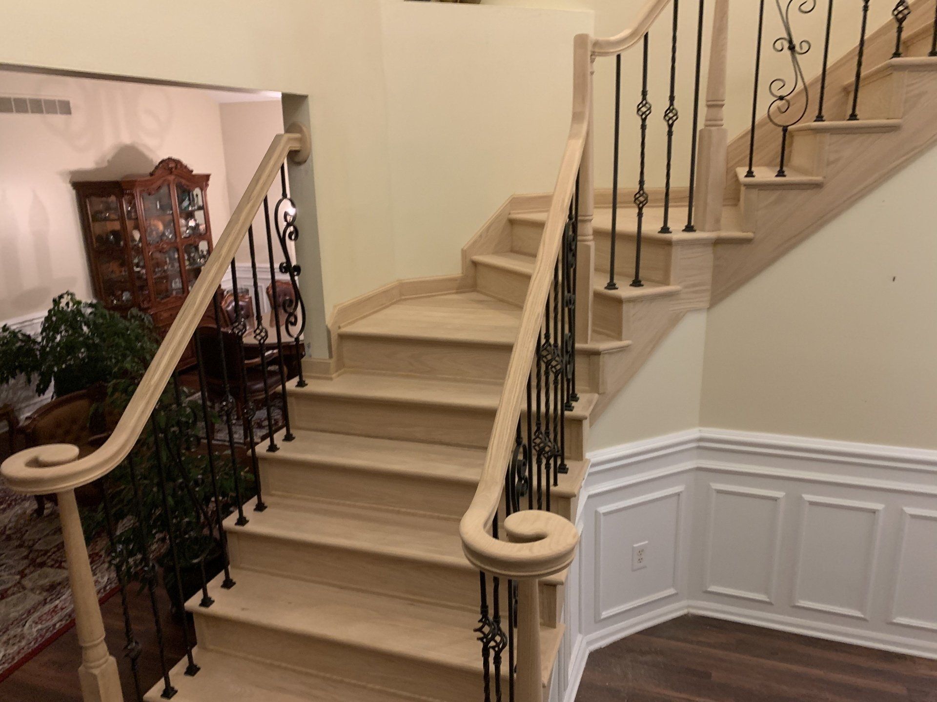 This was a custom stair remodel for a lovely customer in Novi. This made with all red oak treads, posts, rail, trim, and transition parts. It has an amazing pattern in its black powder coated iron spindles as well. I even finished off all the chair rail and box trim on the walls for free because she was so pleasant to work with. Hopefully I can get some pictures when it's all stained and finished...