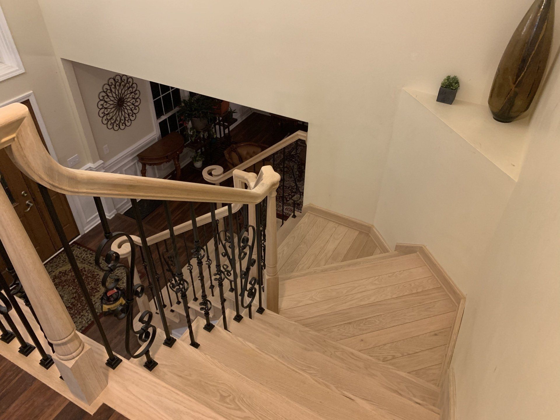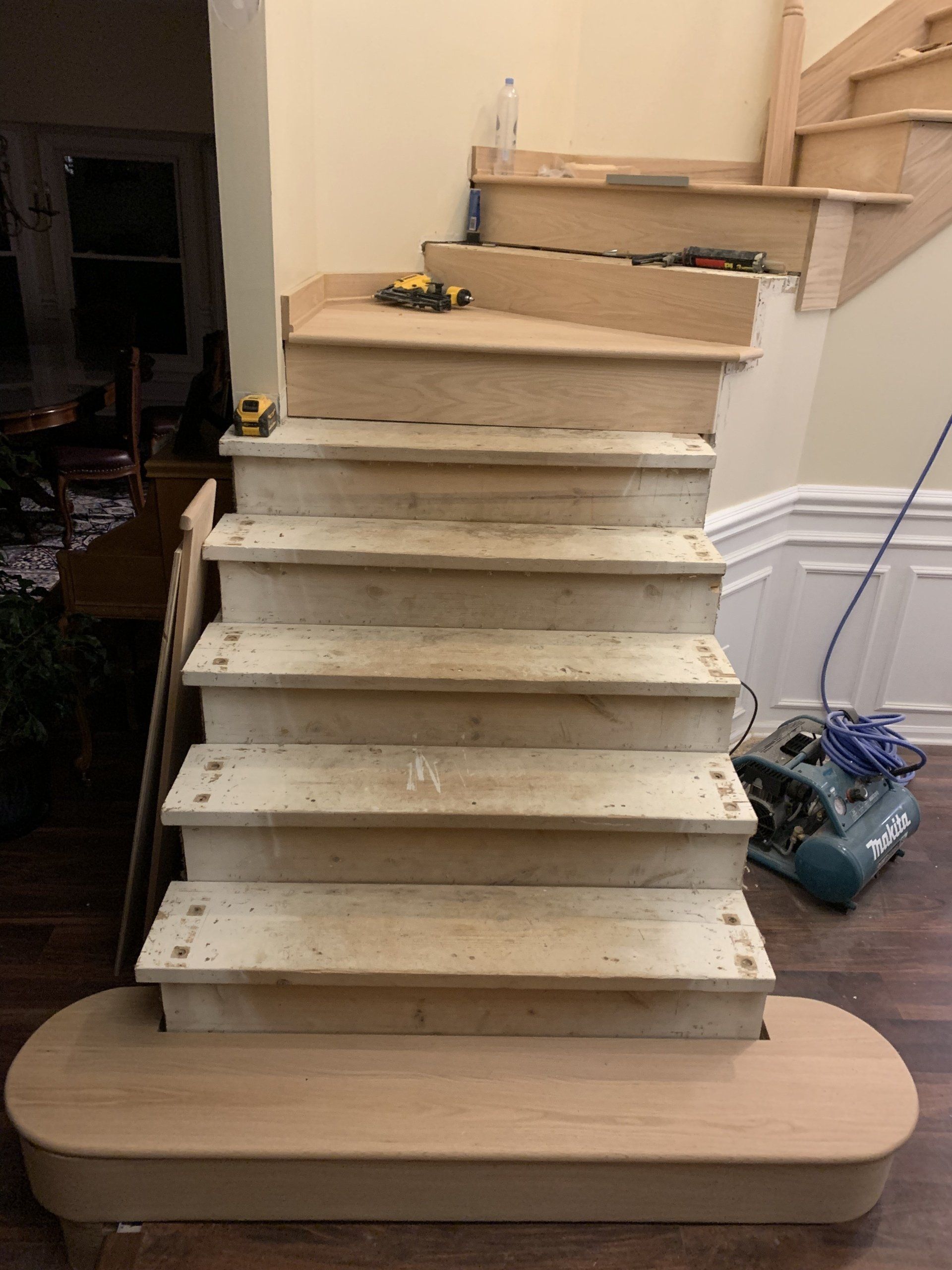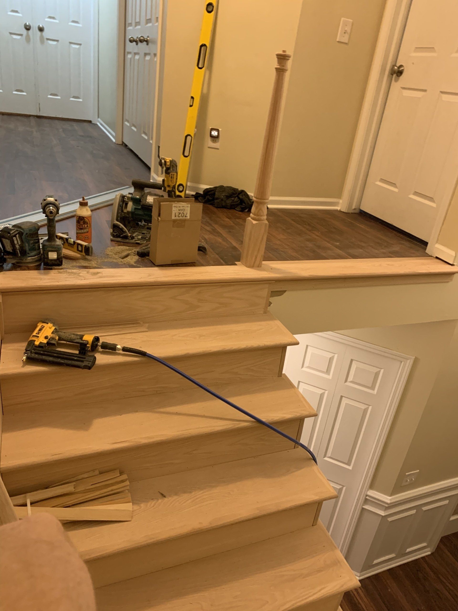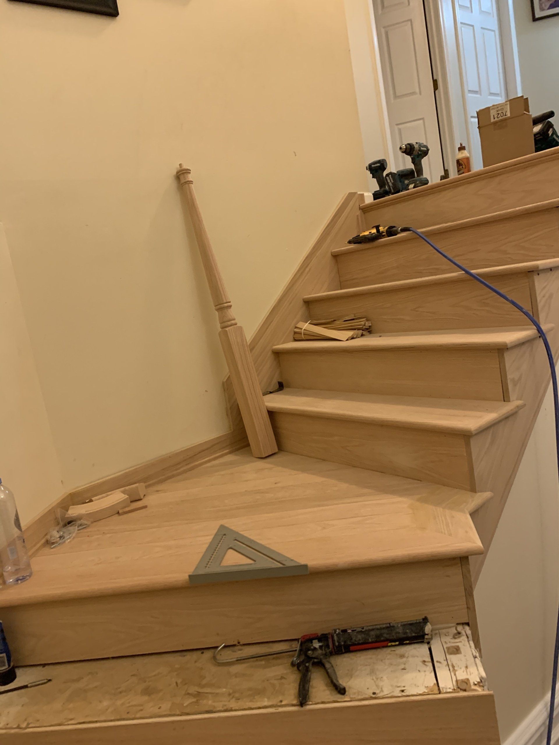 This was a custom stair remodel for a lovely customer in Novi. This made with all red oak treads, posts, rail, trim, and transition parts. It has an amazing pattern in its black powder coated iron spindles as well. I even finished off all the chair rail and box trim on the walls for free because she was so pleasant to work with. Hopefully I can get some pictures when it's all stained and finished...