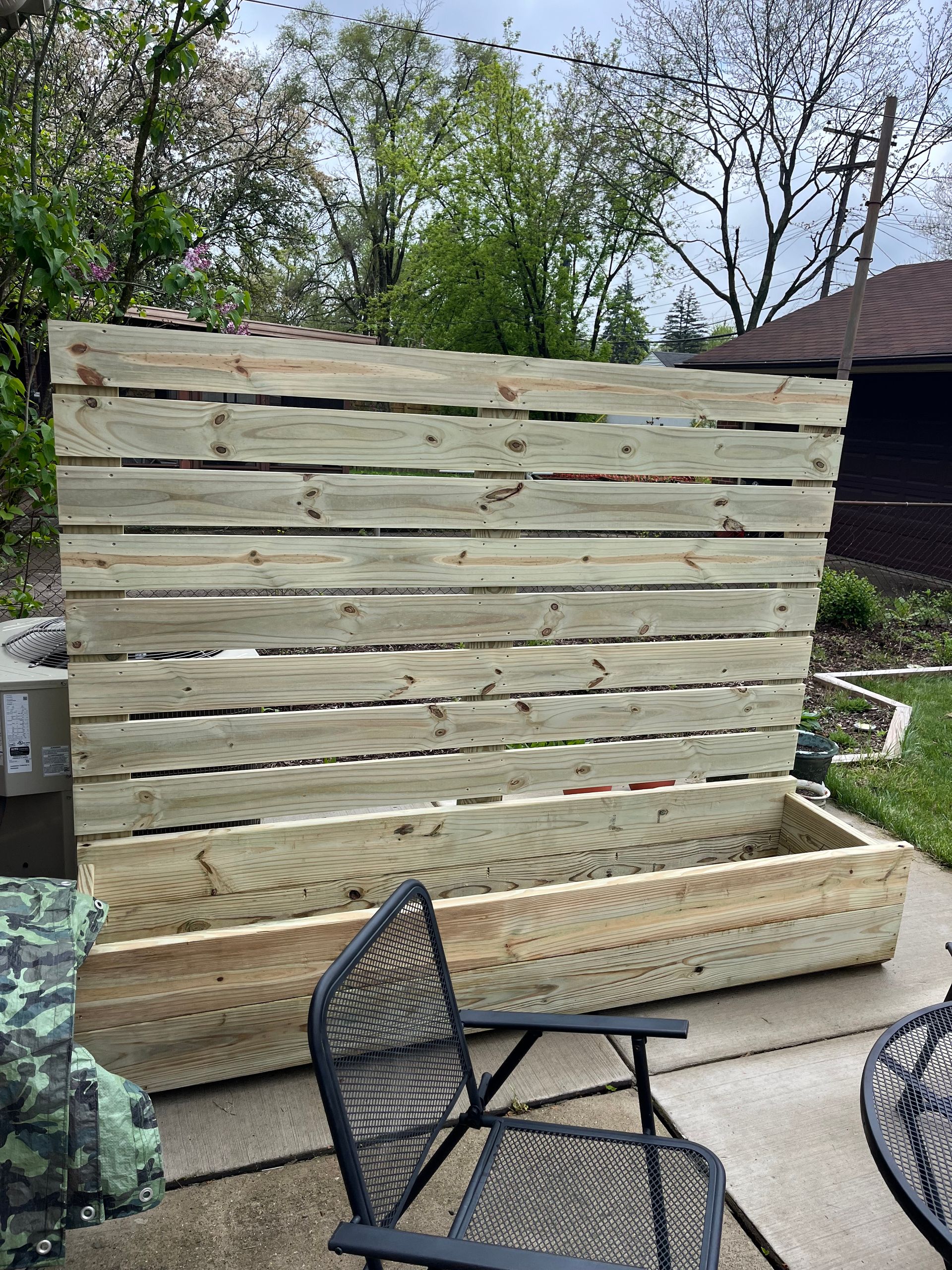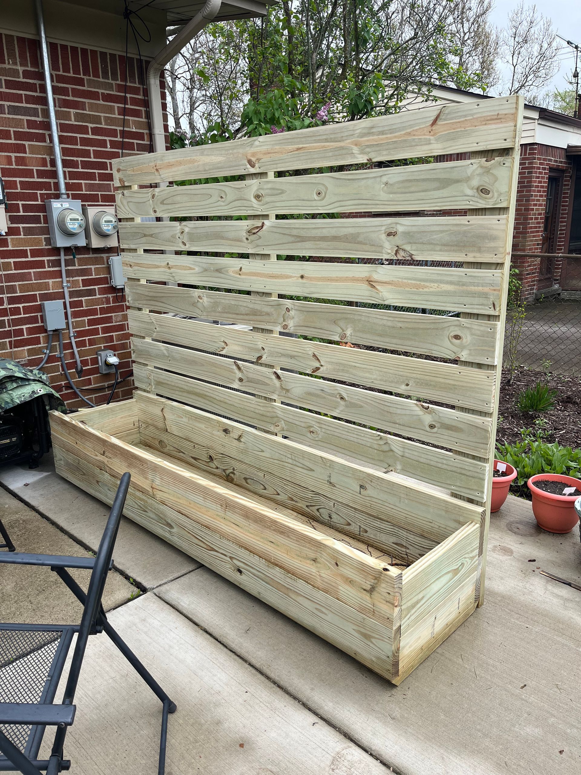 Built a couple of these for various different areas of the customers yard. They are BIG! Made from treated southern yellow pine, these are made to withstand the weather and hold a lot of plants for years to come. 92" long, 23" deep, 71" tall.