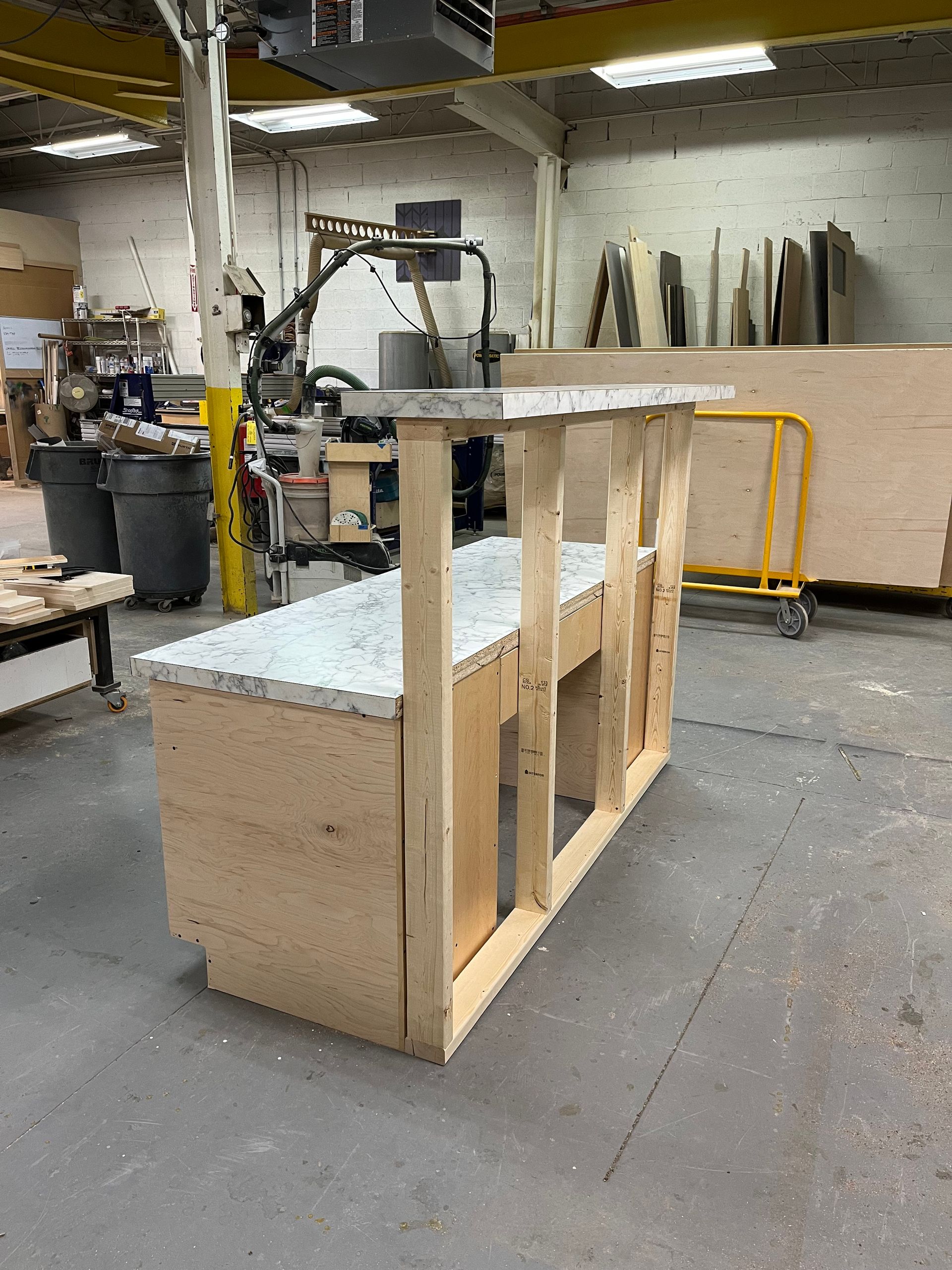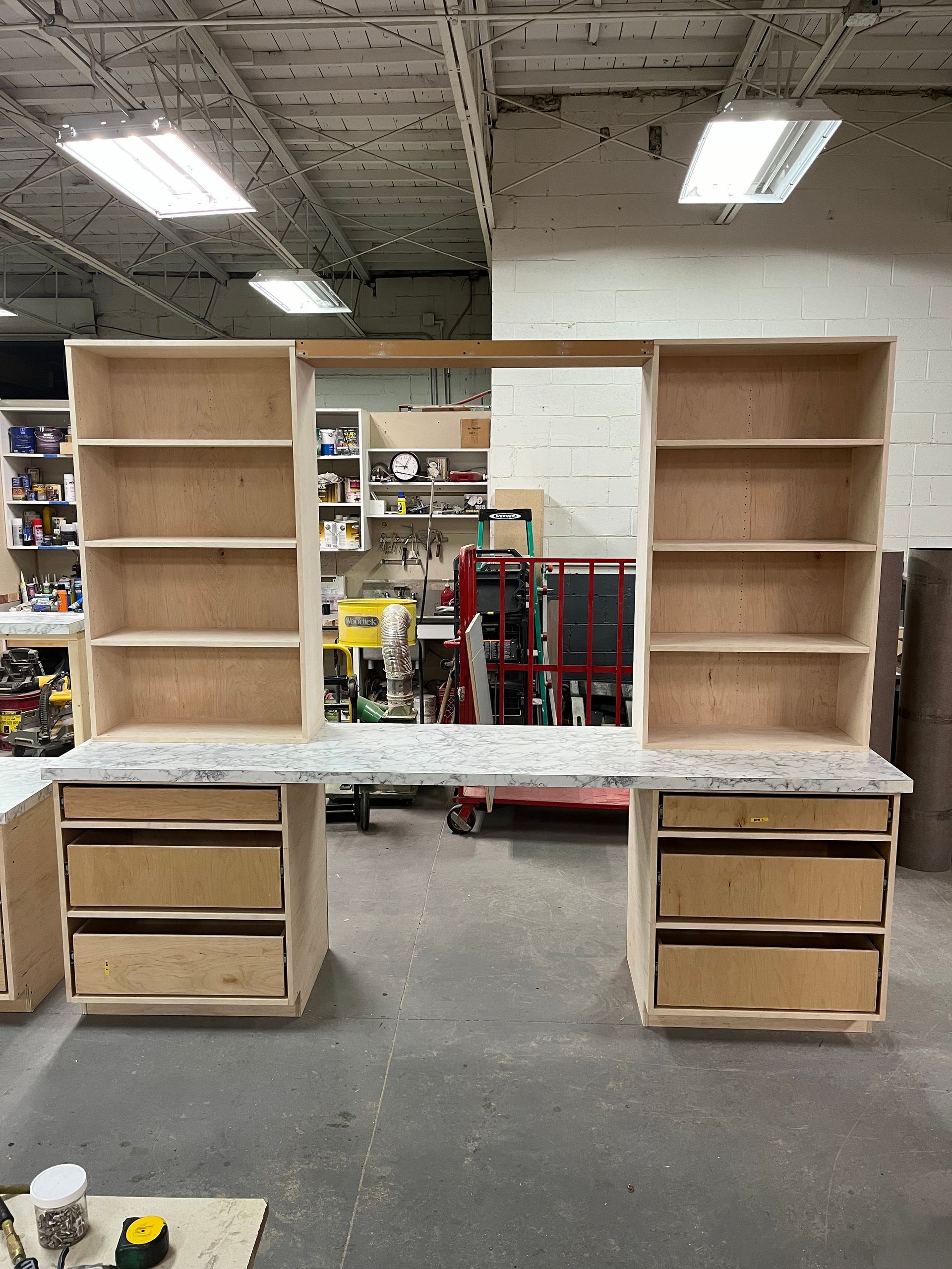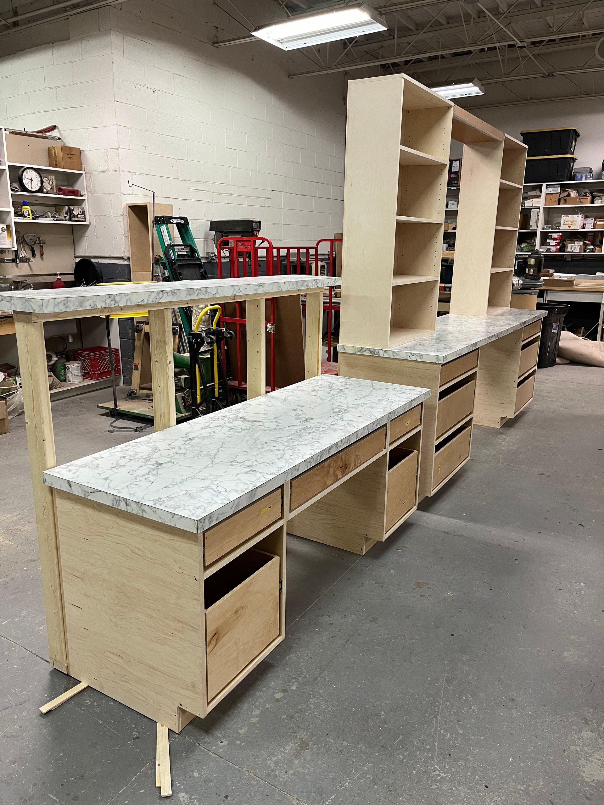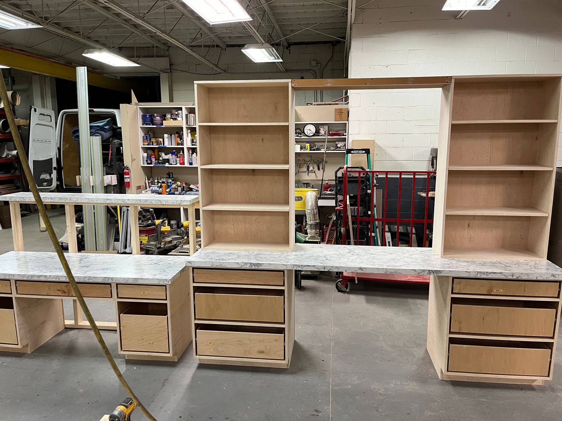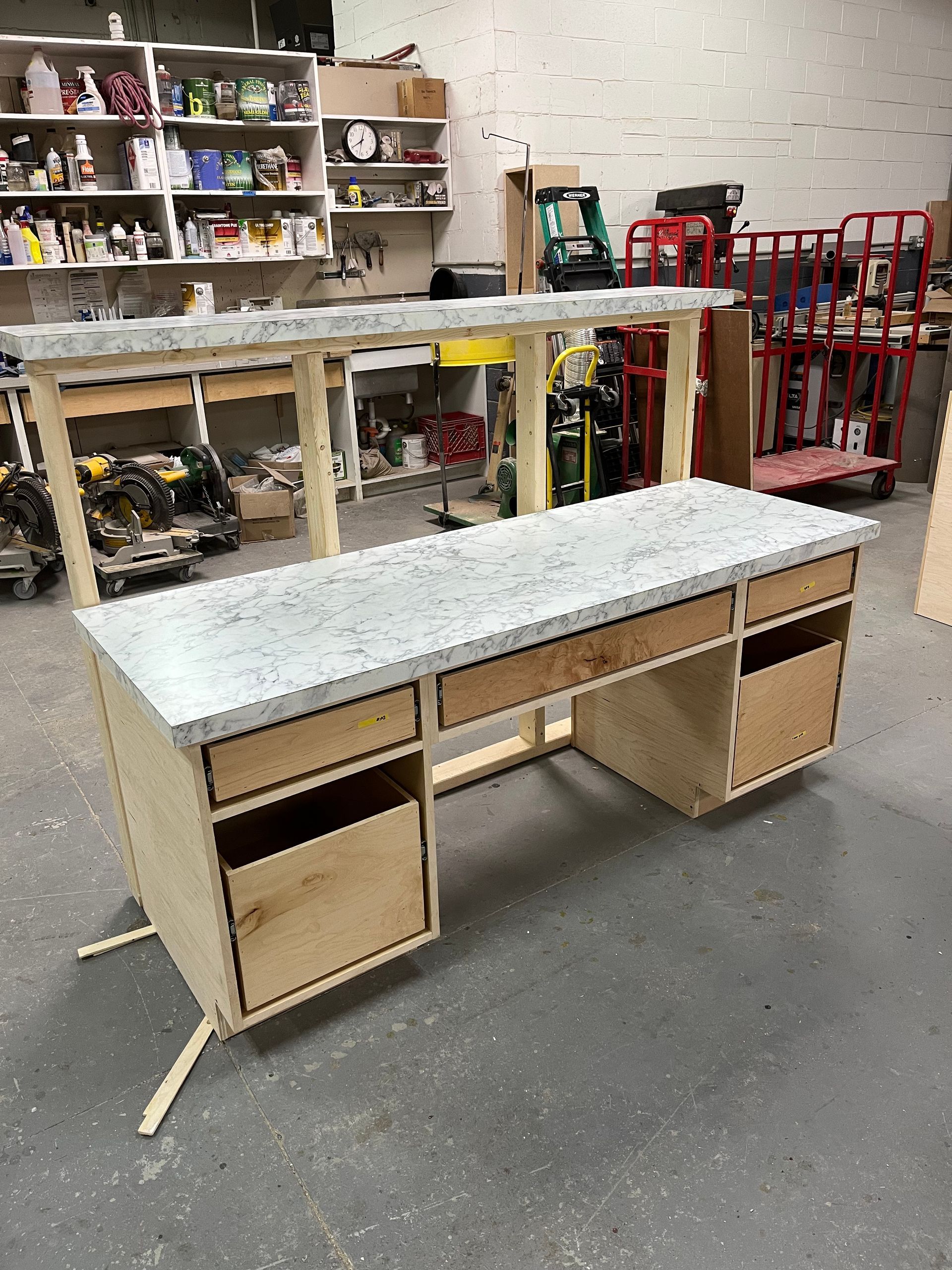 Pretty standard reception Desk with a file cabinet area. Made from birch ply as the customer wanted to have them painted in place. Laminate countertops. There was a lot unfinished after the install as other trades needed to come in and do drywall, electrical, paint, etc... sorry no better pictures!