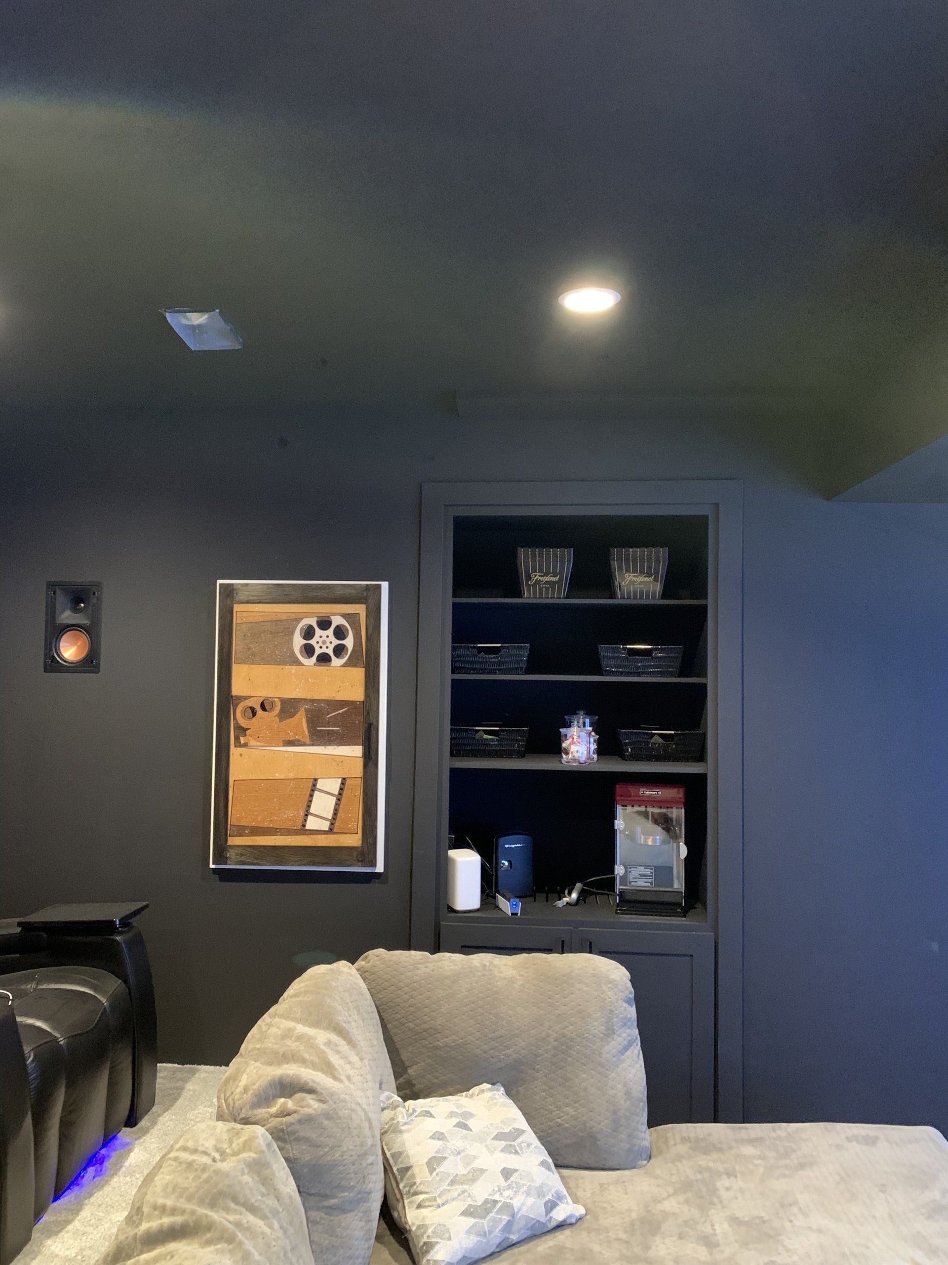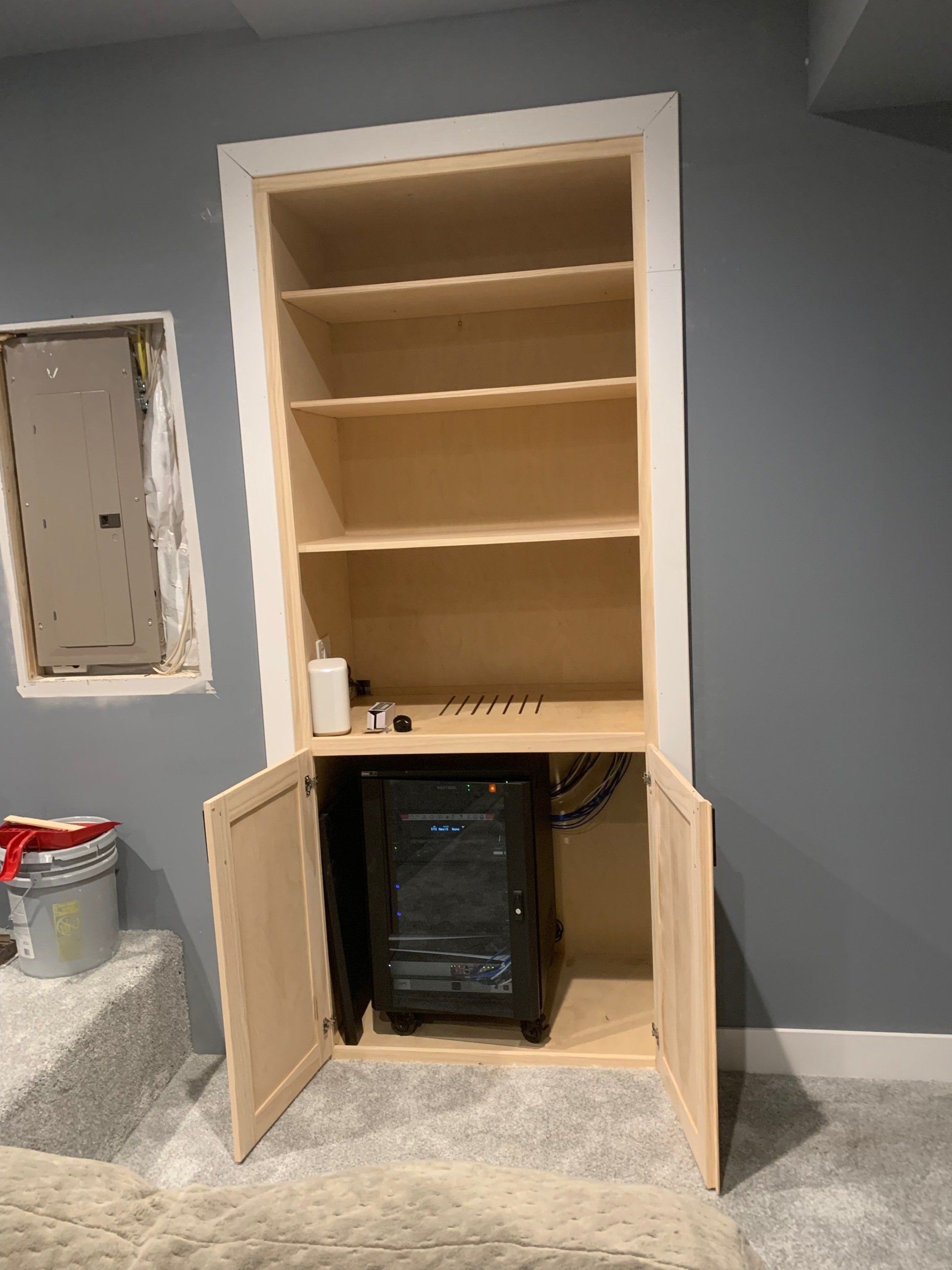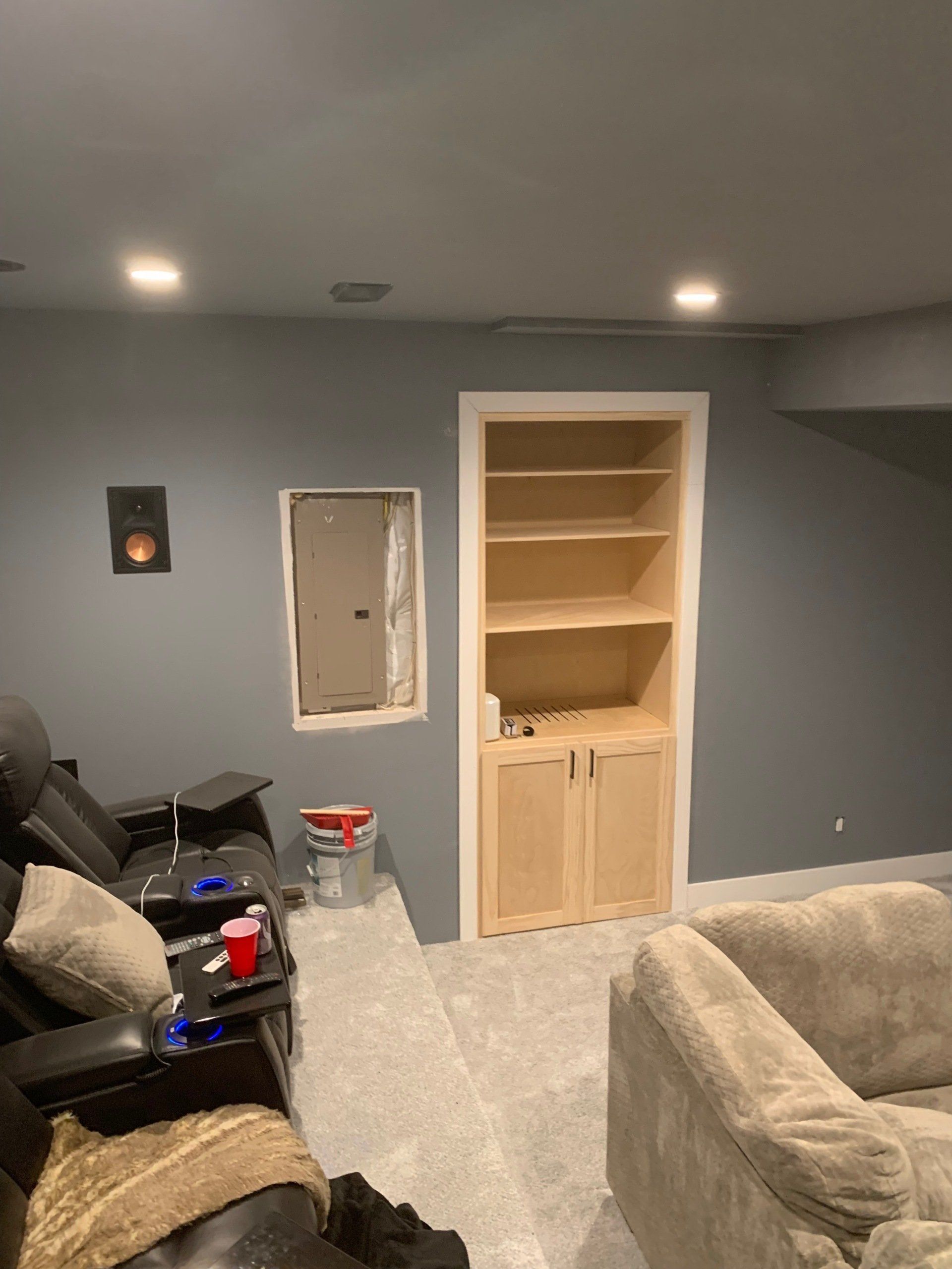 As you can see, there was a space to fill... so I designed, built, installed, and trimmed this cabinet to house all of the audio visual equipment for this theater room. It is made from 3/4" plywood and edged with pine so that everything could be painted. The hardest part was connecting all the equipment after all the cables had been run through the cabinet! The homeowner decided to make the shelves into a concession stand and it all turned out fantastic!