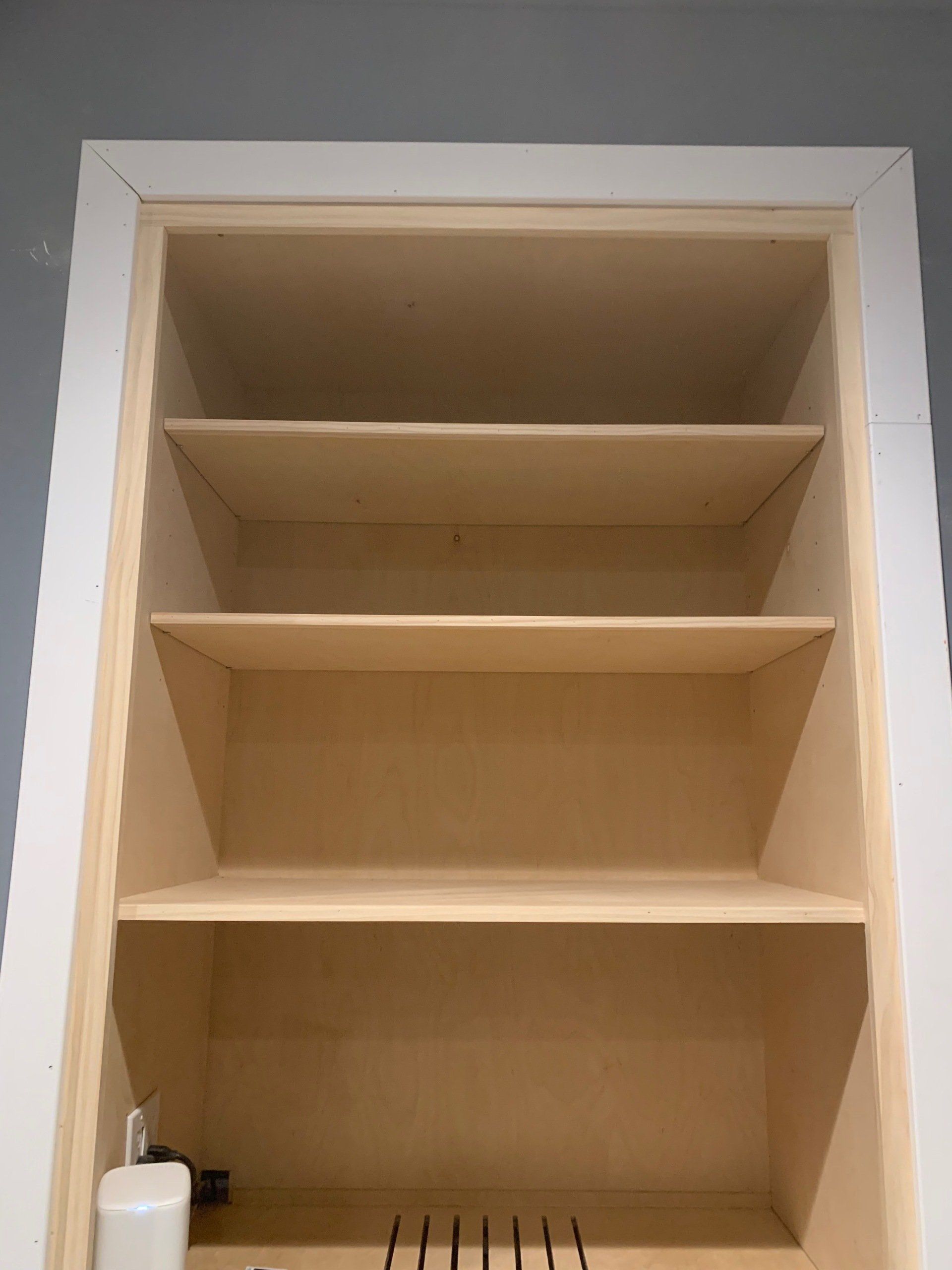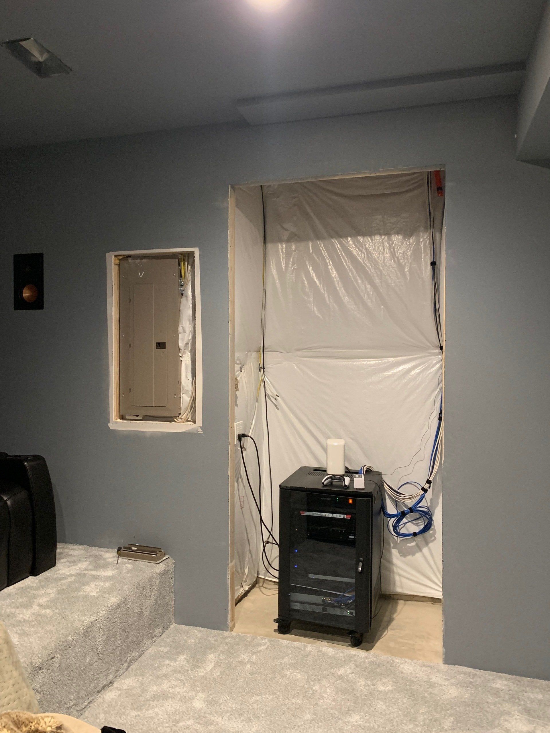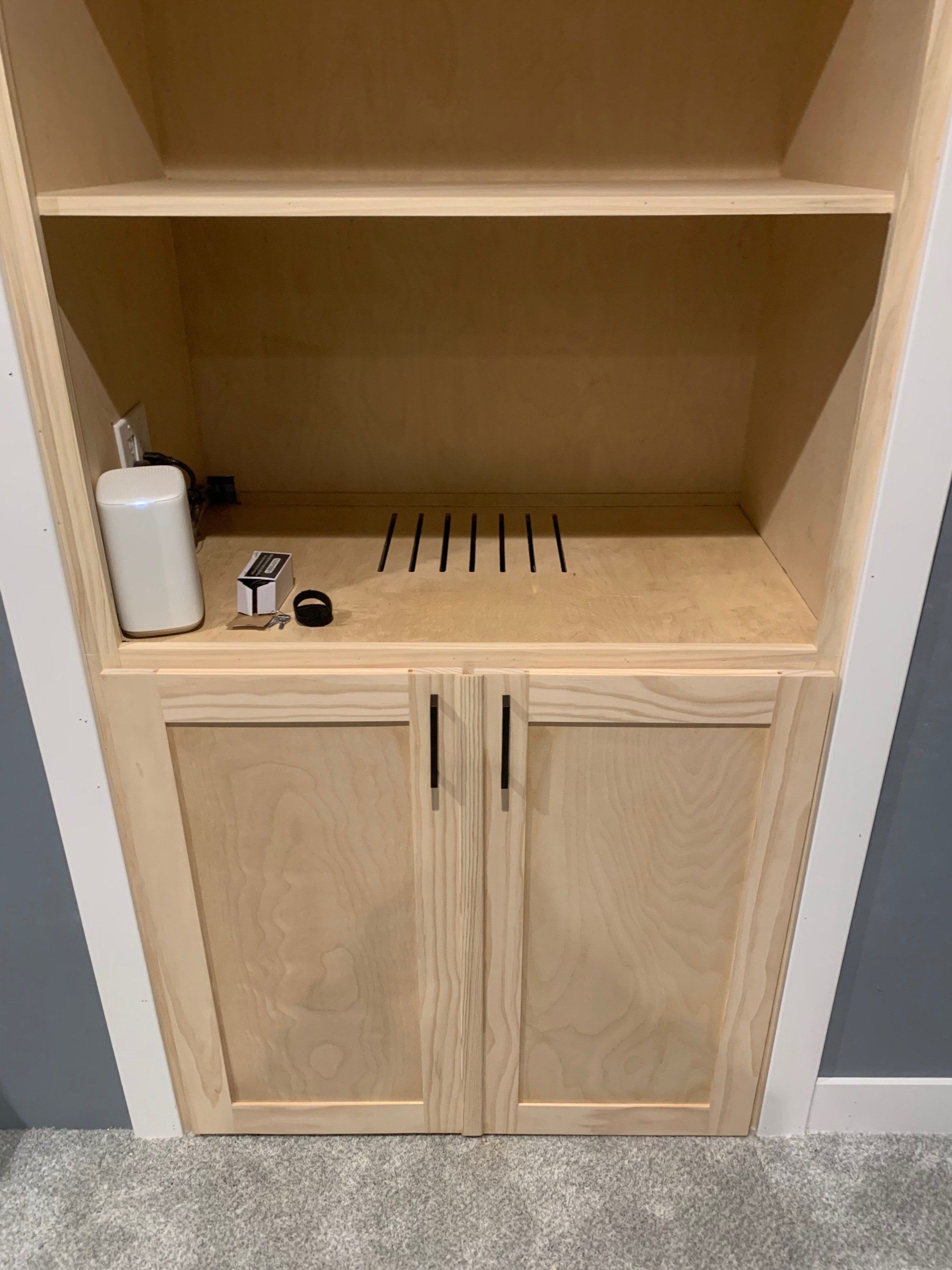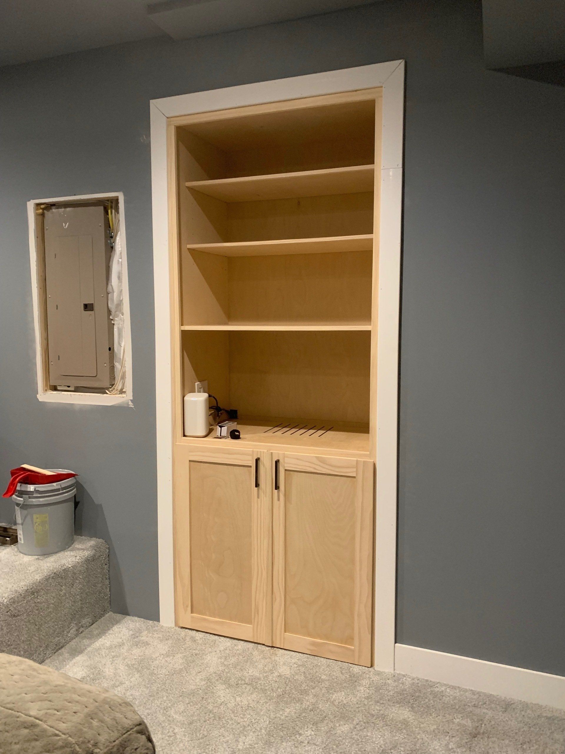 As you can see, there was a space to fill... so I designed, built, installed, and trimmed this cabinet to house all of the audio visual equipment for this theater room. It is made from 3/4" plywood and edged with pine so that everything could be painted. The hardest part was connecting all the equipment after all the cables had been run through the cabinet! The homeowner decided to make the shelves into a concession stand and it all turned out fantastic!