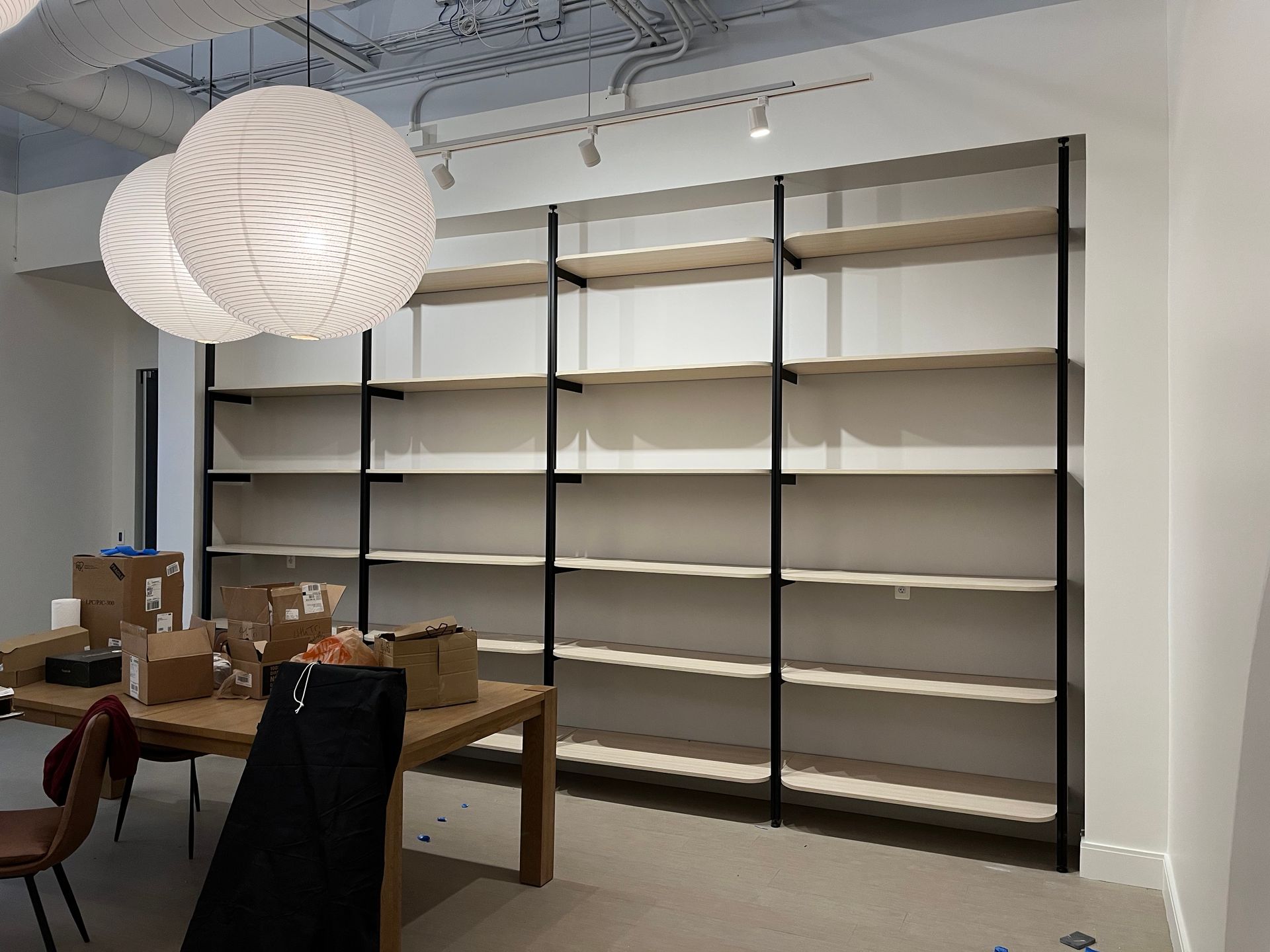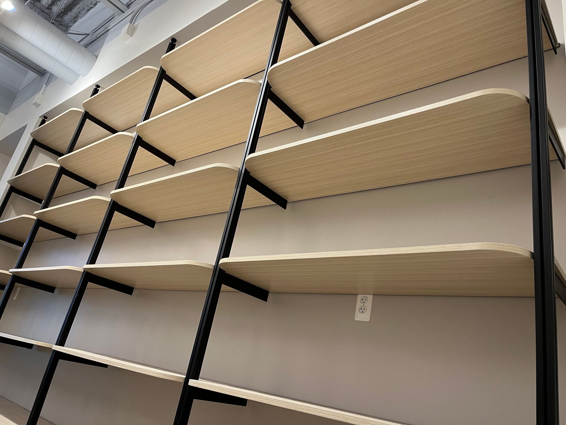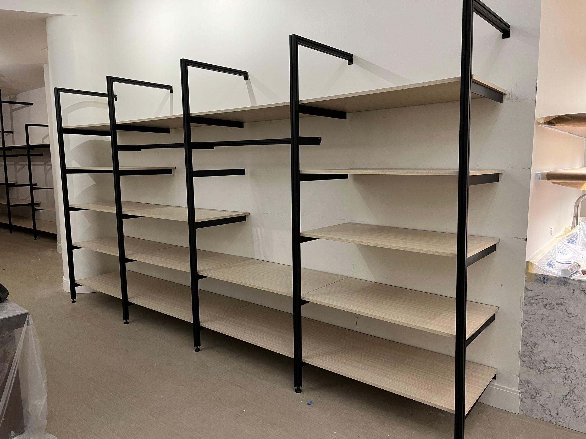 I don't normally do commercial work, but here's something I was offered recently. The hardware is Raxx shelving and all the shelves are made from Tafisa pre-finished melamine board with matching edge banding and 1/8" steel back straps. Also did some floating shelves in a cubby.
