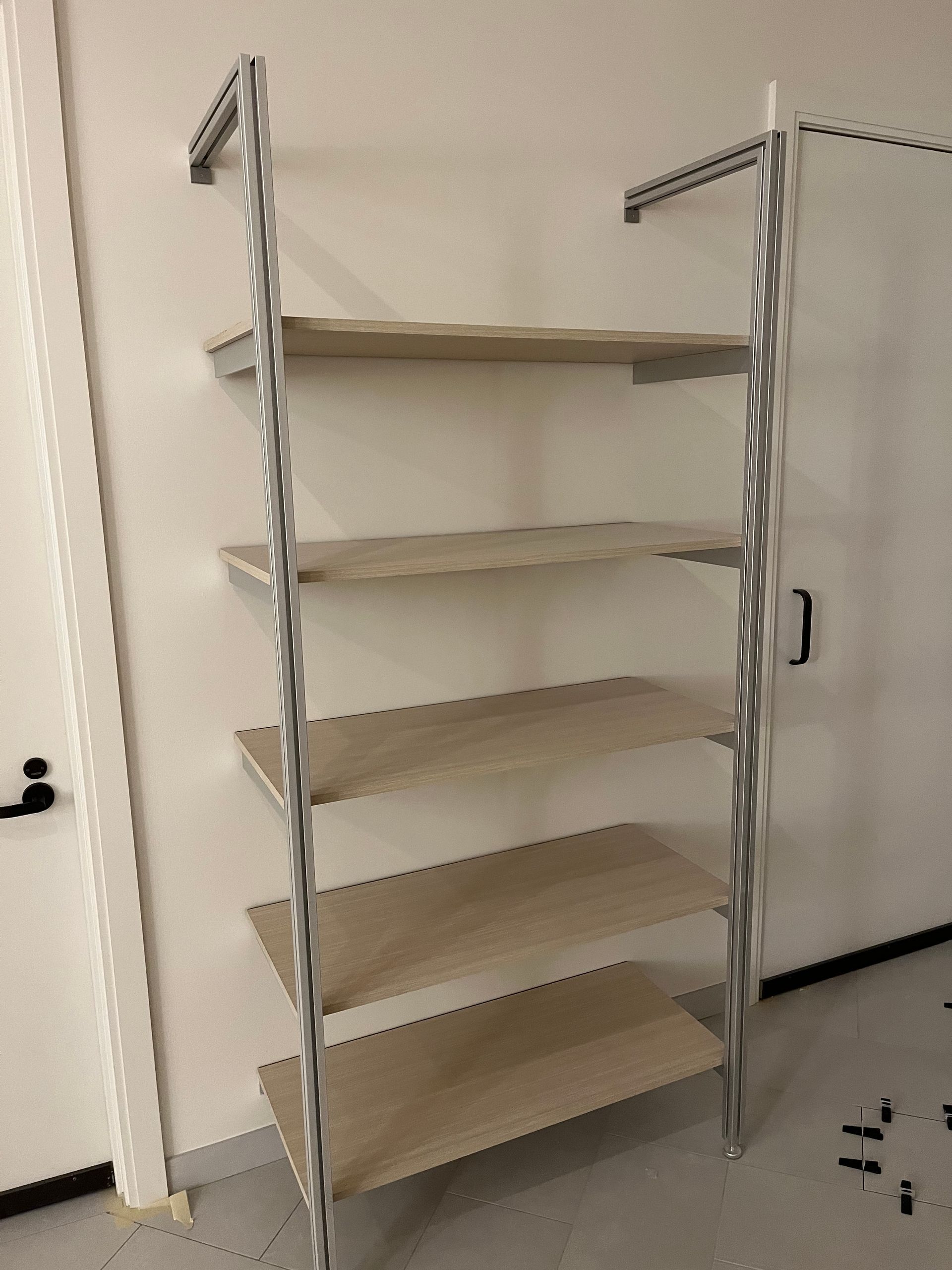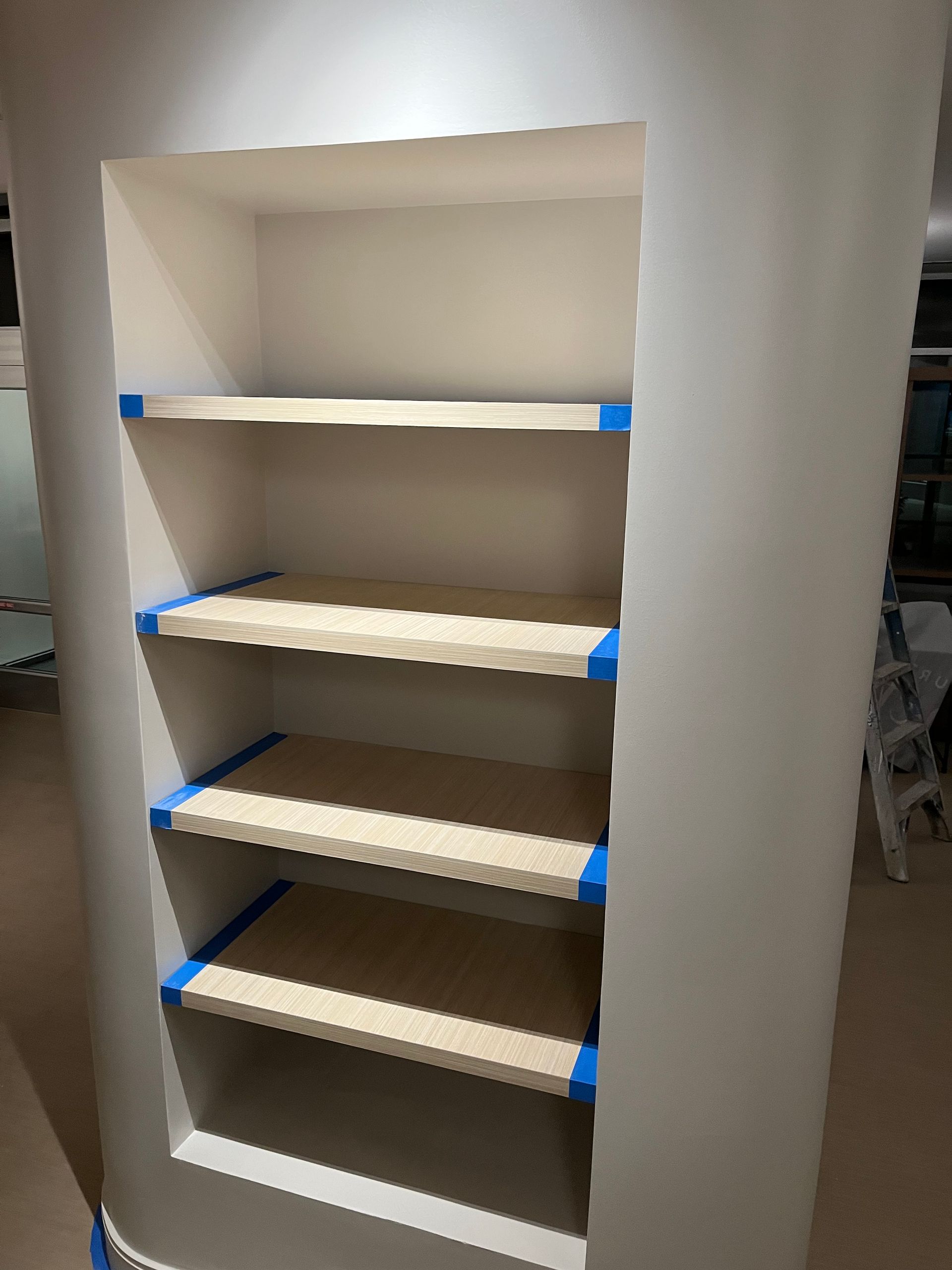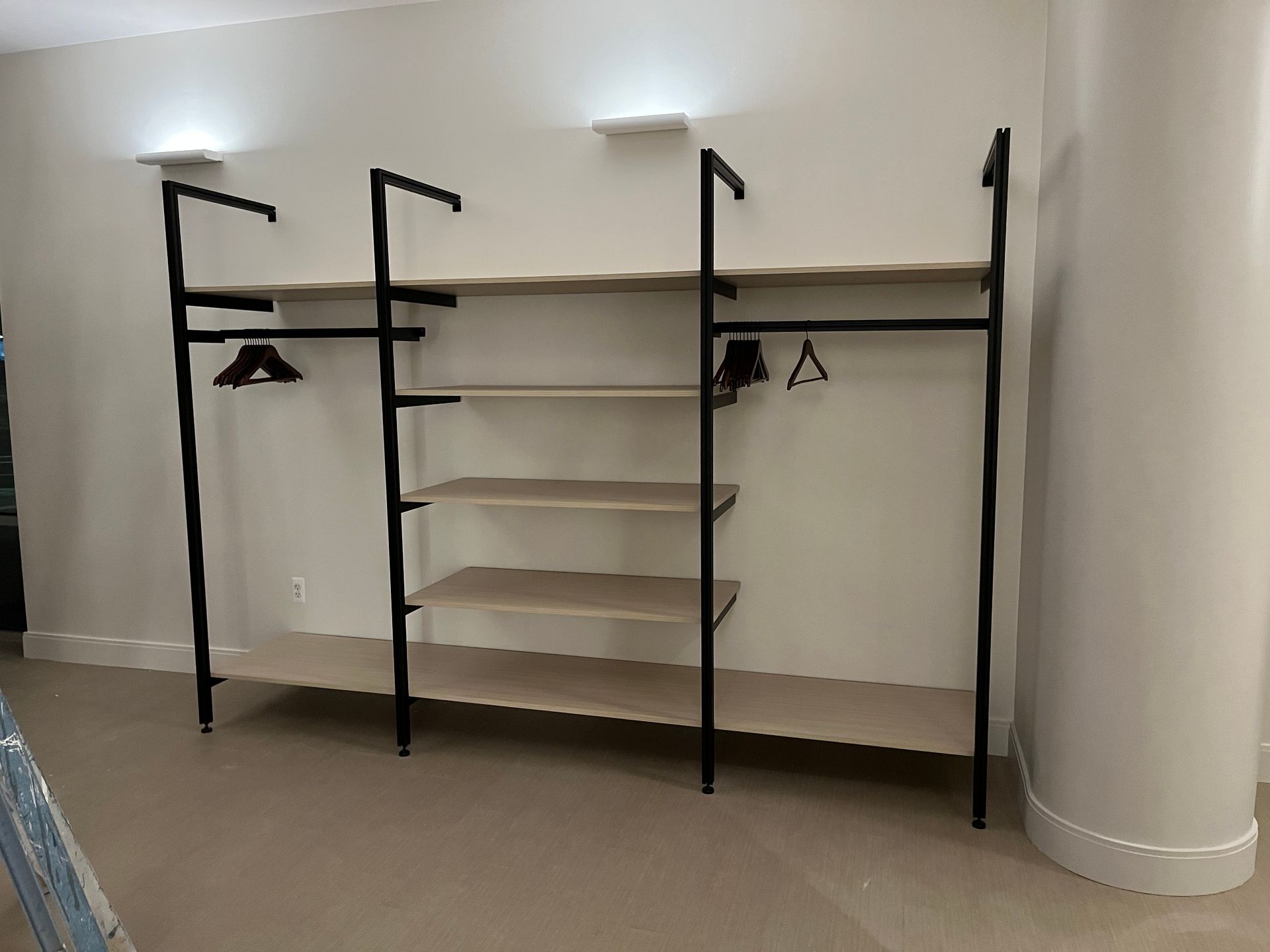 I don't normally do commercial work, but here's something I was offered recently. The hardware is Raxx shelving and all the shelves are made from Tafisa pre-finished melamine board with matching edge banding and 1/8" steel back straps. Also did some floating shelves in a cubby.