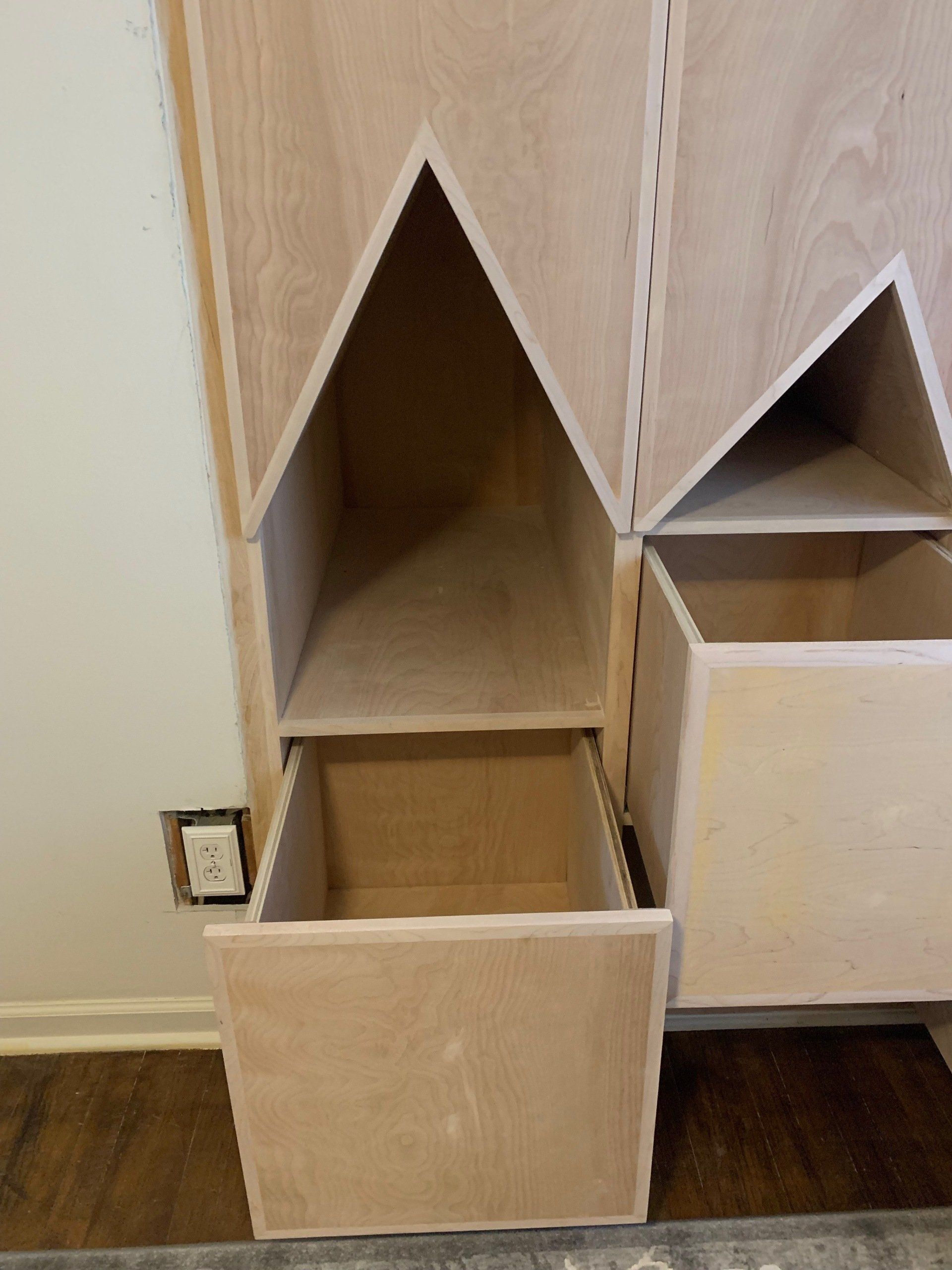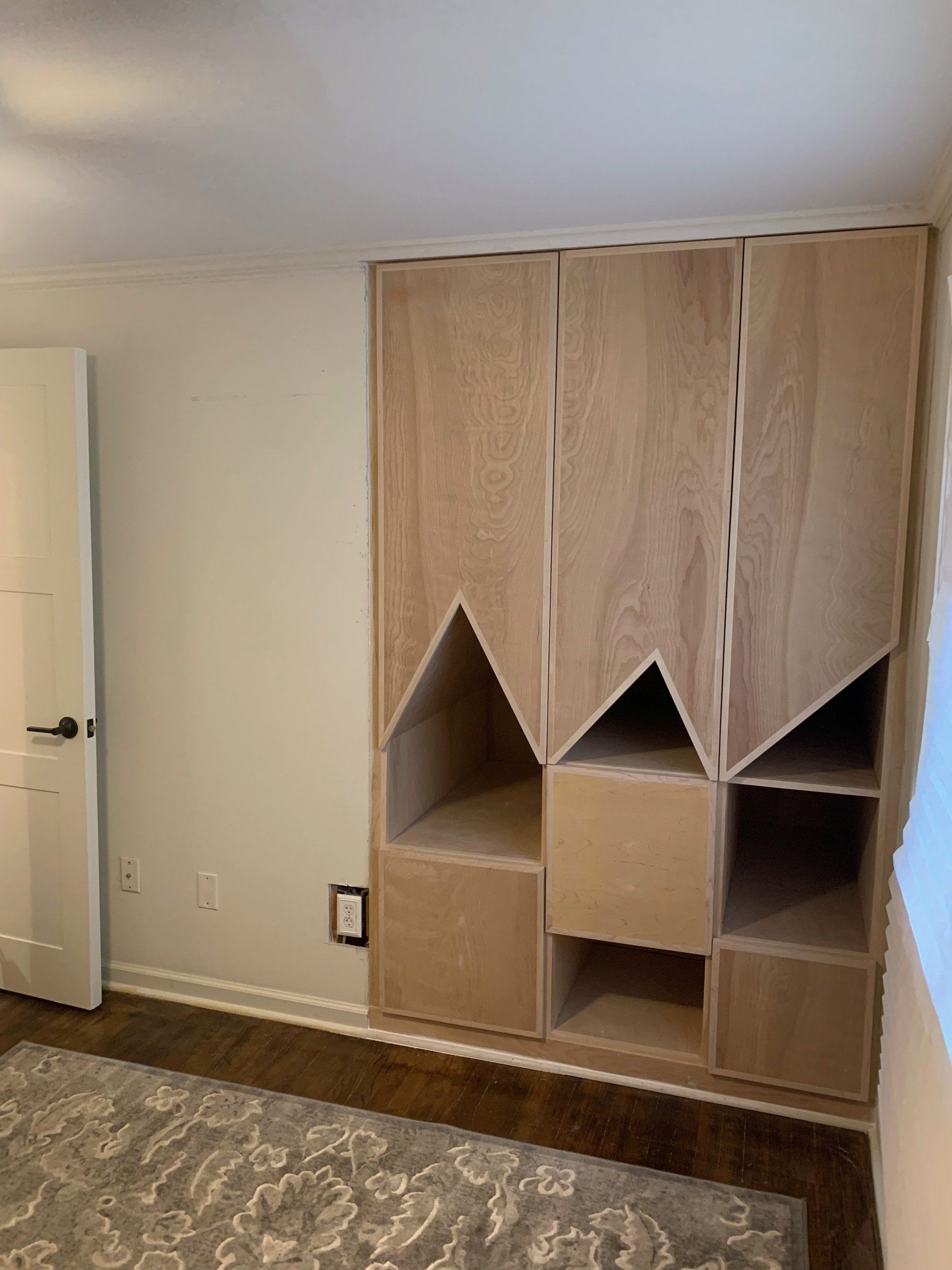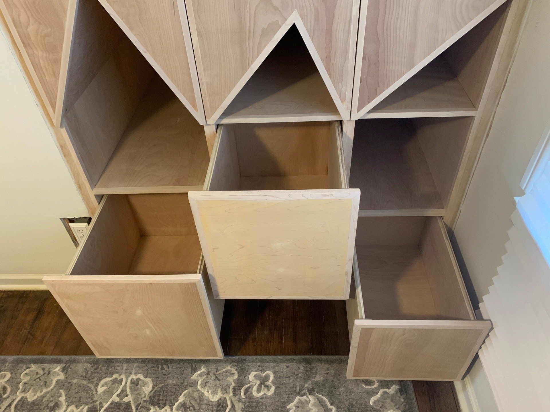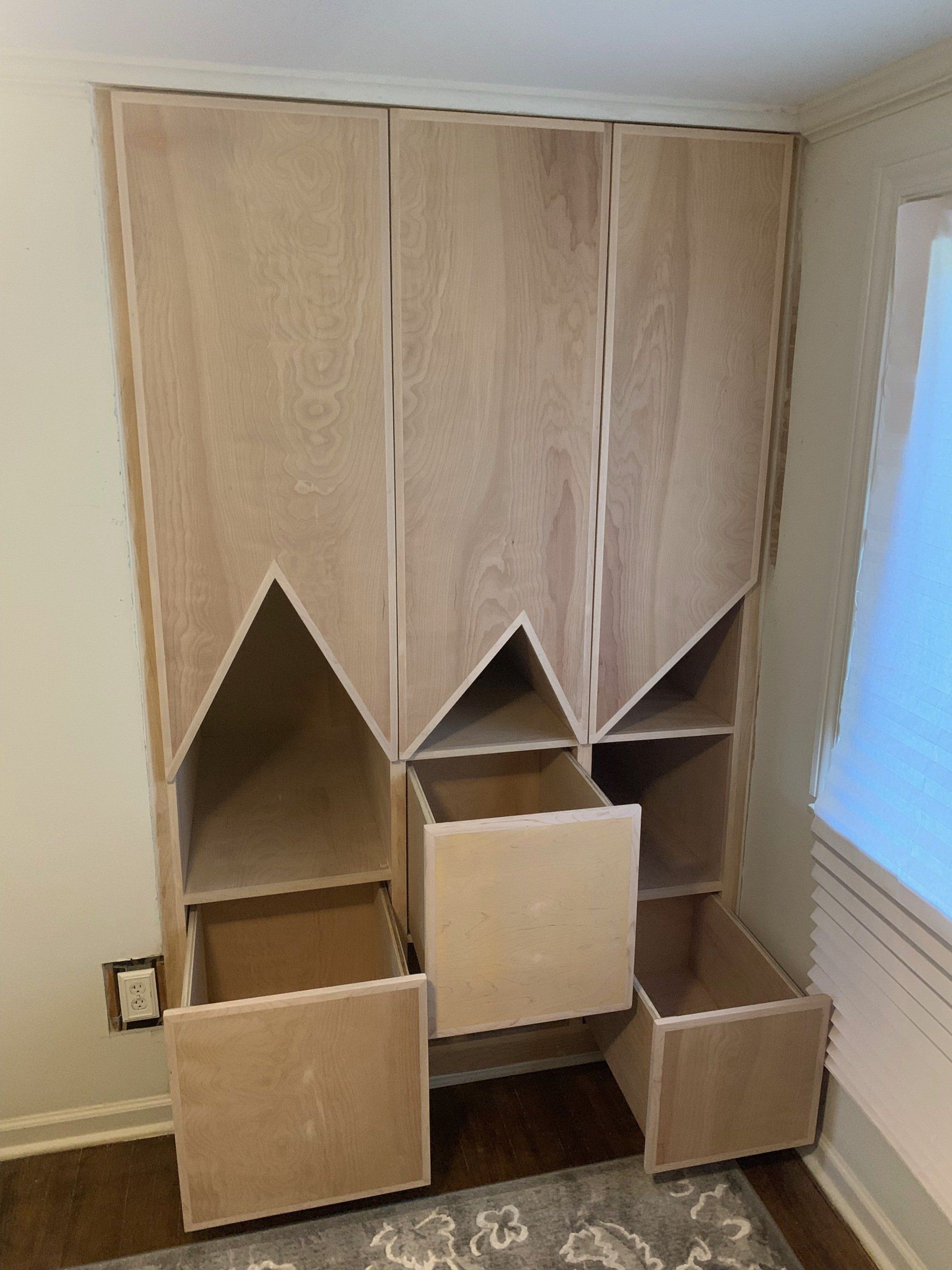 A good friend and coworker of mine sent me a few pictures from pinterest of what these homeowners wanted for their child's bedroom. I went out and took some measurements, drew up a plan and sent off the estimate. These cabinets are 48" deep, 6' long, and 9' tall! Lots of angles, dividers, drawers, etc... but in the end it turned out great. Another happy customer with a one of a kind custom build.
